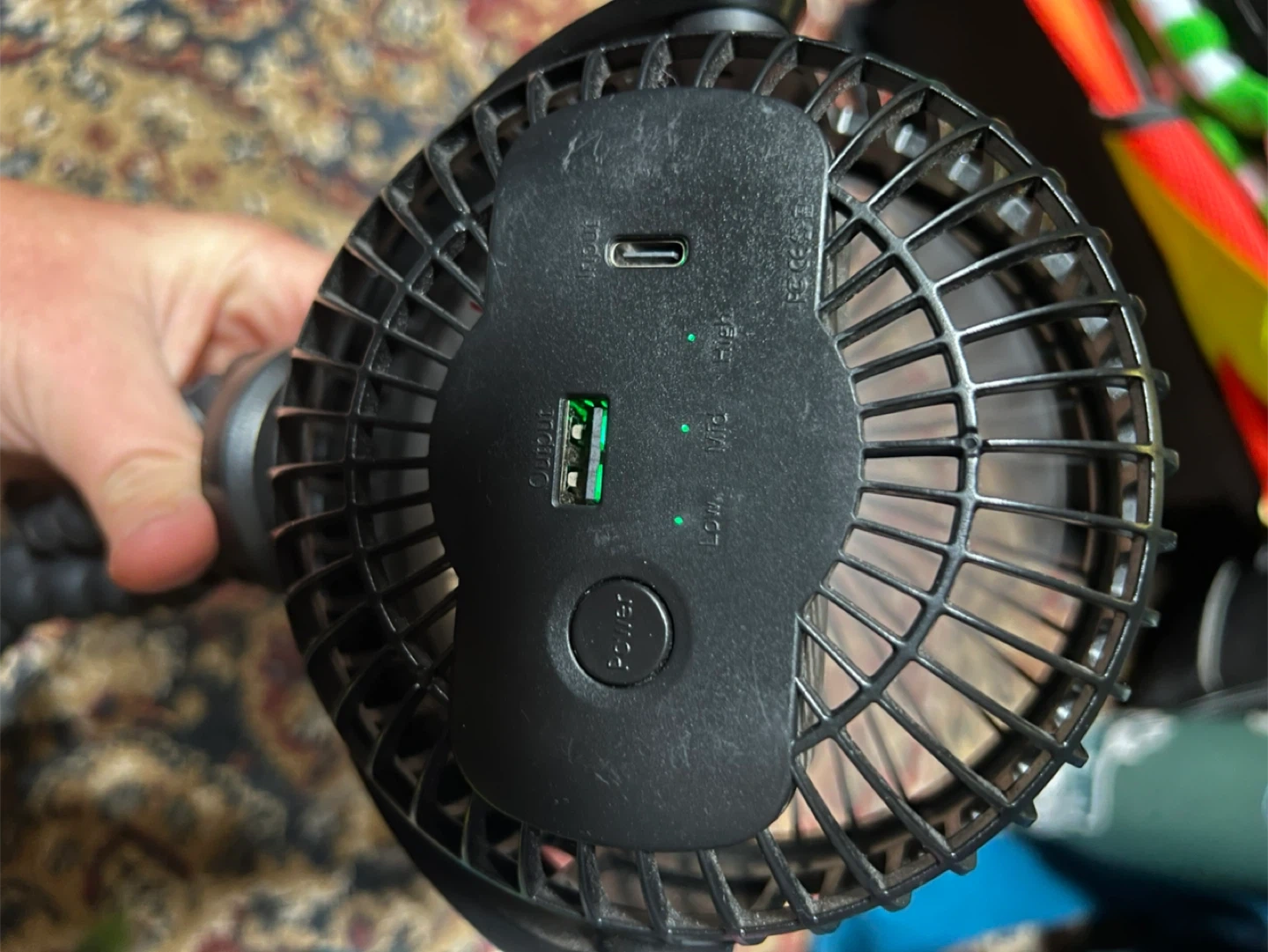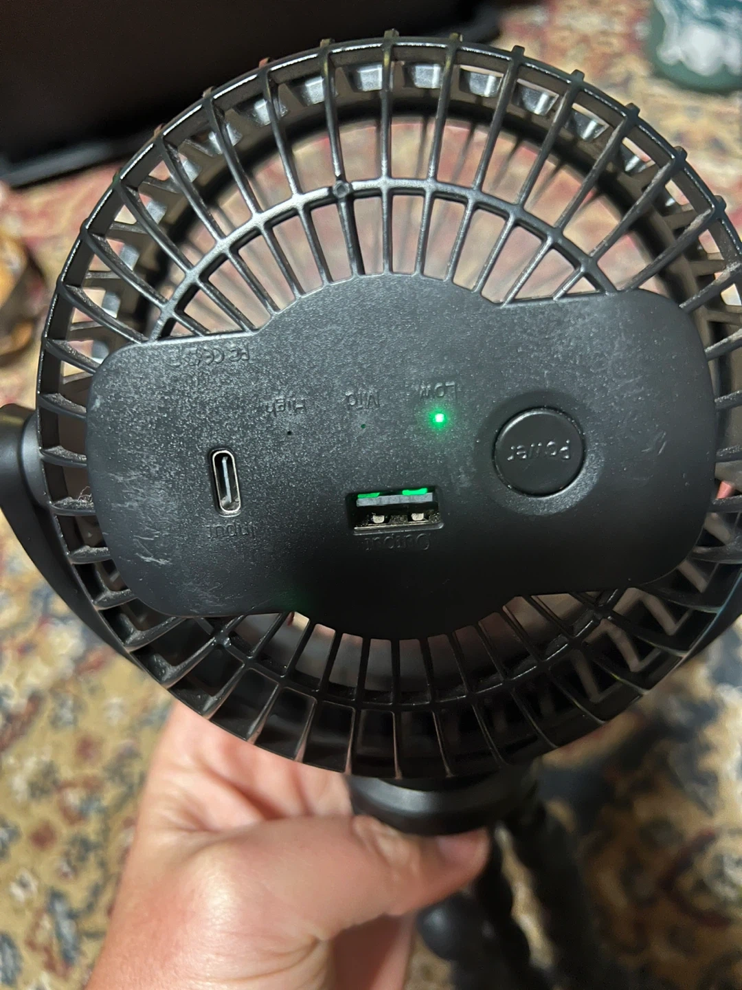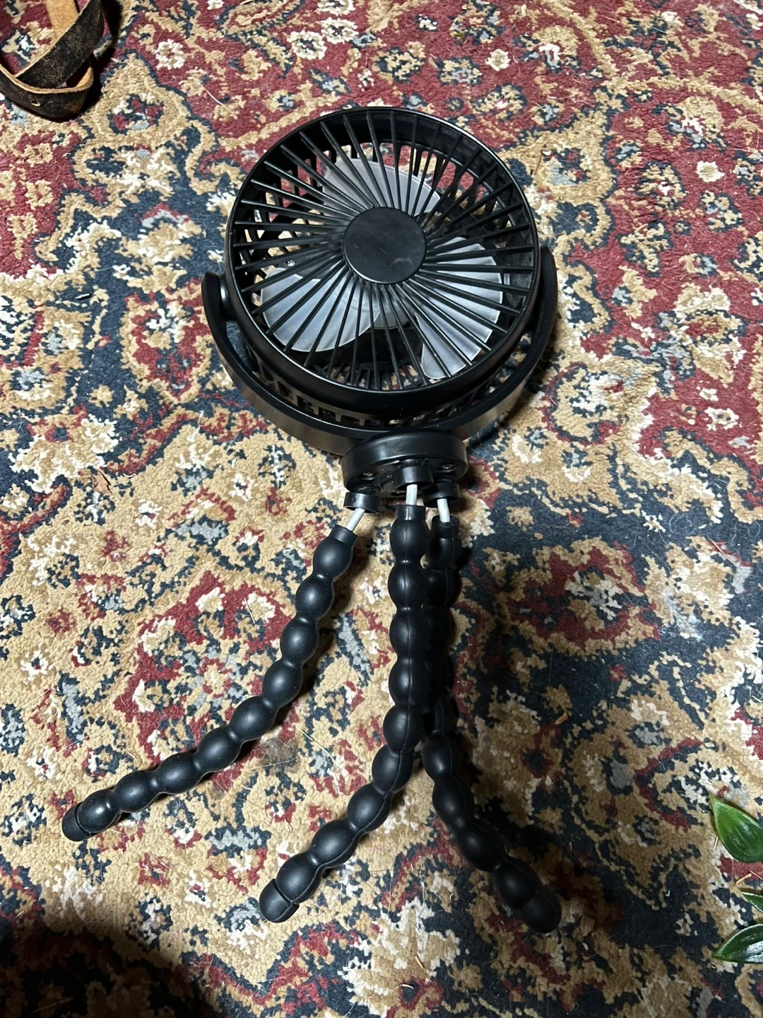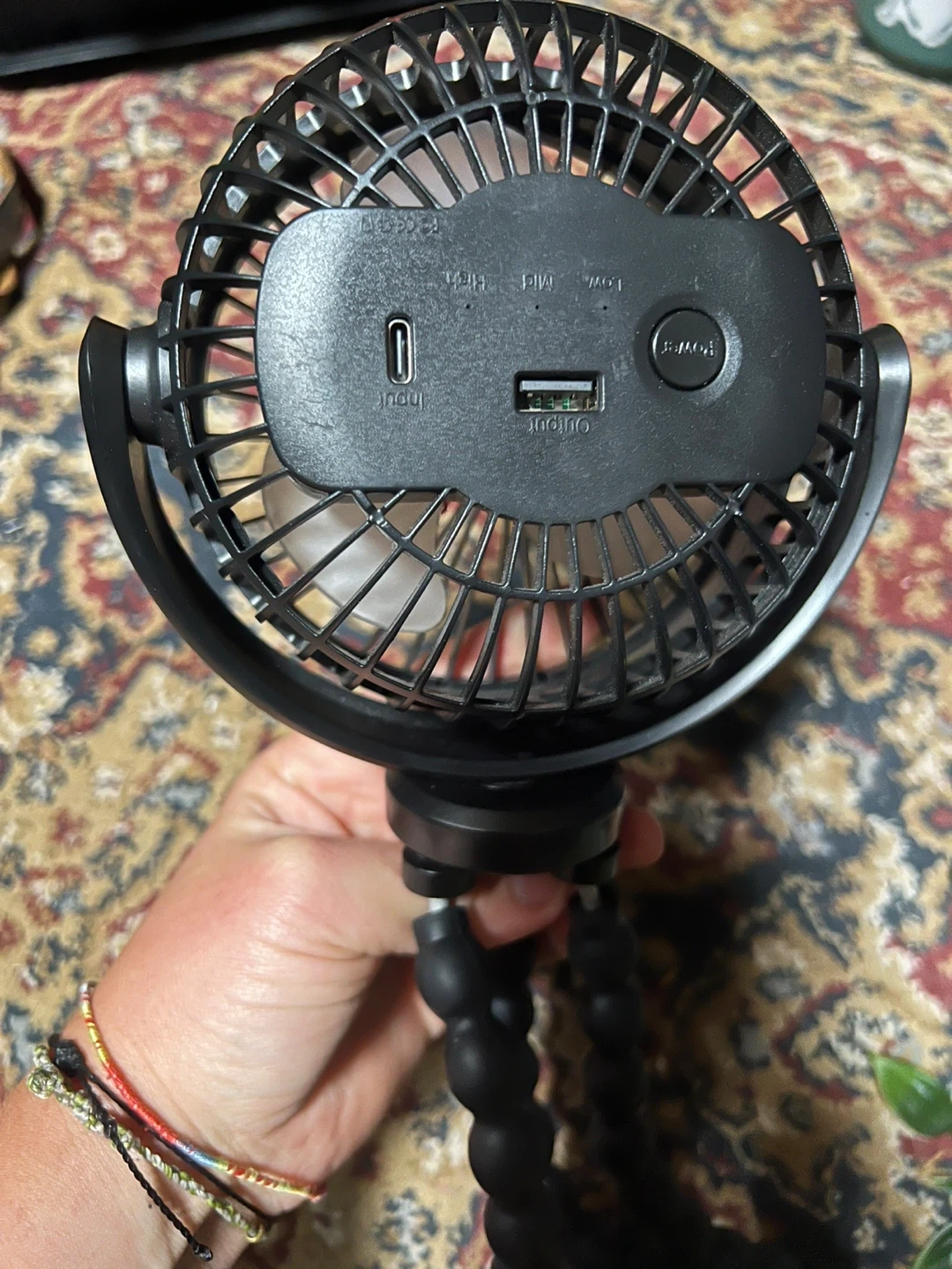 Check out this portable fan with a flexible octopus tripod! It's perfect for keeping cool on the go. It features a USB input and output, and has low, mid, and high settings