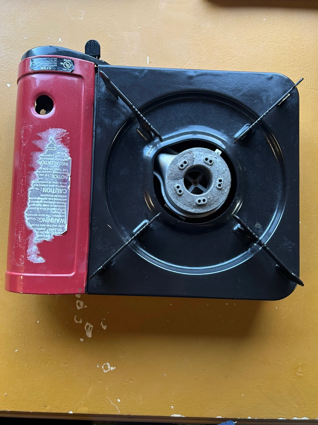 Compact single burner stove. Red and black. Portable design. Used condition. Includes safety warnings. I lend this stove to my friend but he lost the case so I can’t take it anywhere. Other than that is in excellent condition. I try to removed the label to put my last name but I did a poor job that’s why it looks like that.