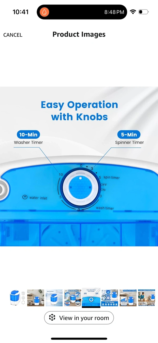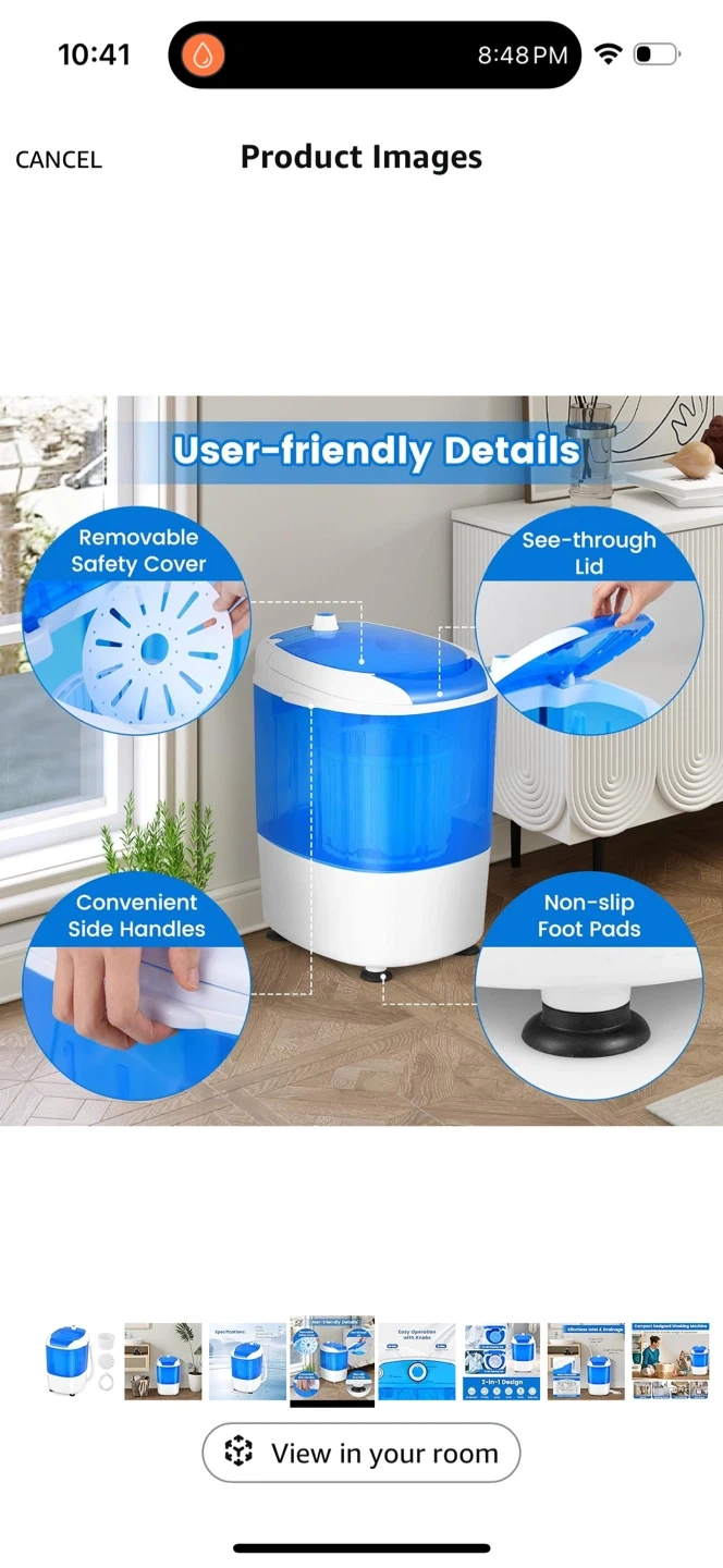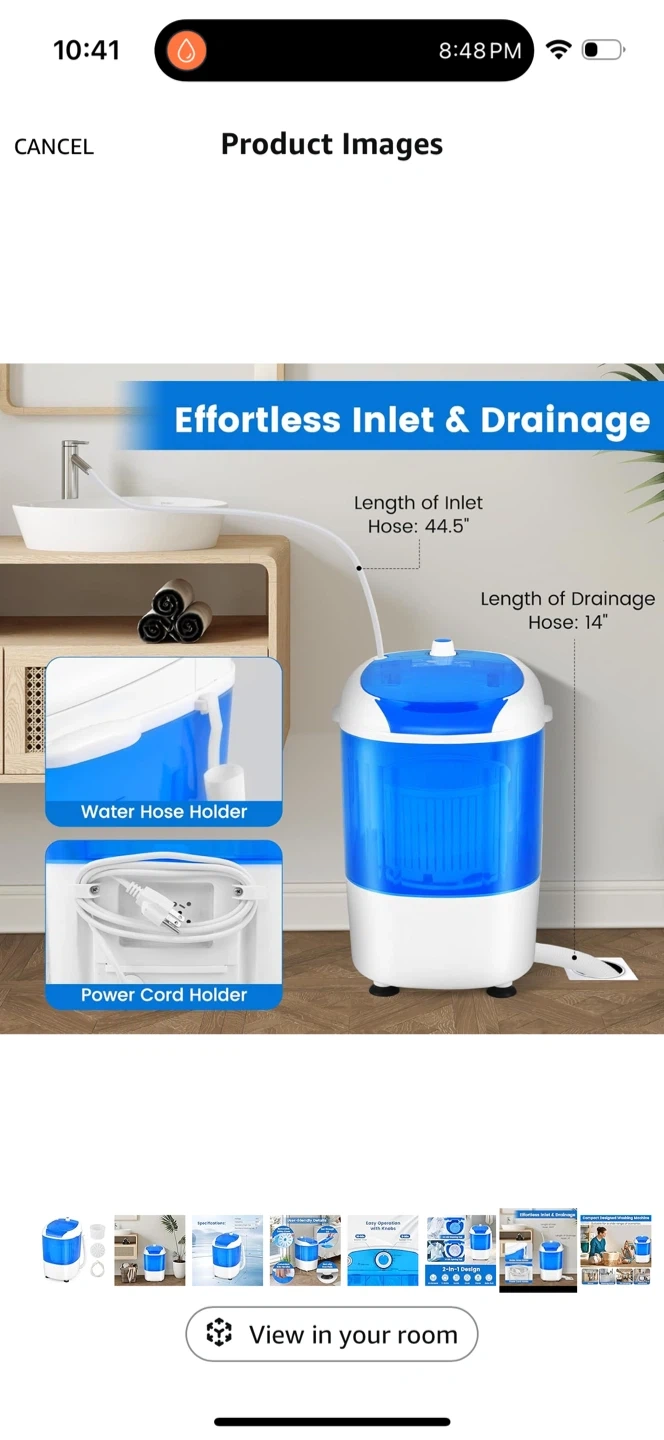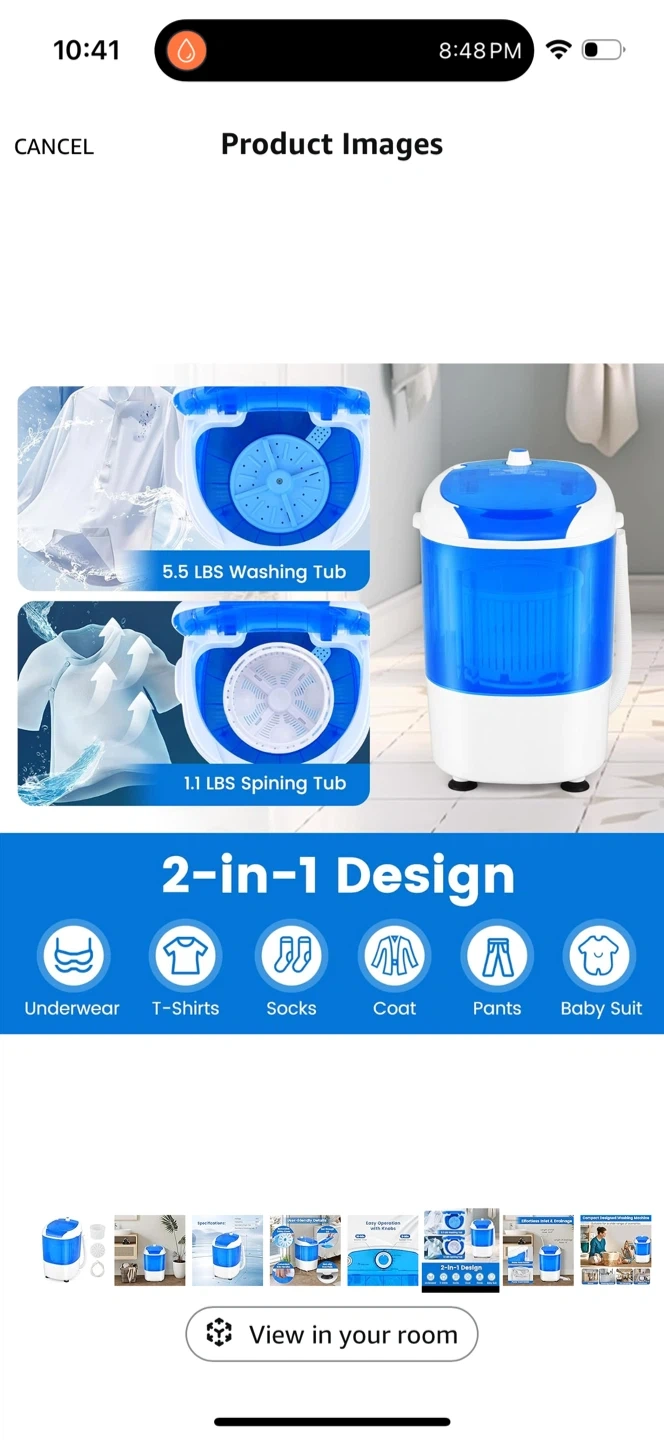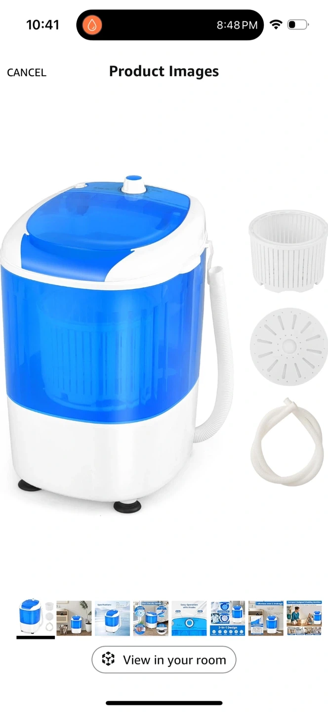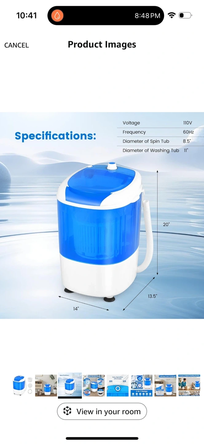 Selling a portable washing machine with a 2-in-1 design! It features a 5.5 lbs washing tub and a 1.1 lbs spinning tub. Key features include: - Easy operation with knobs (10-min washer timer and 5-min spinner timer) - Removable safety cover - See-through lid - Convenient side handles - Non-slip foot pads Dimensions: - Diameter of spin tub: 8.5" - Diameter of washing tub: 11" - Height: 20" - Width: 14" - Depth: 13.5"