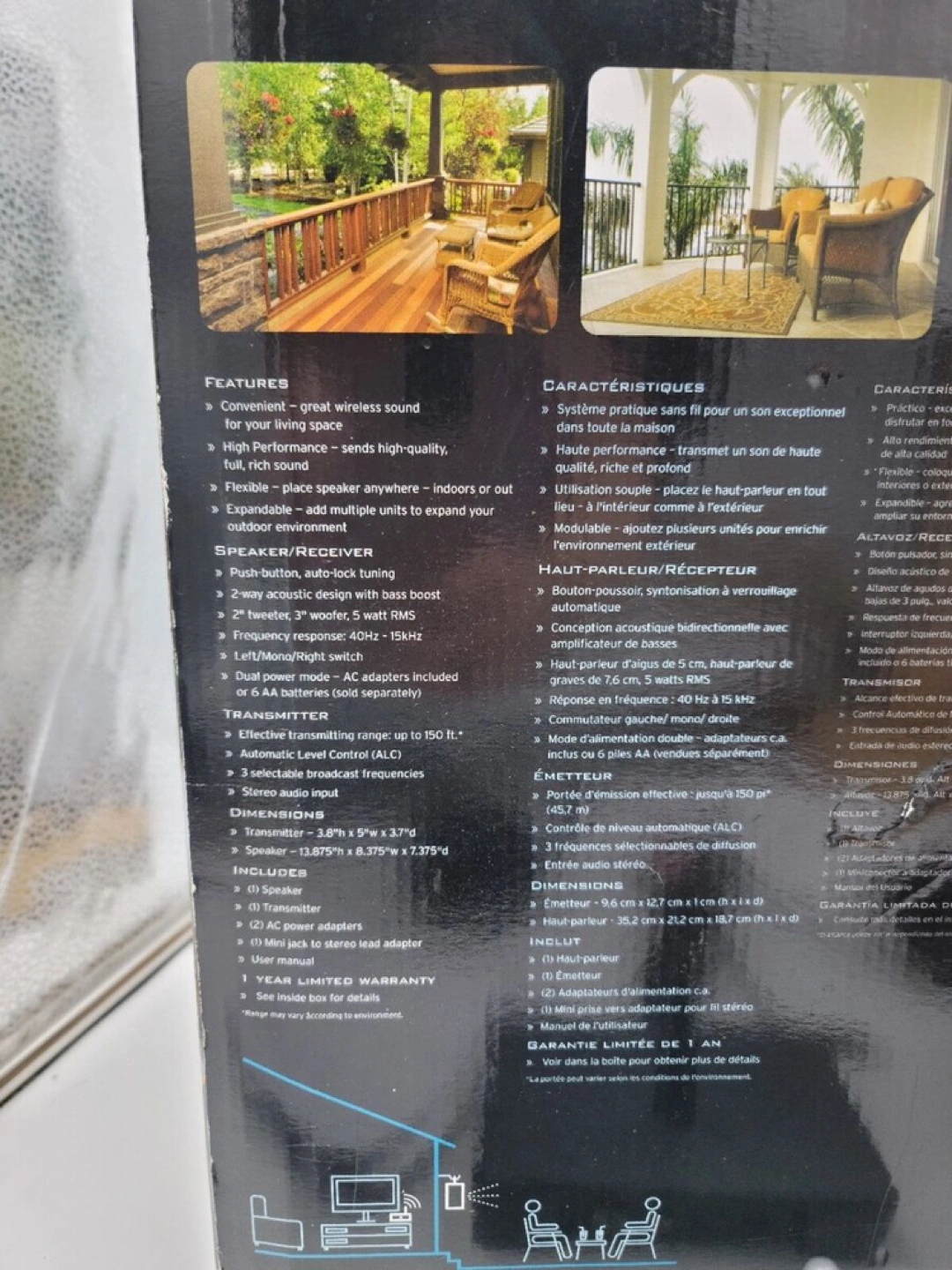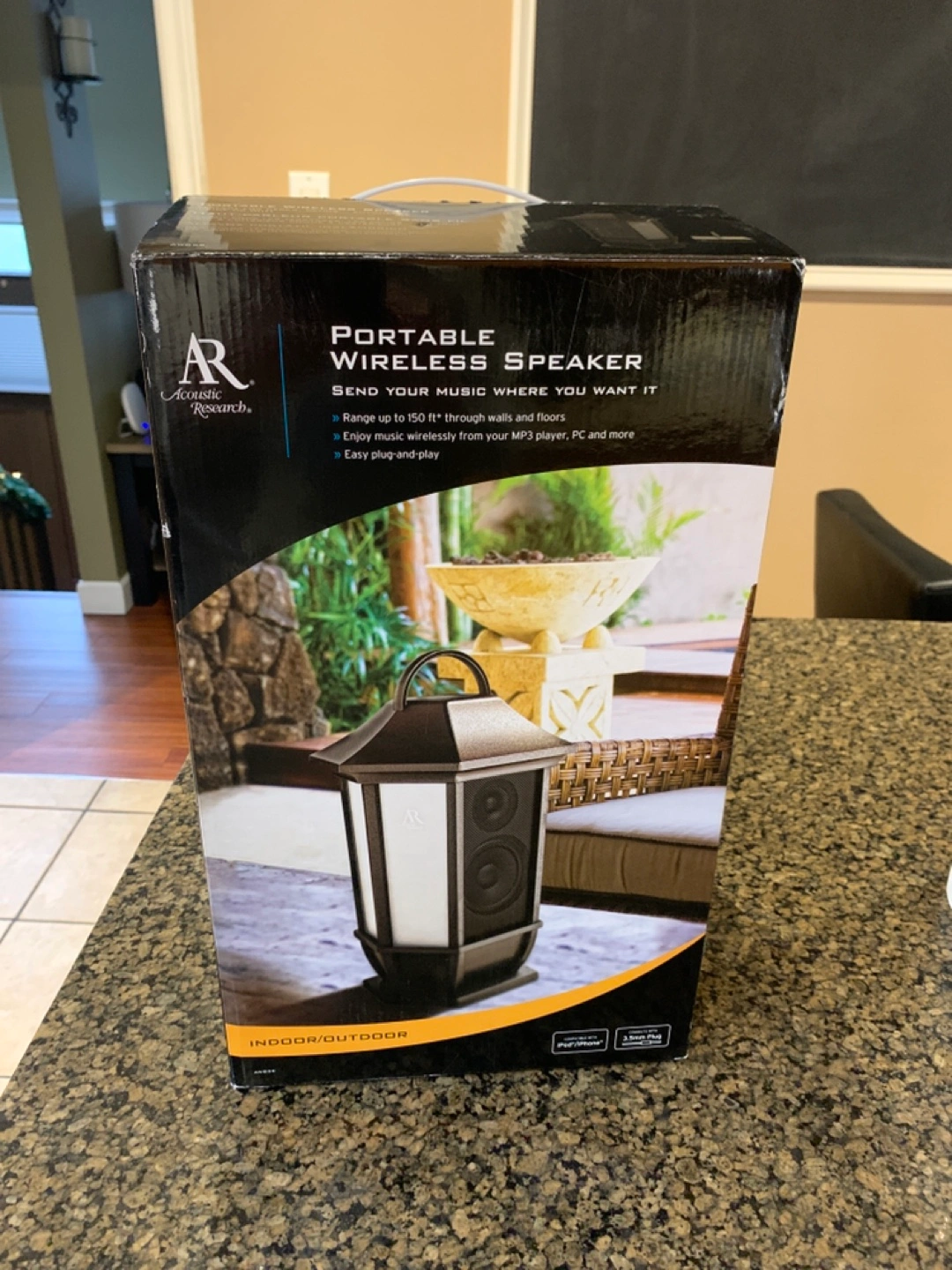 Acoustic Research Portable wireless speaker, indoor/outdoor. Includes transmitter, user manual and accessories.