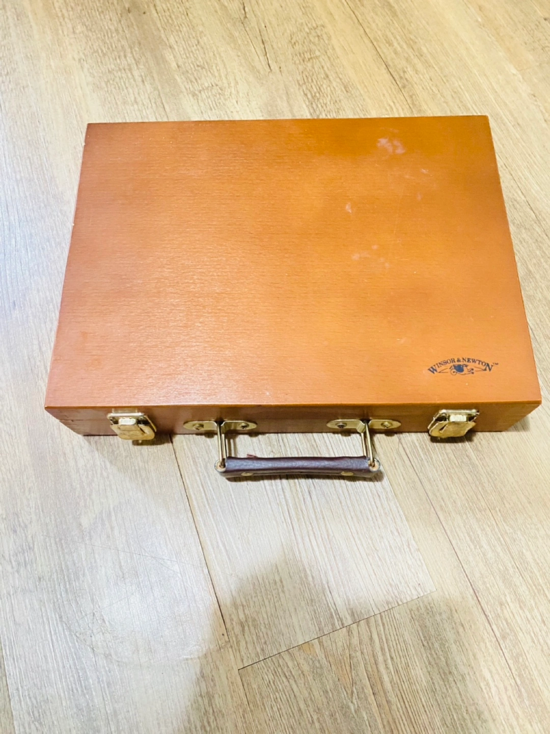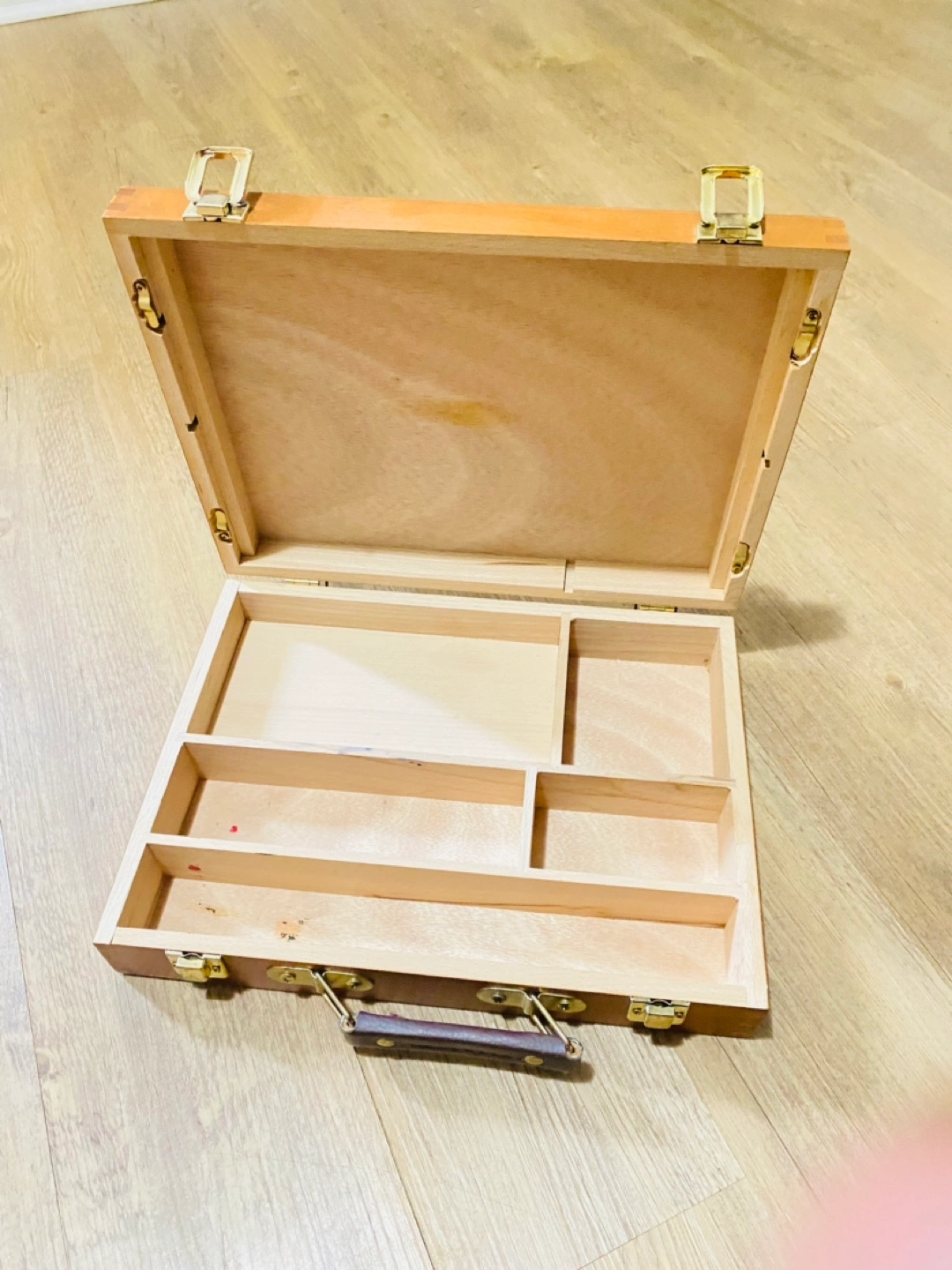 Wooden carrying case. Interior compartments. Perfect for storing and transporting art supplies. Brown exterior. Brass clasps and leather handle.