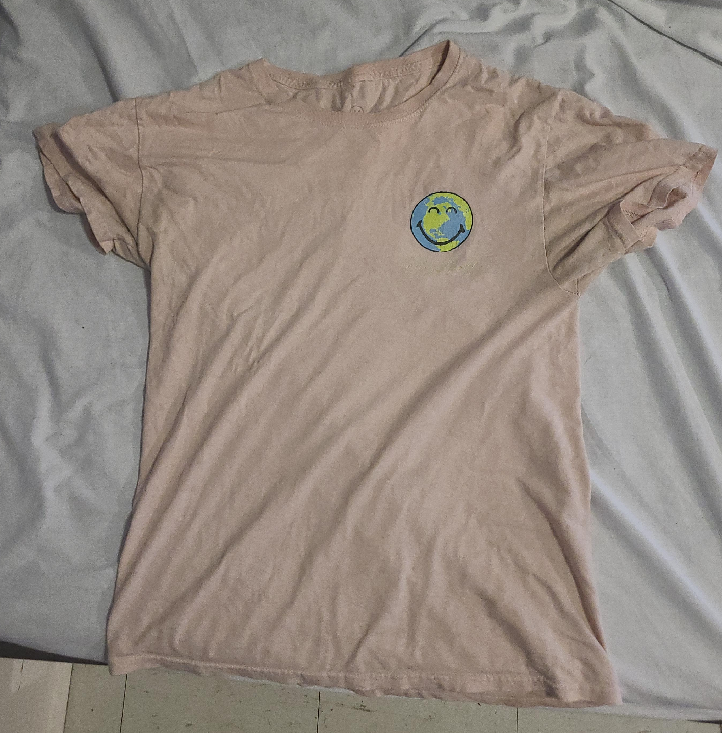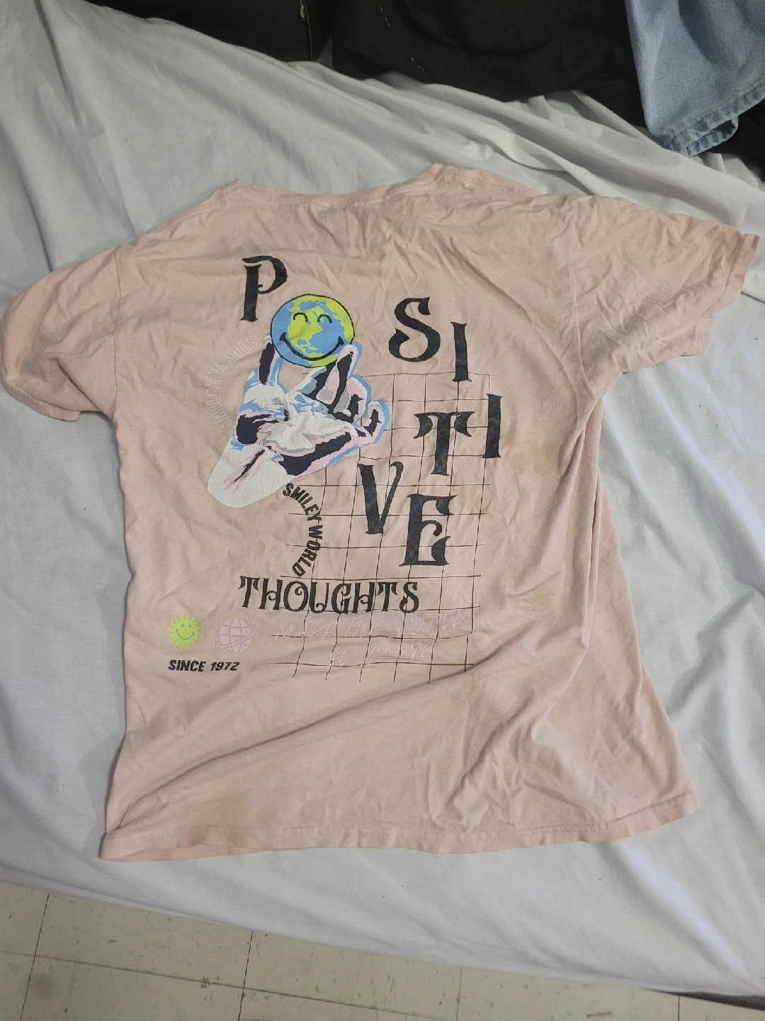 Cute Positive Thoughts graphic tee in a light pink colour! The back has a large graphic with a smiley face globe and the words 'Positive Thoughts Since 1972'. The front has a smaller, similar graphic on the chest. Perfect for casual wear!