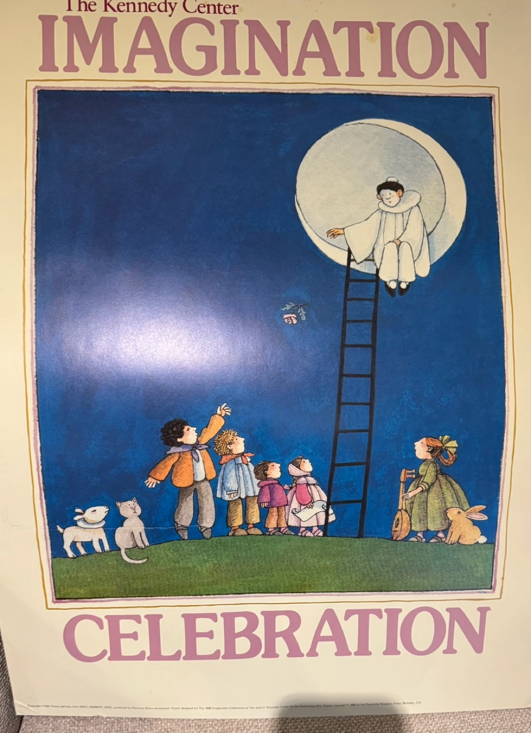 Charming poster from The Kennedy Center's 1988 Imagination Celebration of The Arts featuring a harlequin clown on a crescent moon. 18 x 24 Edges are a little bent, but wouldn’t be noticed if framed or mounted. A beautiful addition to your children’s room or playroom.