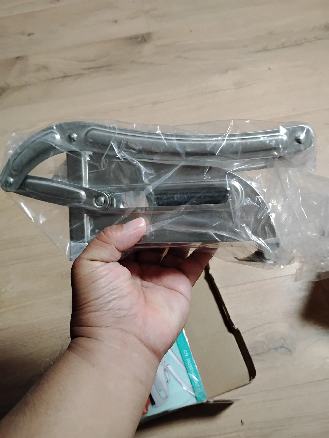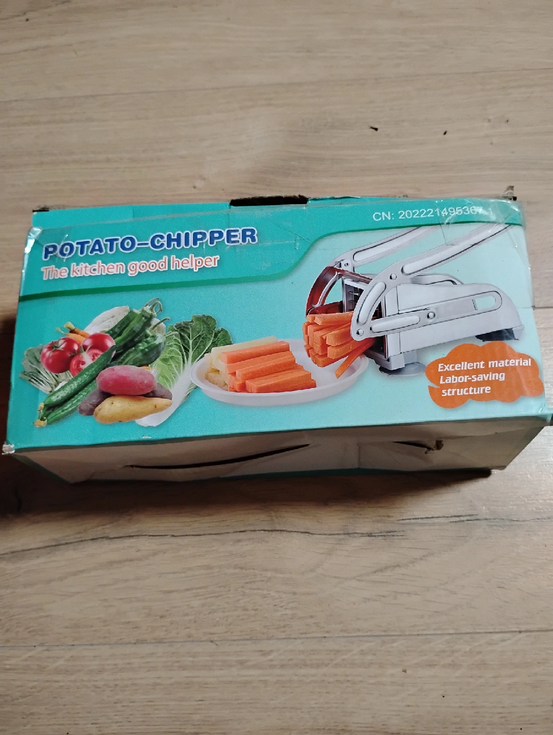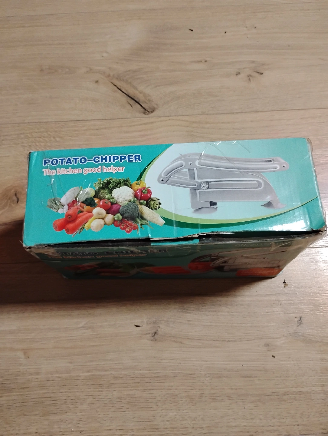 I'm selling a potato chipper, described on the box as 'The kitchen good helper'! It's simple and easy to use, owing to the large base and long lever arm. The stripper should be placed horizontally and vertically with the object for best results. It occupies little cupboard space when placed on end. The box is included!