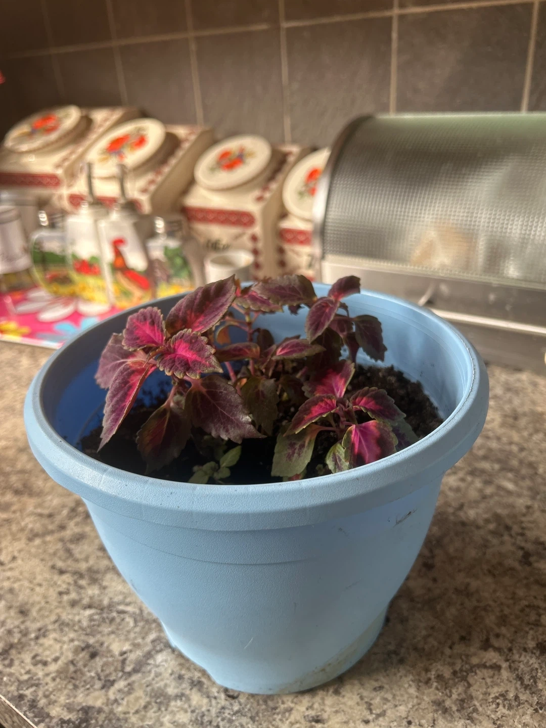 Selling a healthy coleus plant in a light blue pot. It has vibrant red and green leaves, perfect for adding a pop of colour to your home or garden. Ready to go to a new home!
