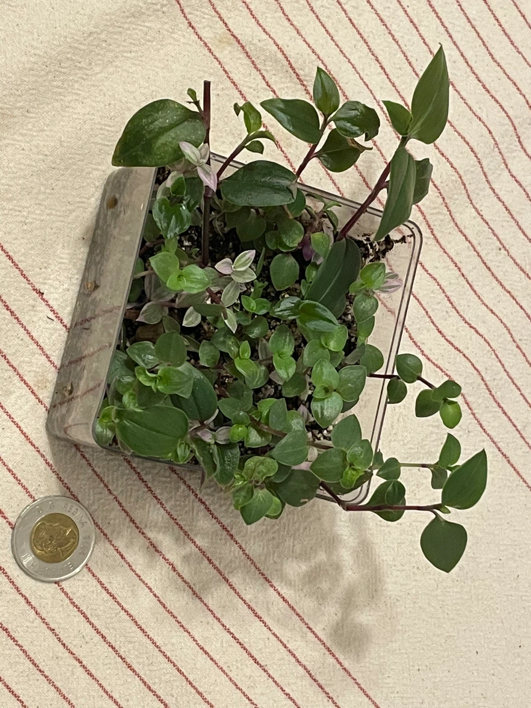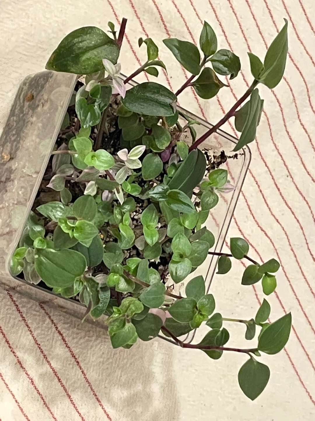 Selling a lovely Tradescantia plant in a clear square pot! It's got a mix of green and pinkish-white leaves. Perfect for adding a touch of greenery to your home or office