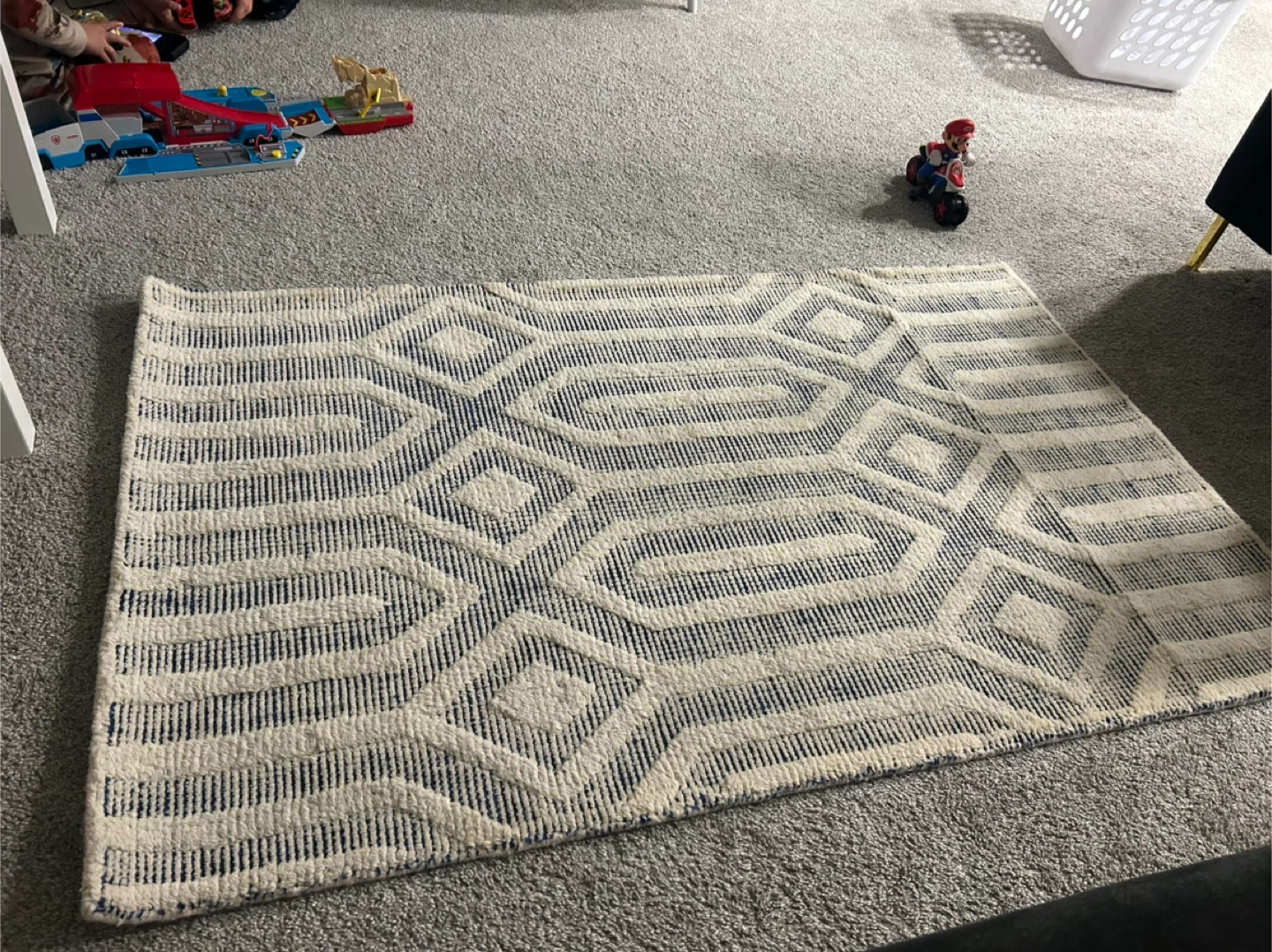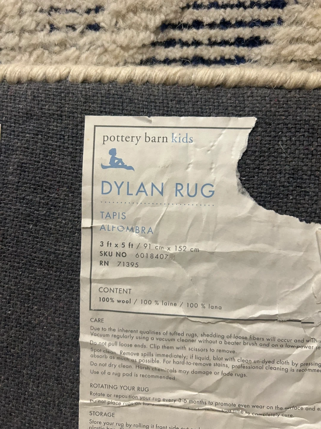Selling a Pottery Barn Kids Dylan Rug. It's in great condition and ready for a new home! It measures 3 ft x 5 ft or 91 cm x 152 cm. The rug is made of 100% wool.