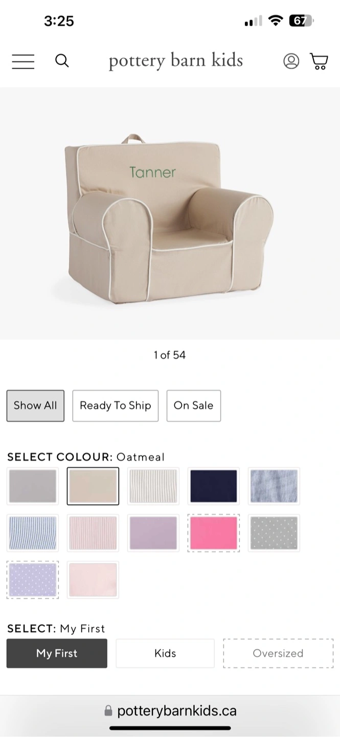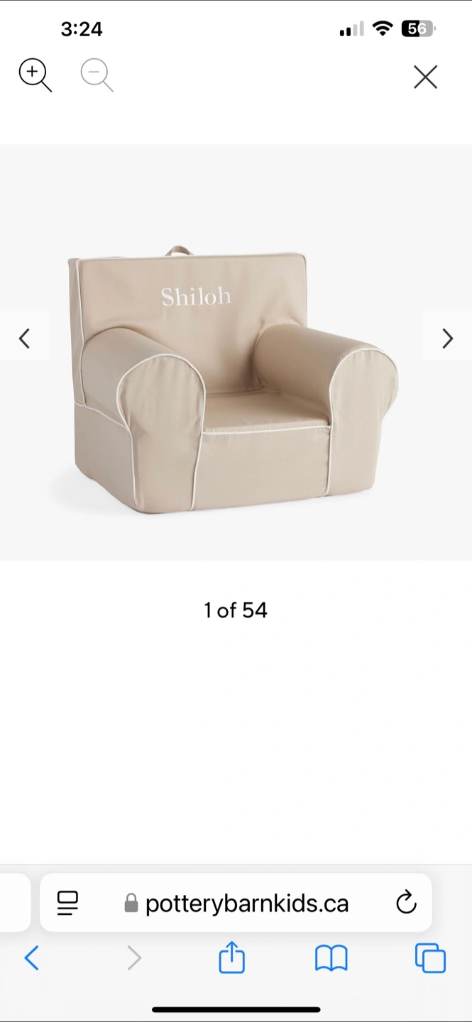 Adorable child-sized chair. Perfect for little ones. Oatmeal coloured fabric. Personalized name : SOFIA White piping DIMENSIONS Kids Anywhere Chair® Overall: 25.25" wide x 21" deep x 22.5" high Seat: 13" wide x 15.5" deep Seat height above floor: 8.5" Weight: 6.75 lbs CARE Slipcover To clean, remove insert. Wash slipcover in cold water by itself. Only use non-chlorine bleach, if needed. Tumble dry on low heat, remove promptly. Warm iron, as needed. Insert Spot clean with damp white cloth; blot to remove excess water. Air dry. Do not wash or dry clean.