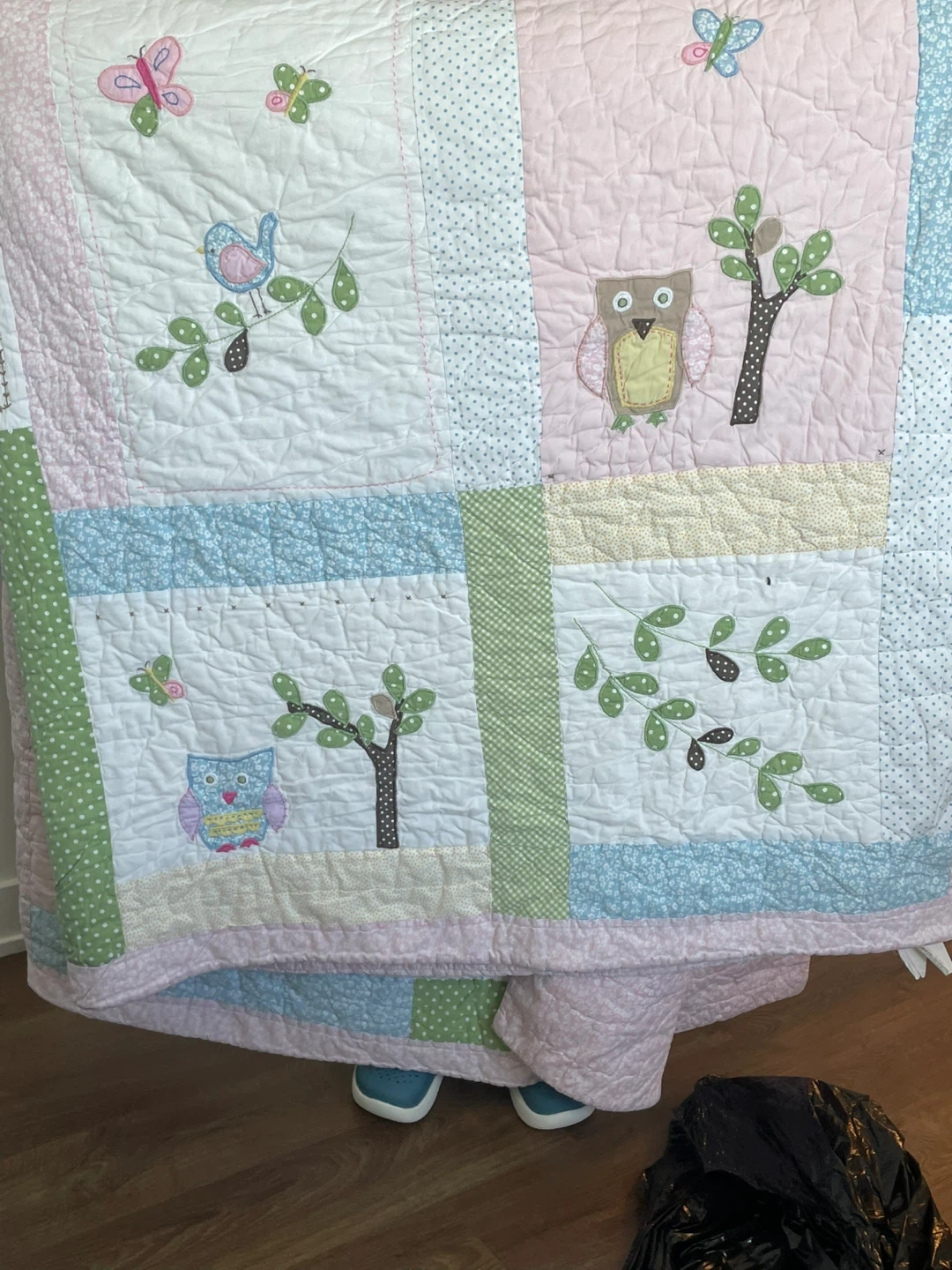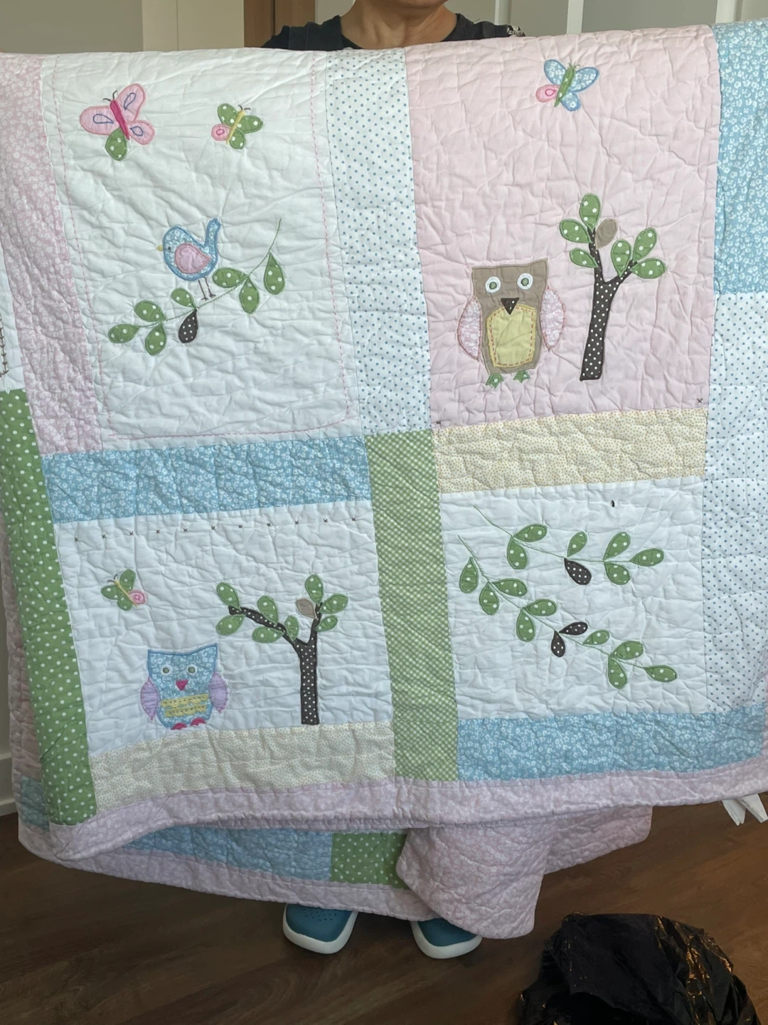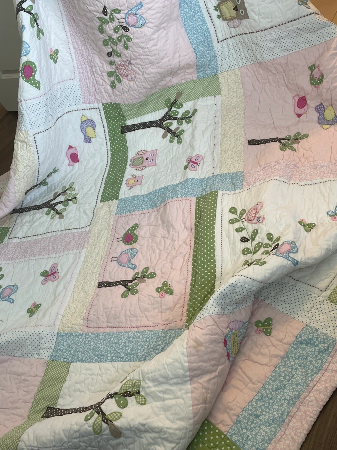 Selling a Pottery Barn Kids quilt! Used only a handful times. This quilt is made of 100% cotton fibre. It features a charming design with butterflies, birds, and owls on a patchwork of pink, white, blue, and green squares. It's in new condition and ready to add a cozy touch to any child's room
