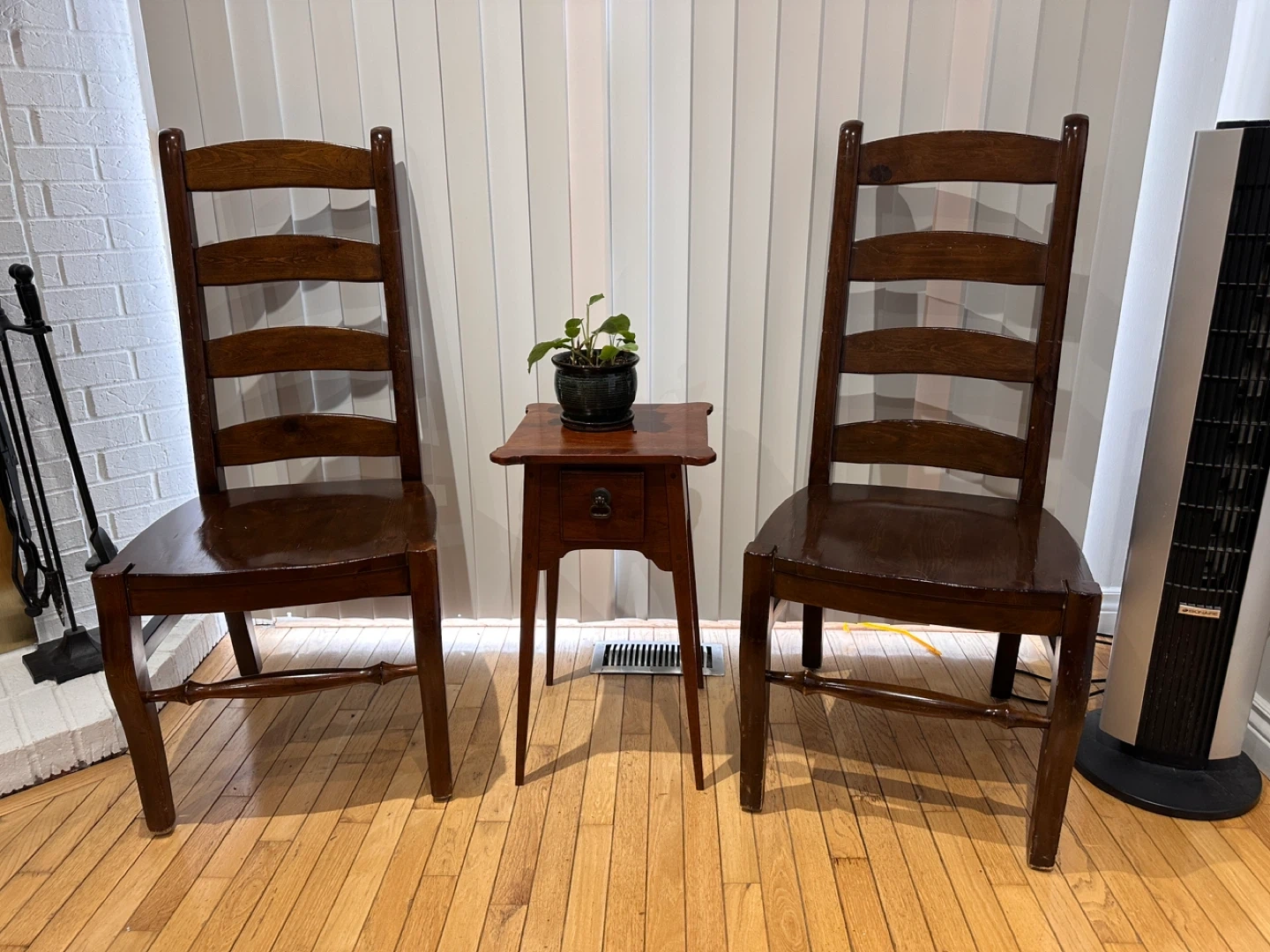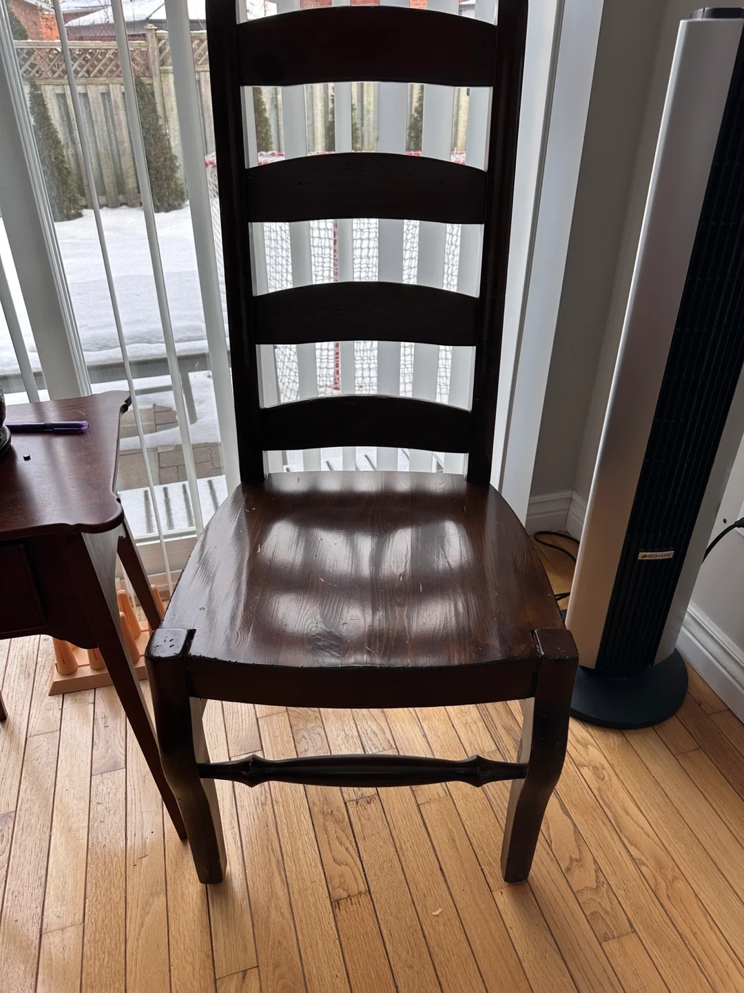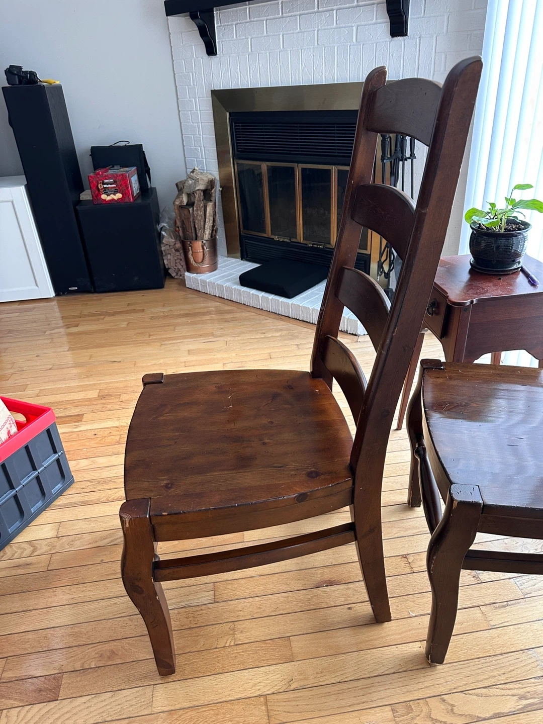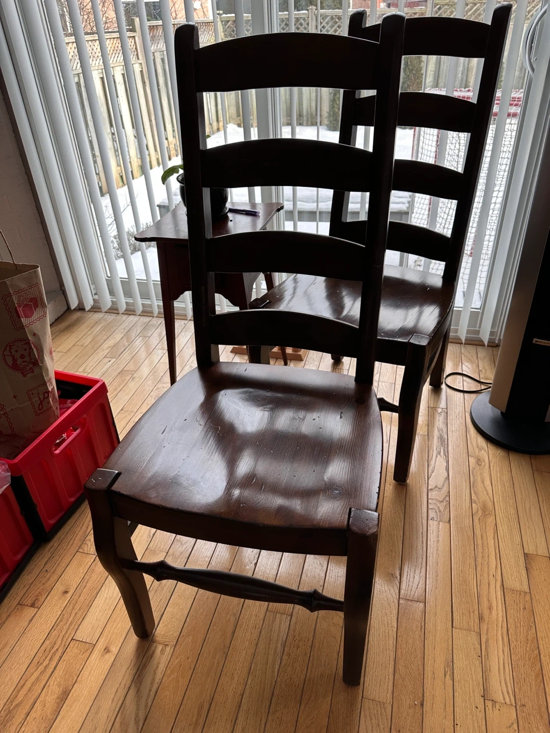 Selling a set of two wooden dining chairs. They have a classic design and are in good condition. Perfect for adding a touch of warmth to your dining space! Table not included.