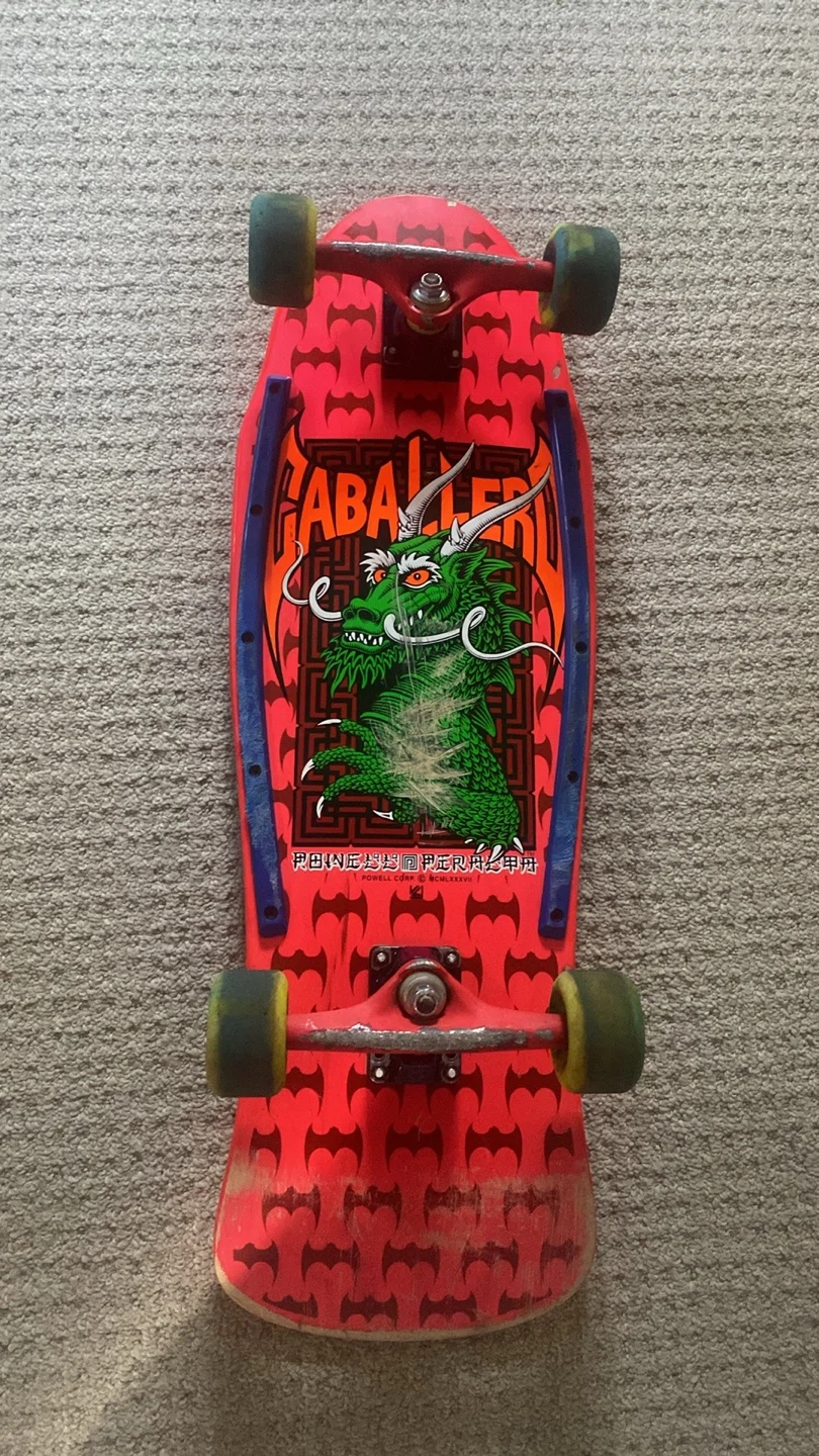 Selling a used Powell Peralta Caballero Dragon skateboard. It has a pink deck with a green dragon graphic on top and a skull logo on the bottom. Good condition for its age, ready to ride!