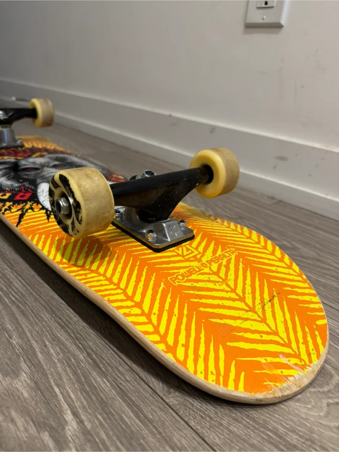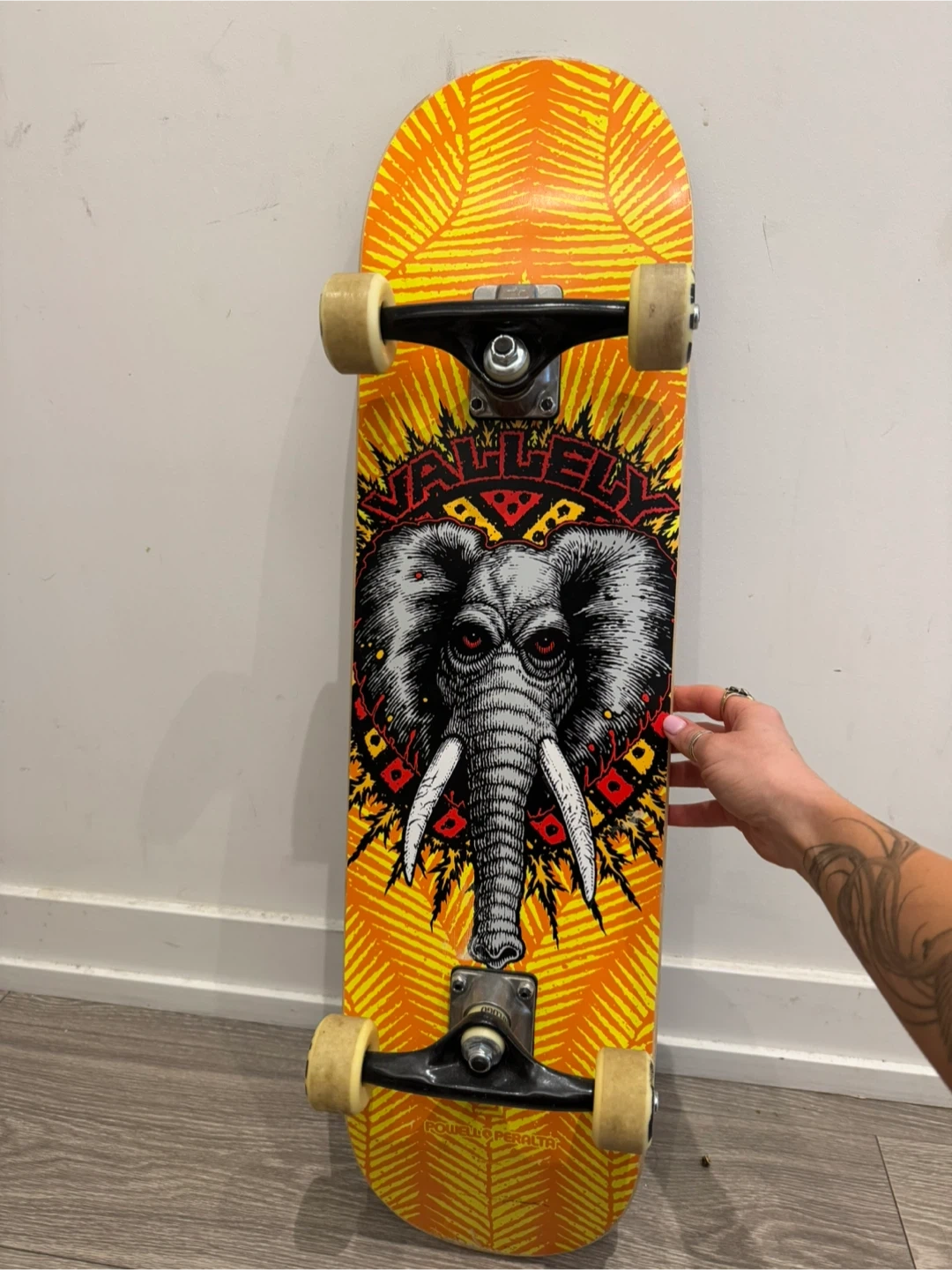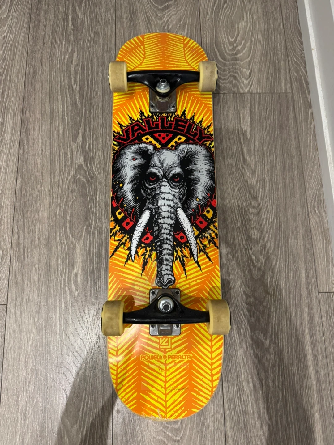 Selling a Powell Peralta skateboard with the classic Vallely Elephant design. The deck is orange and yellow with a black grip tape on top. It shows some signs of use, but it's still in good condition for riding!