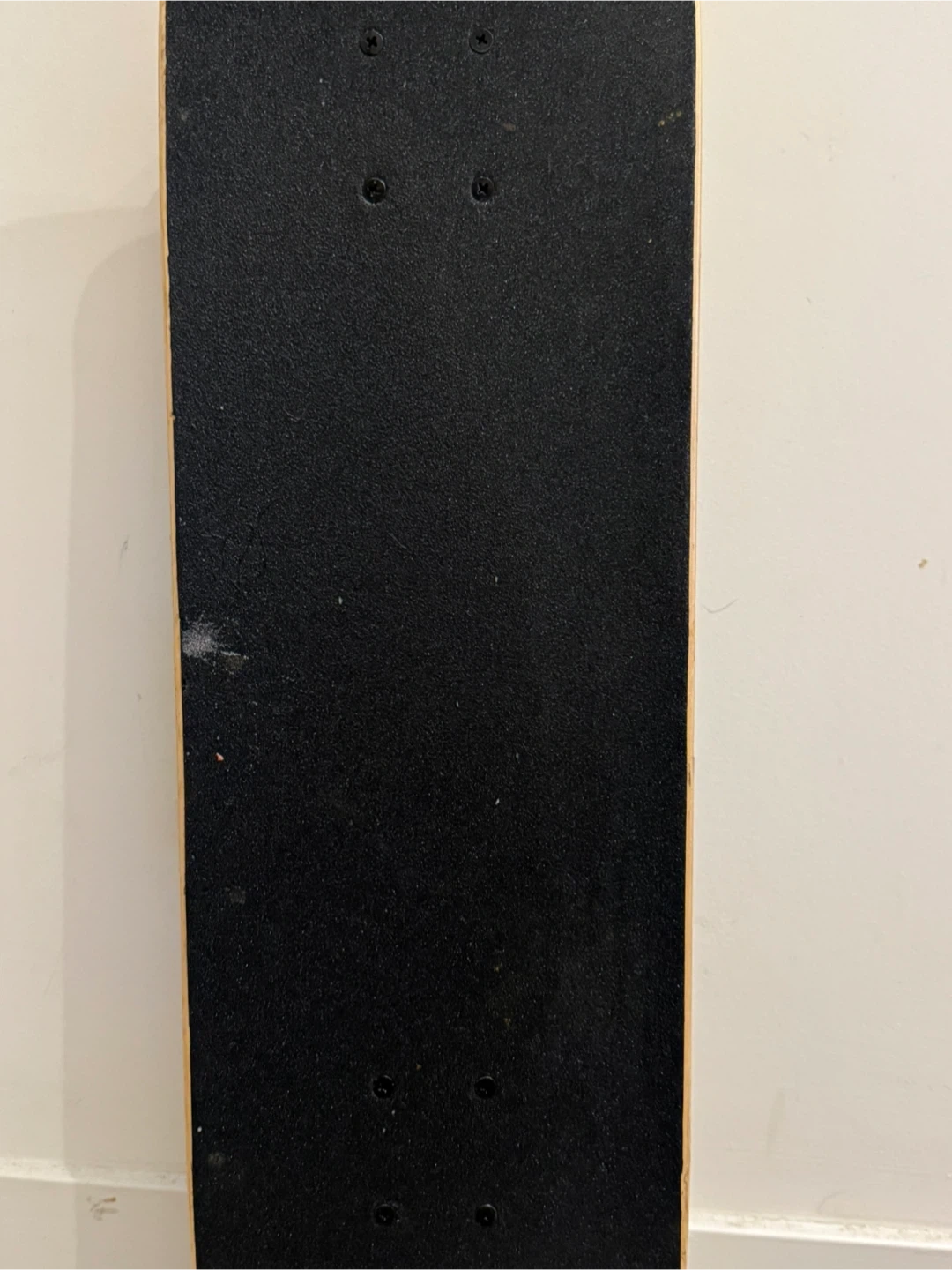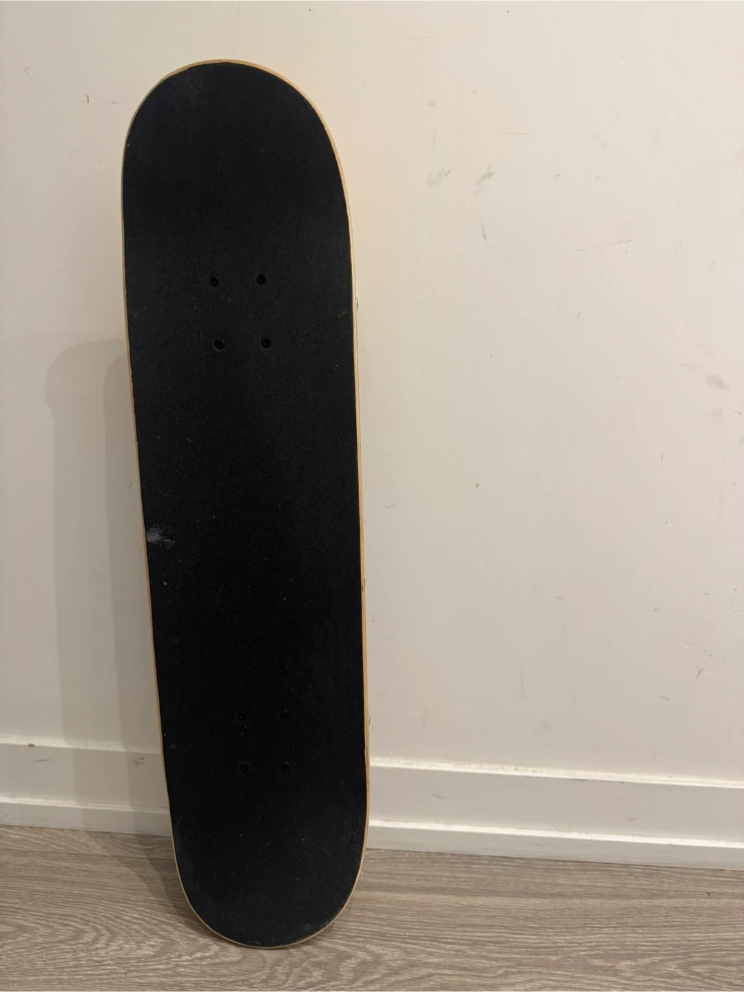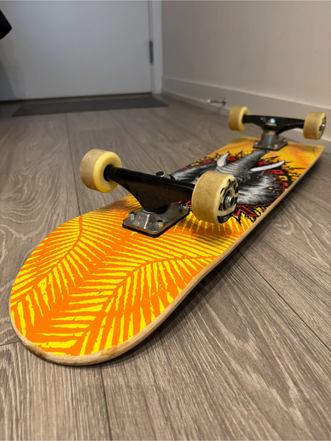 Selling a Powell Peralta skateboard with the classic Vallely Elephant design. The deck is orange and yellow with a black grip tape on top. It shows some signs of use, but it's still in good condition for riding!