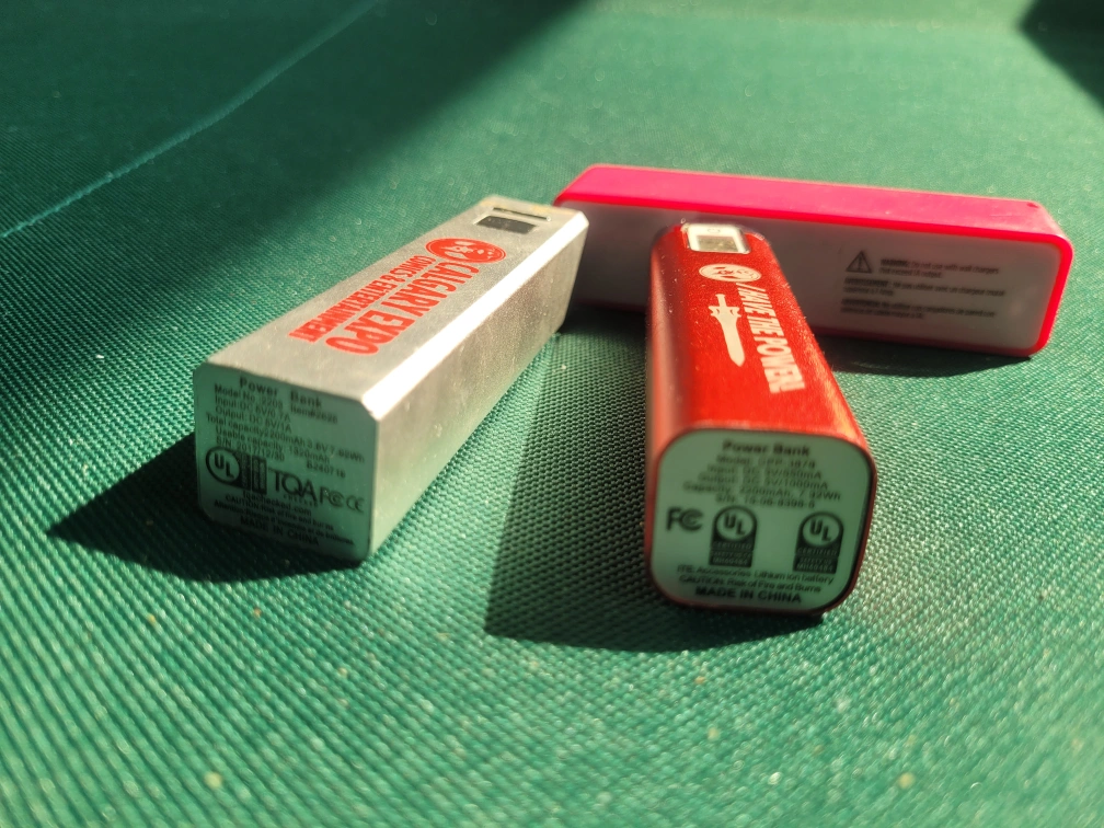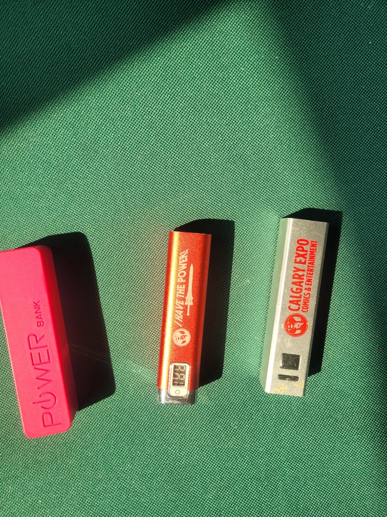 Selling these power bank chargers. They are great for on the go charging. One is a Calgary Expo charger, and another says 'I have the power!'