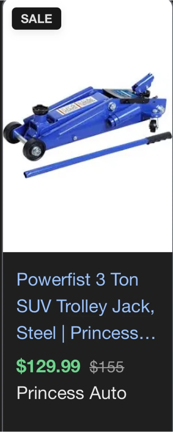 Selling a Power Fist 3 Ton SUV Trolley Jack. It's in good working condition and ready to help with your vehicle maintenance needs. Originally bought for $129.99 at Princess Auto.