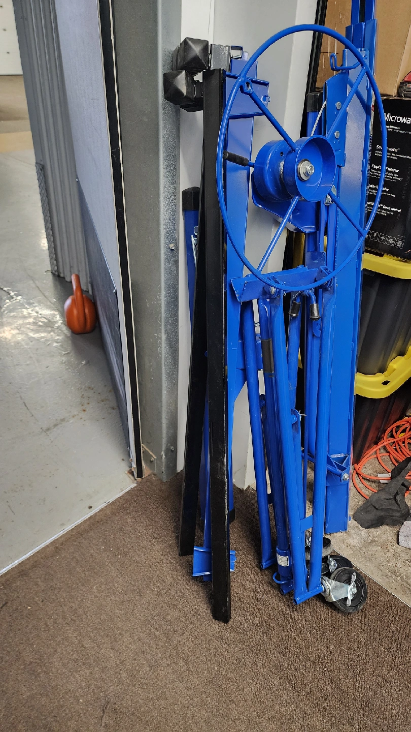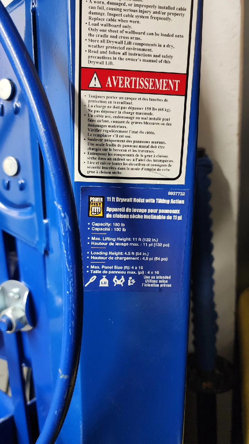 Selling a Power Pro 11 ft drywall lift with tilting action. - Capacity: 150 lb - Max Lifting Height: 11 ft (132 in) - Loading Height: 4.5 ft (54 in) - Max Panel Size (ft): 4 x 16 It is in good condition and ready to use