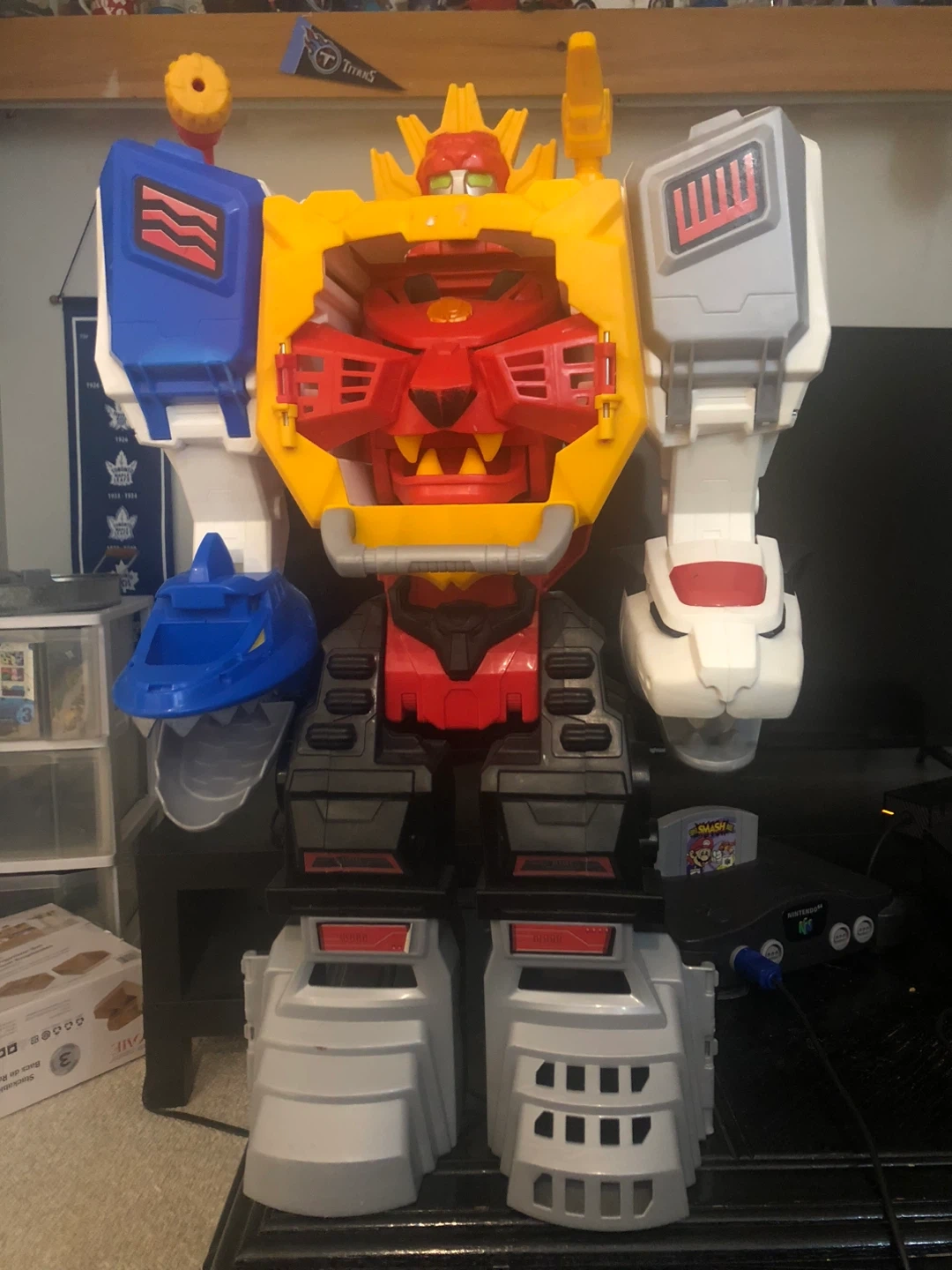 Selling a Power Rangers Wild Force Megazord lion robot toy. It's in great condition and ready for a new home. This toy features a vibrant colour scheme with red, yellow, blue, white, and grey accents. Perfect for any Power Rangers fan!