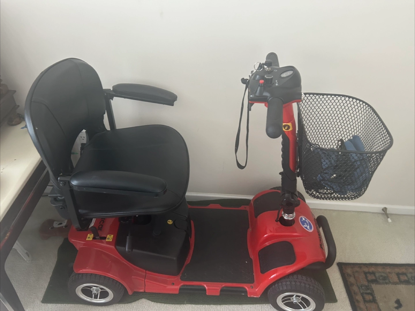 Selling a red Powercar mobility scooter. It's in good condition and ready to go! It features a comfortable seat, a basket for storage, and easy-to-use controls Extra new battery