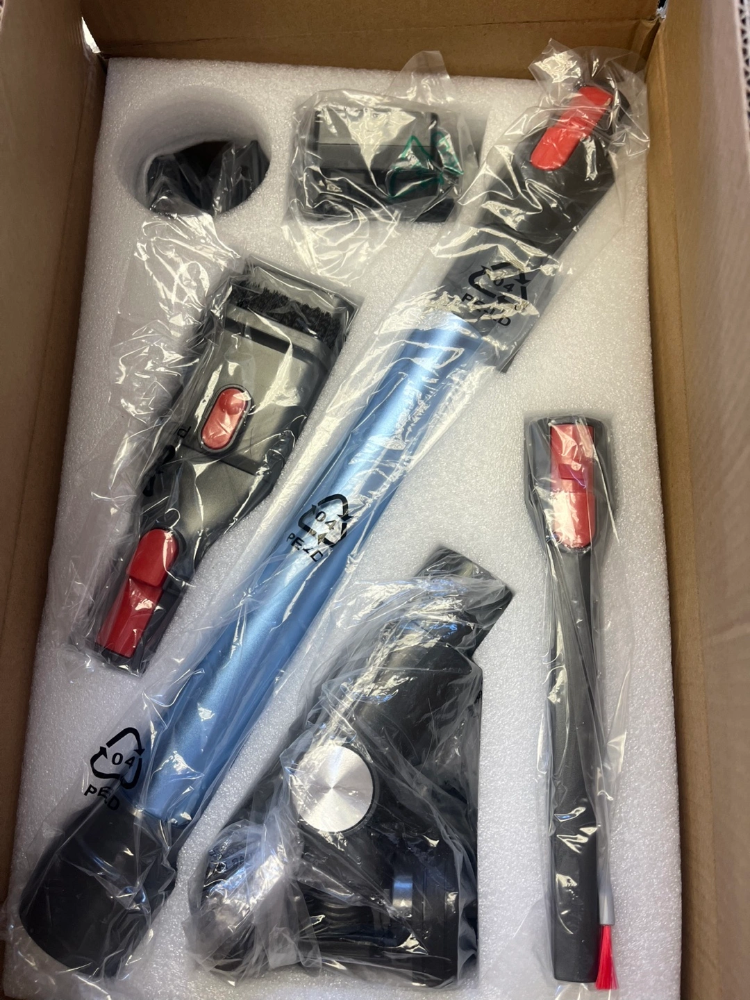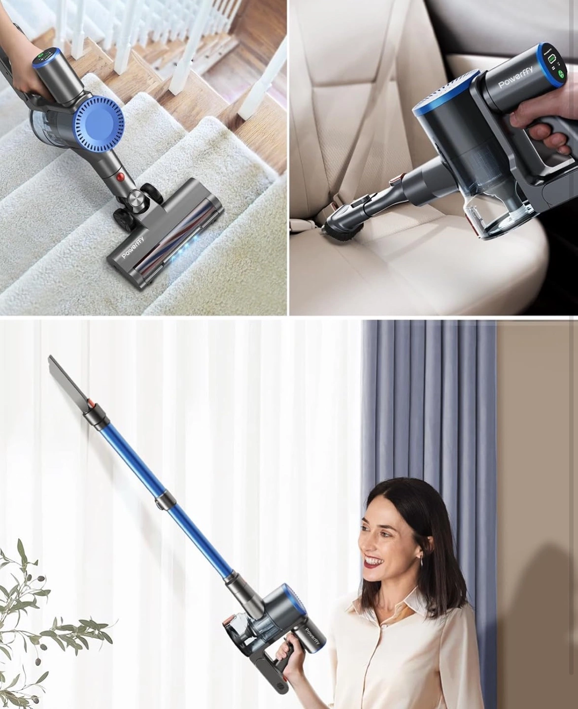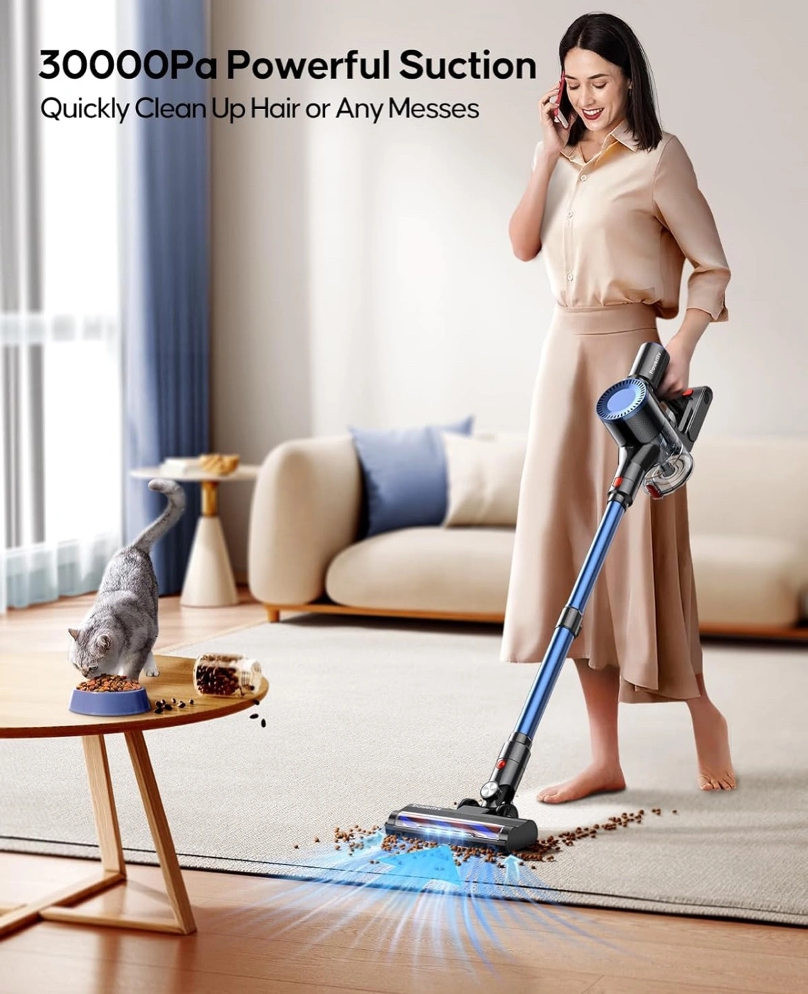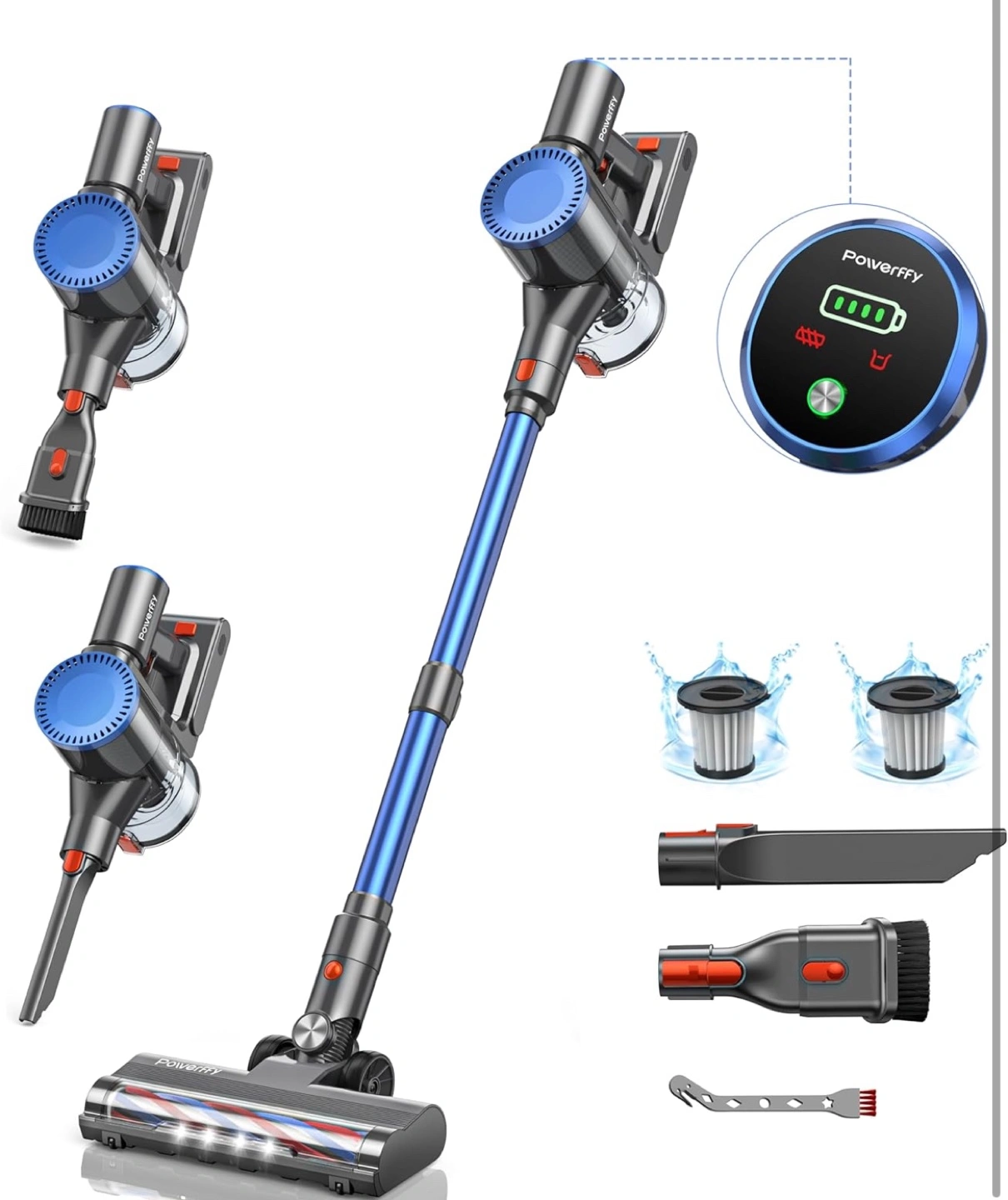 Powerful suction. Multiple attachments included. Easy-empty dustbin. Lightweight and cordless design. LED lights on floor head.