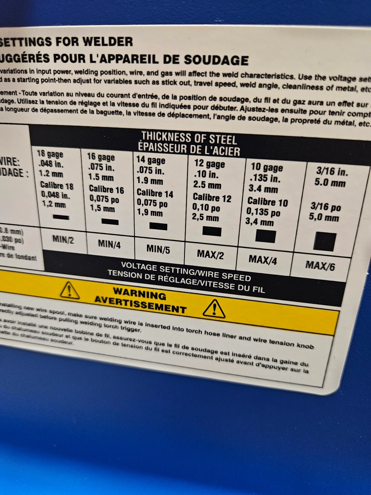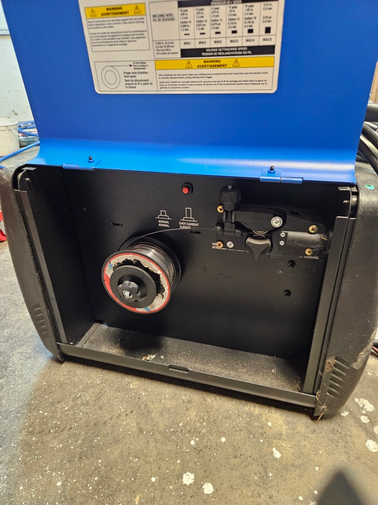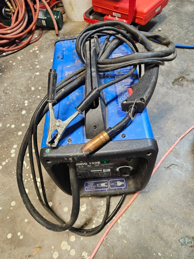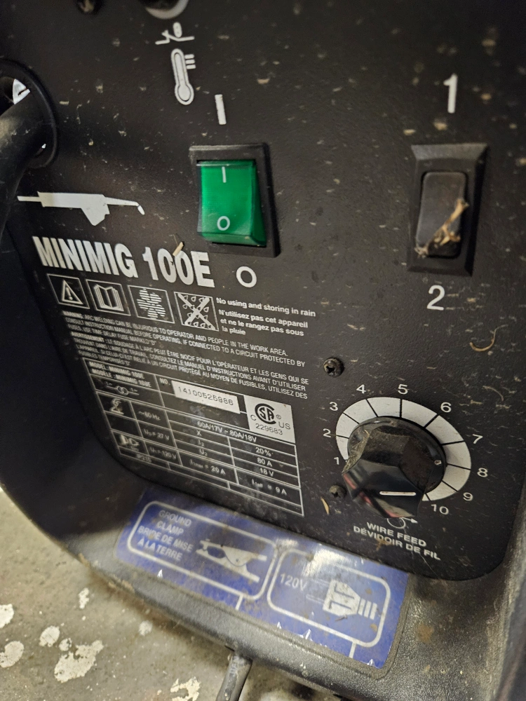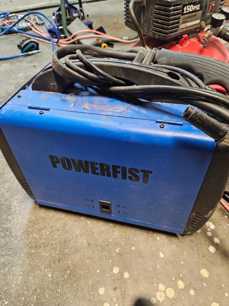 Selling a Powerfist MiniMig 100E welder. It's a compact and versatile machine perfect for small welding jobs. The welder is designed for 120V input power and features settings for adjusting wire speed and voltage. It's in good working condition and ready to use for your next project