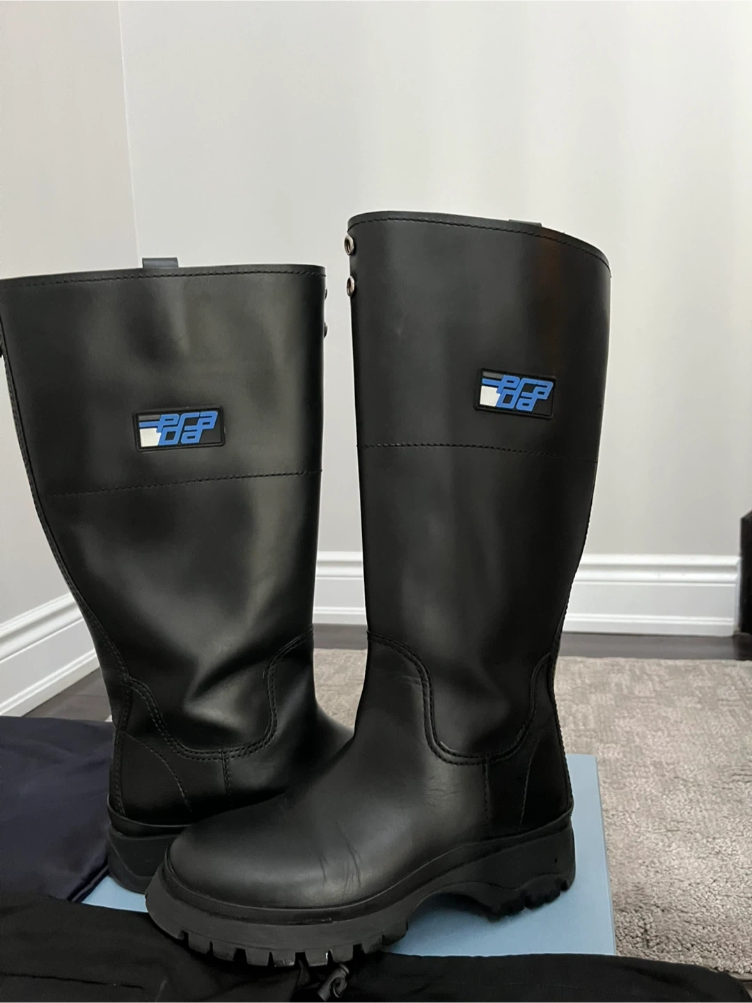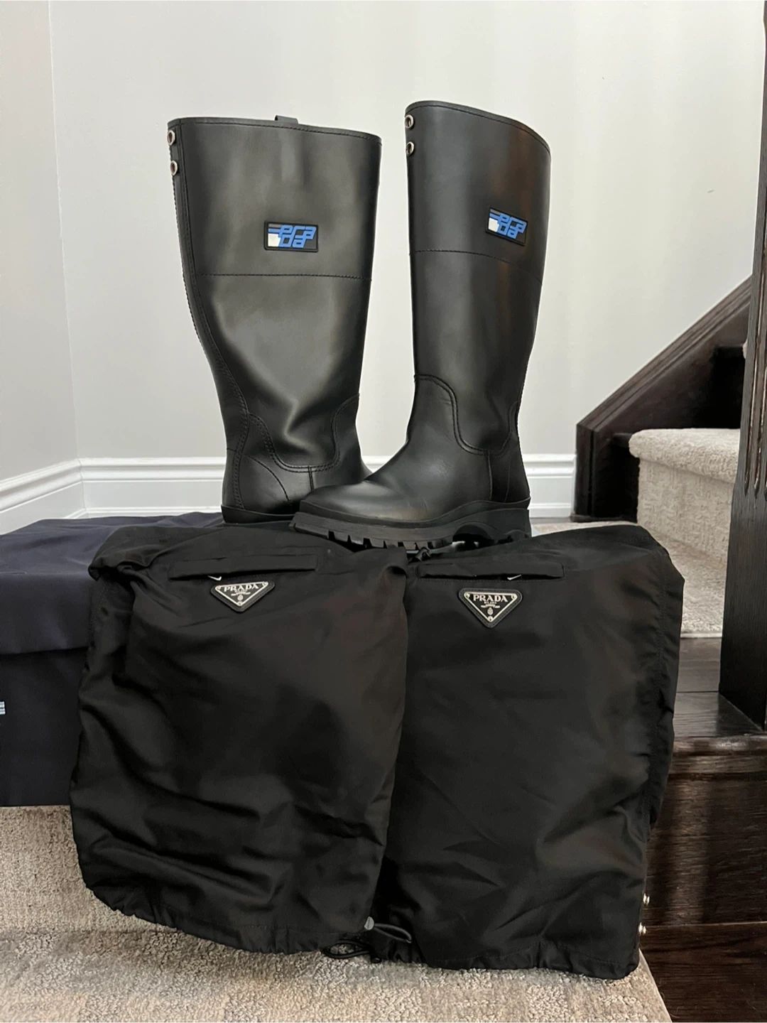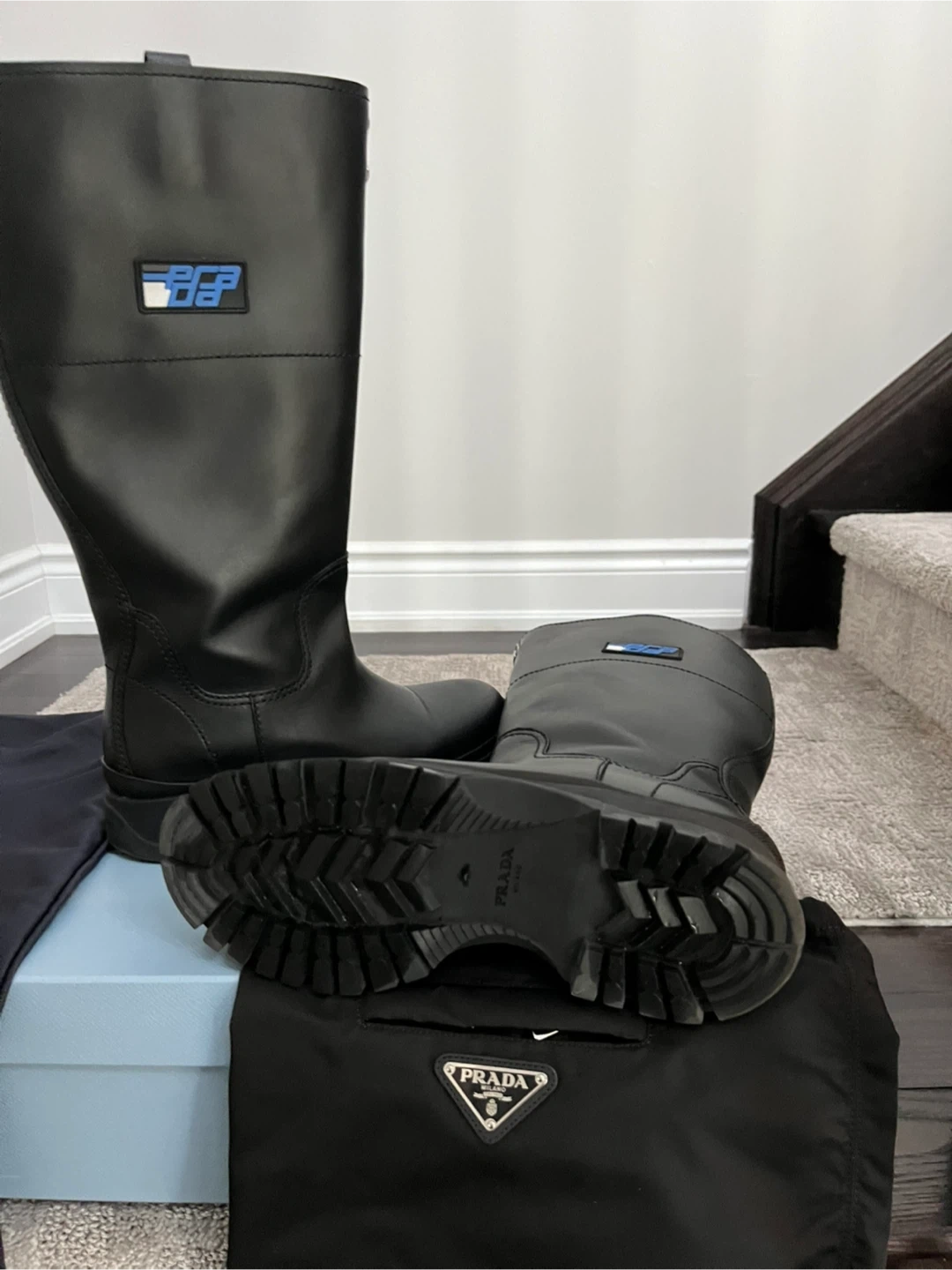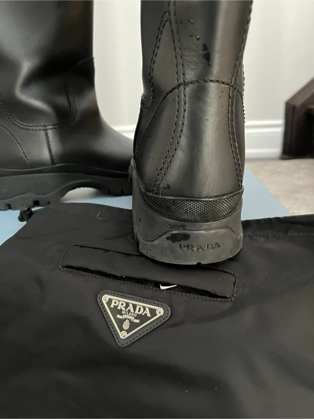 Selling a pair of Prada black leather boots in size 38. These boots are in great condition and come with their original box and dust bags. They are a stylish and durable choice for any wardrobe!