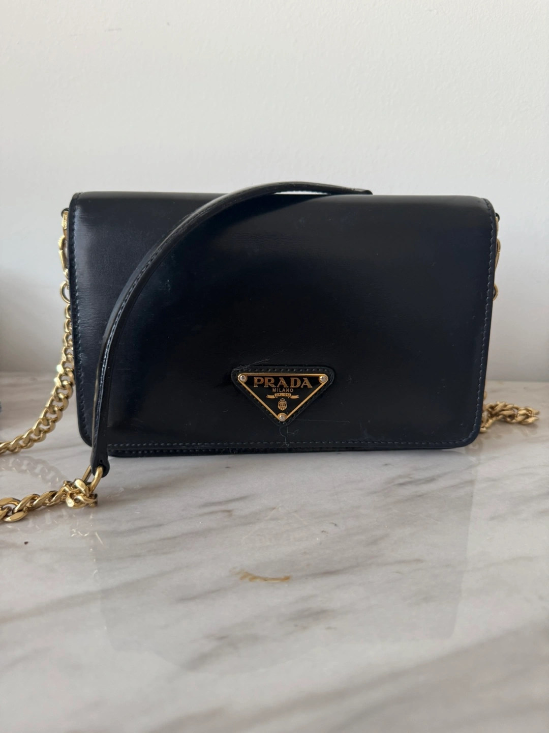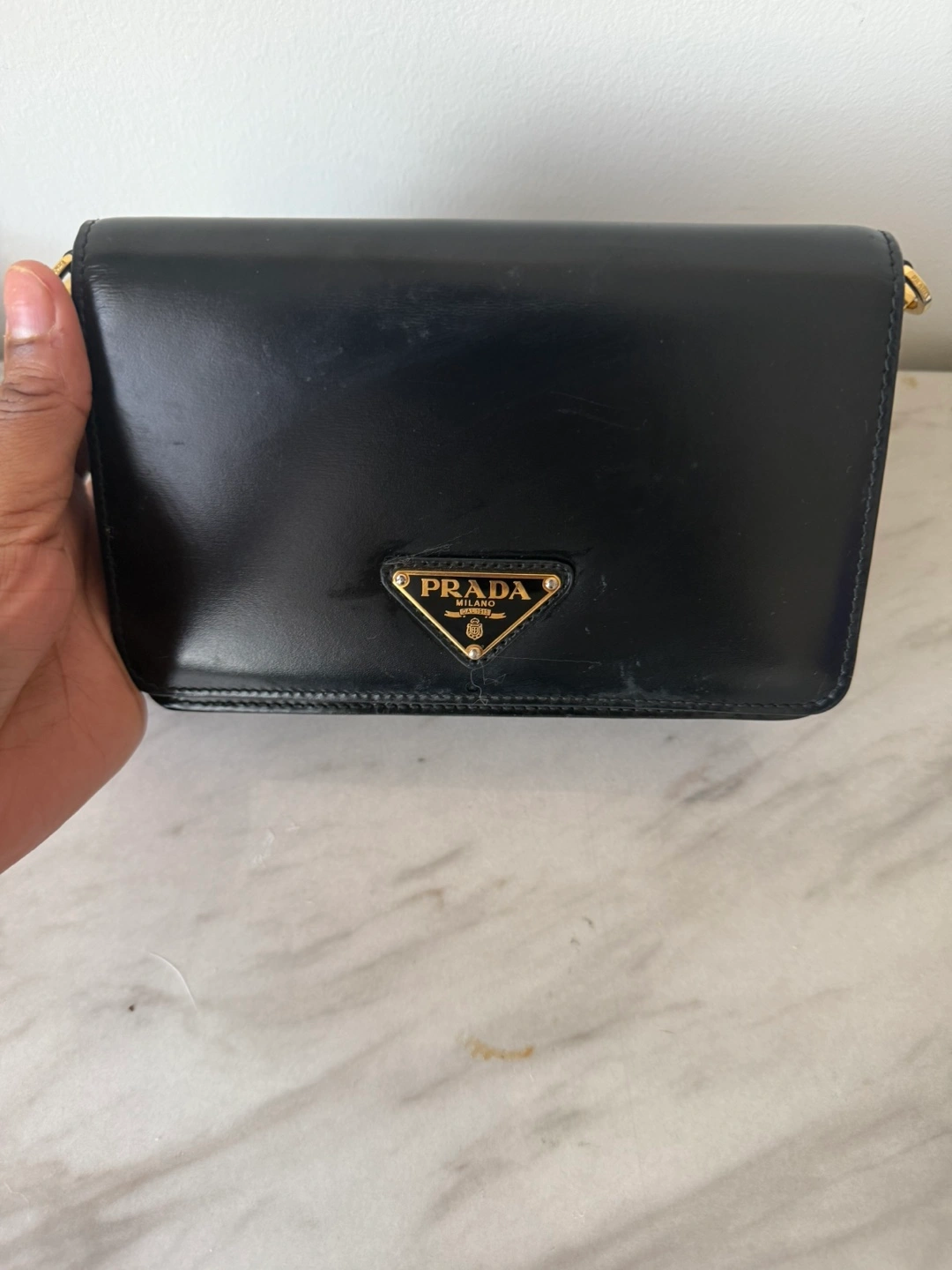 Selling a gently used Prada black leather chain wallet. It's in great condition and perfect for carrying your essentials. The chain adds a touch of elegance! Like new.