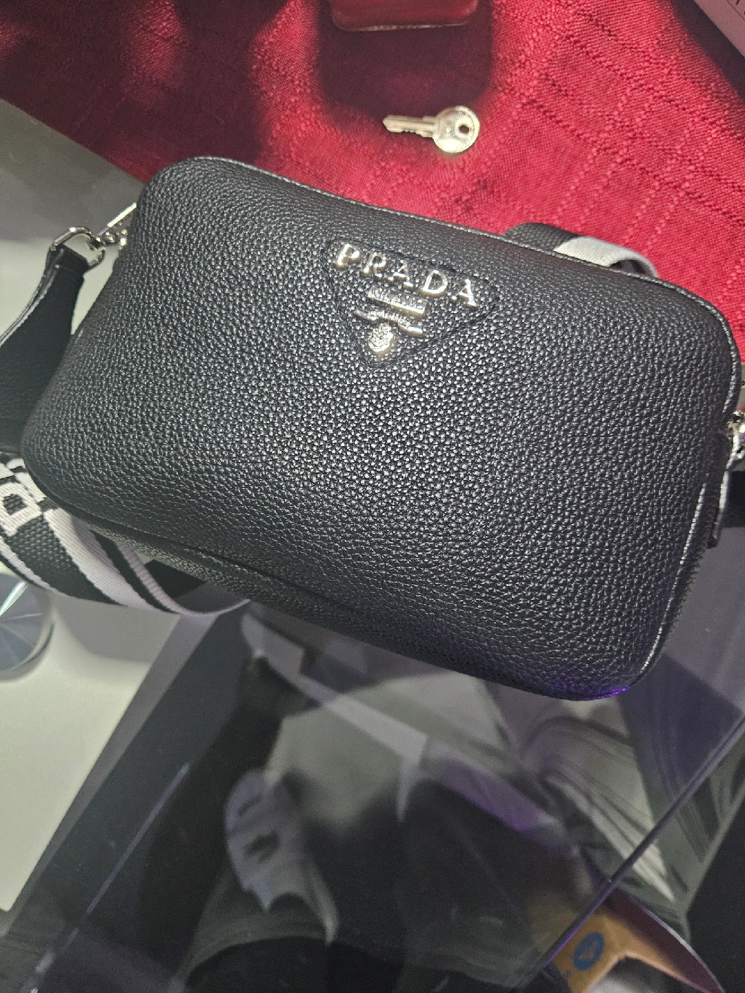 Selling a stylish Prada crossbody bag in black leather. It's in great condition and perfect for everyday use. The bag features the iconic Prada logo and a comfortable strap