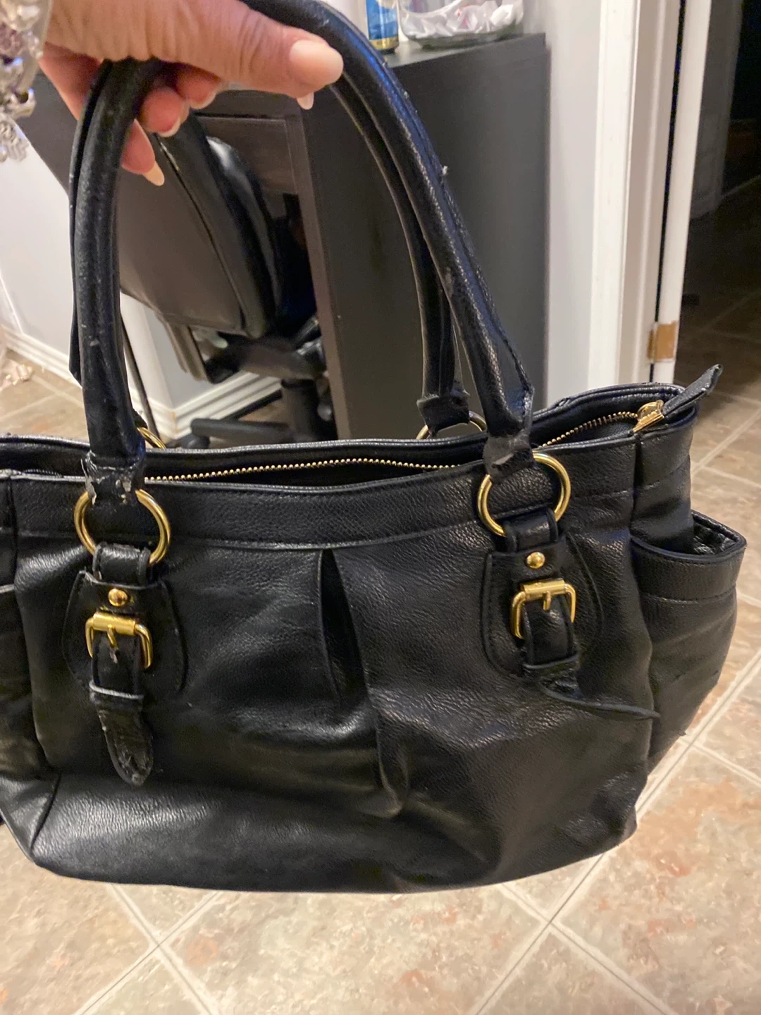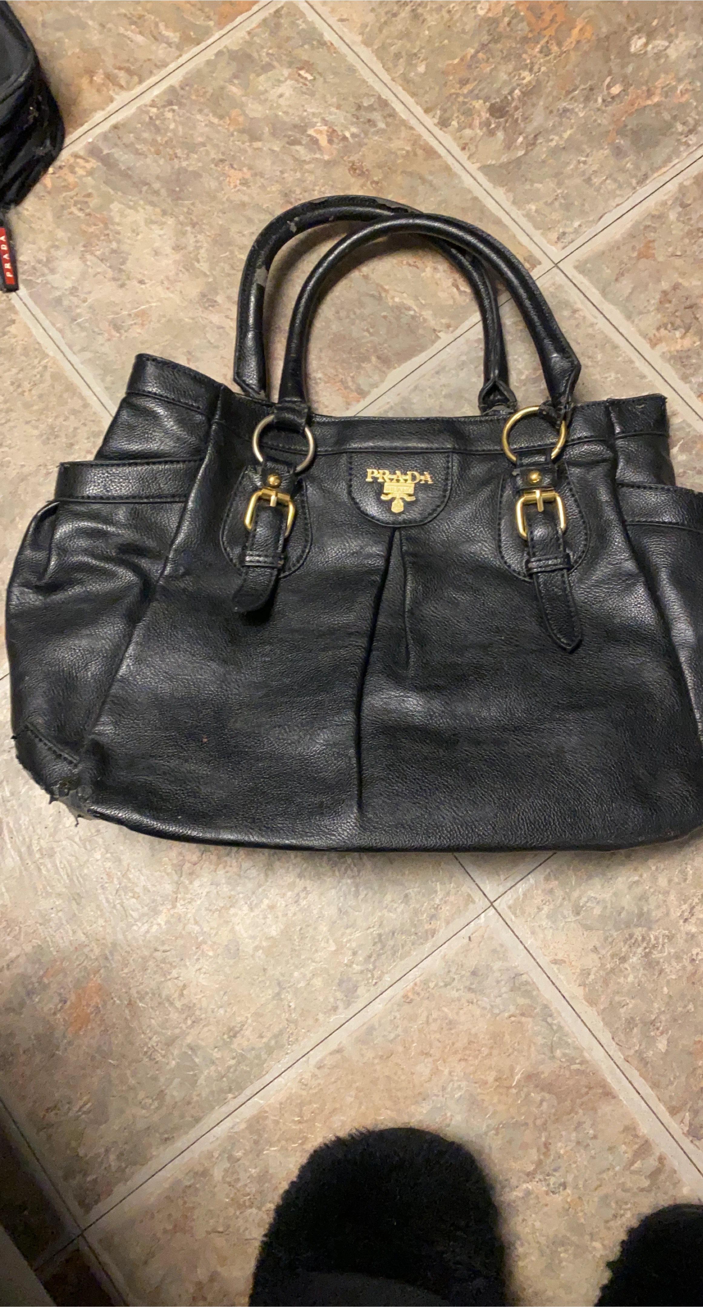 Selling a Prada handbag in black leather. It's a stylish bag, but there are some signs of wear on the handles and corners, as shown in the photos. Still has lots of life left!
