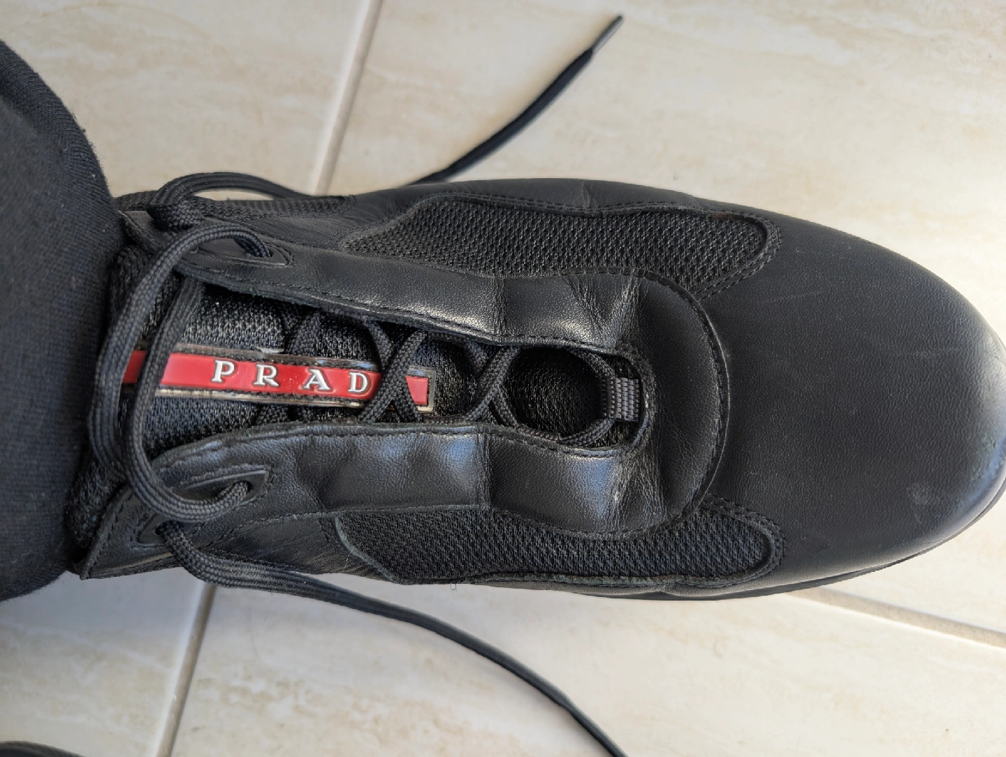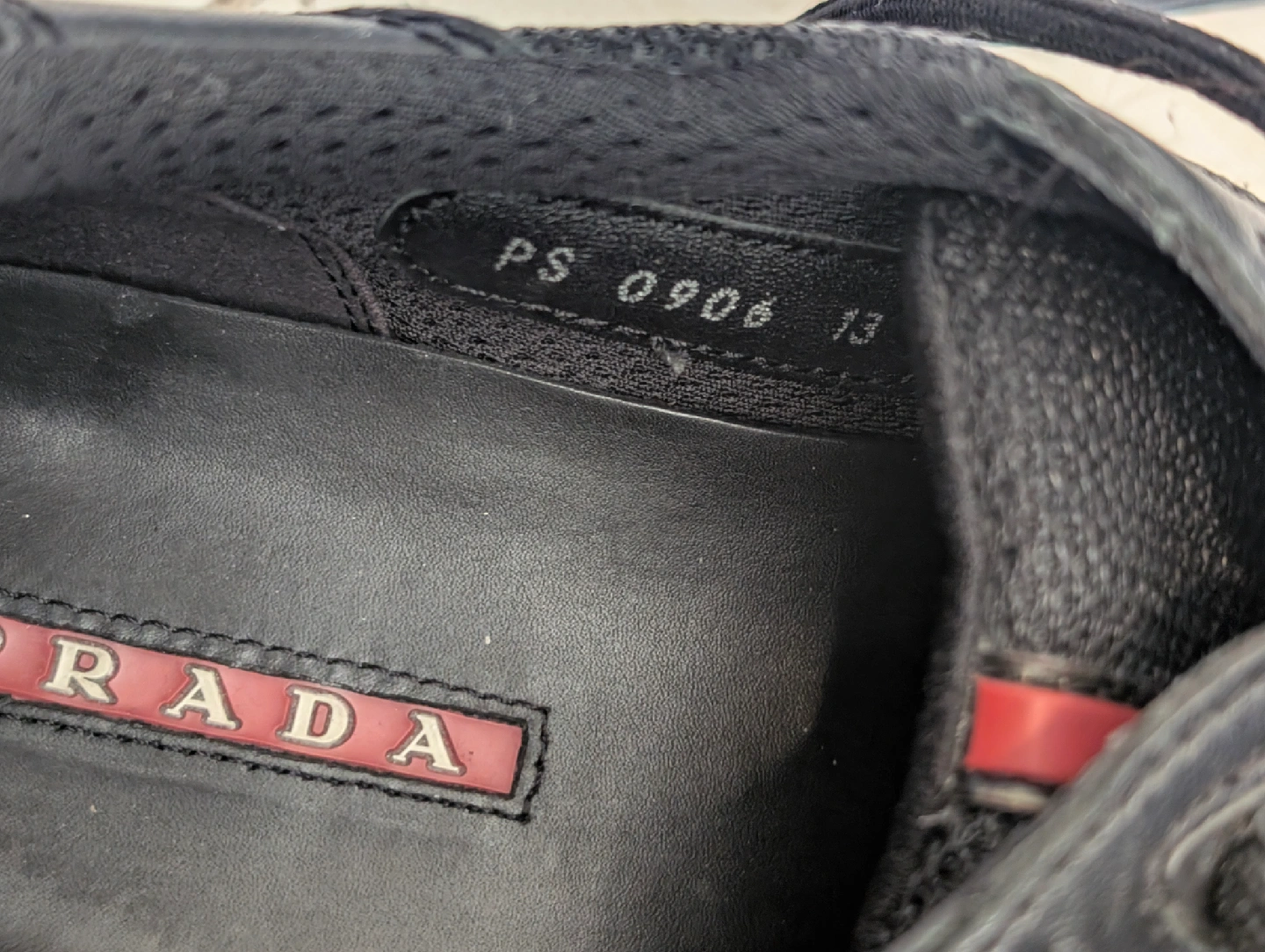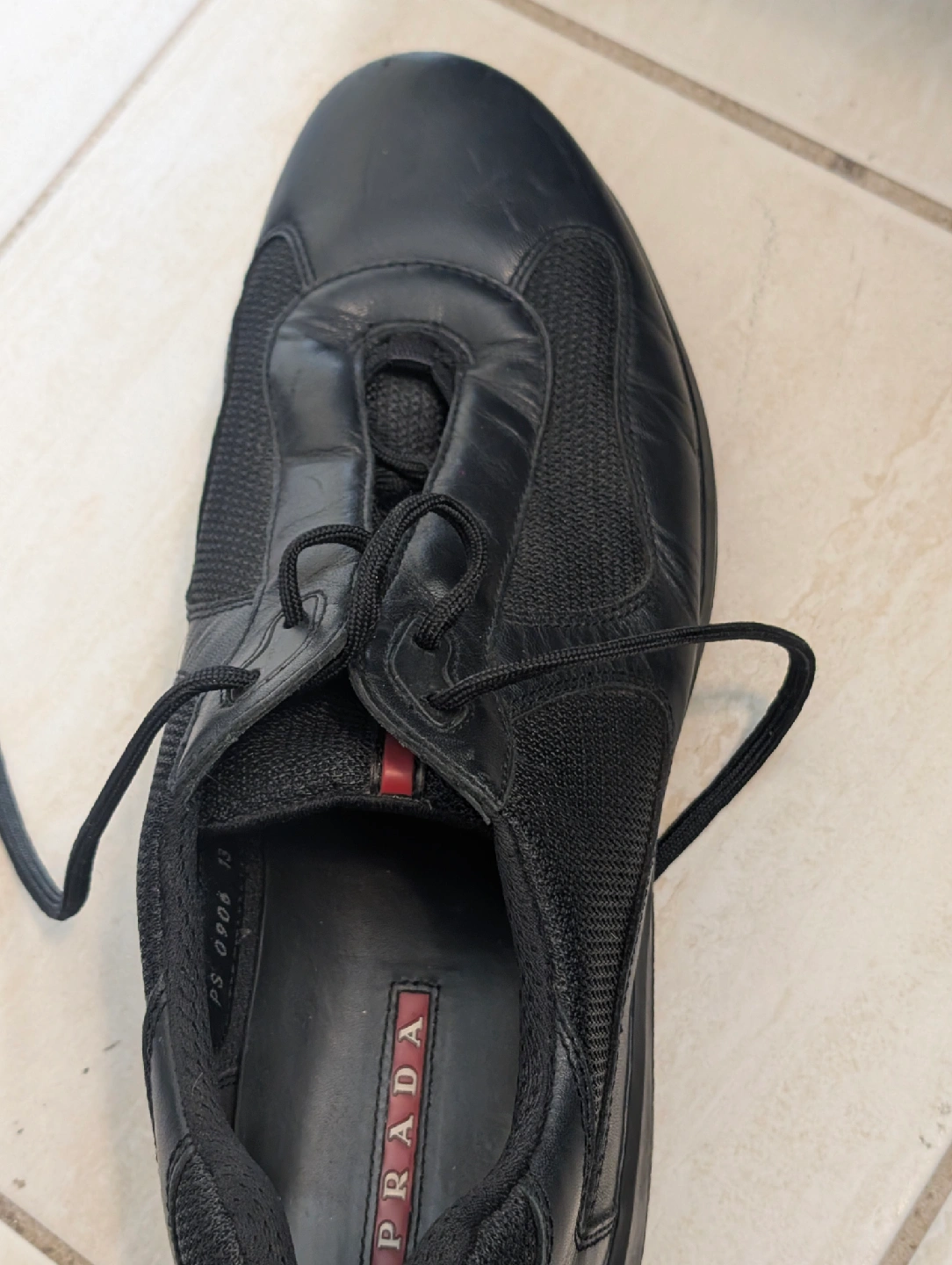 Selling a pair of Prada black leather sneakers. They are in good condition and are a size 13. The model number appears to be PS 0906.