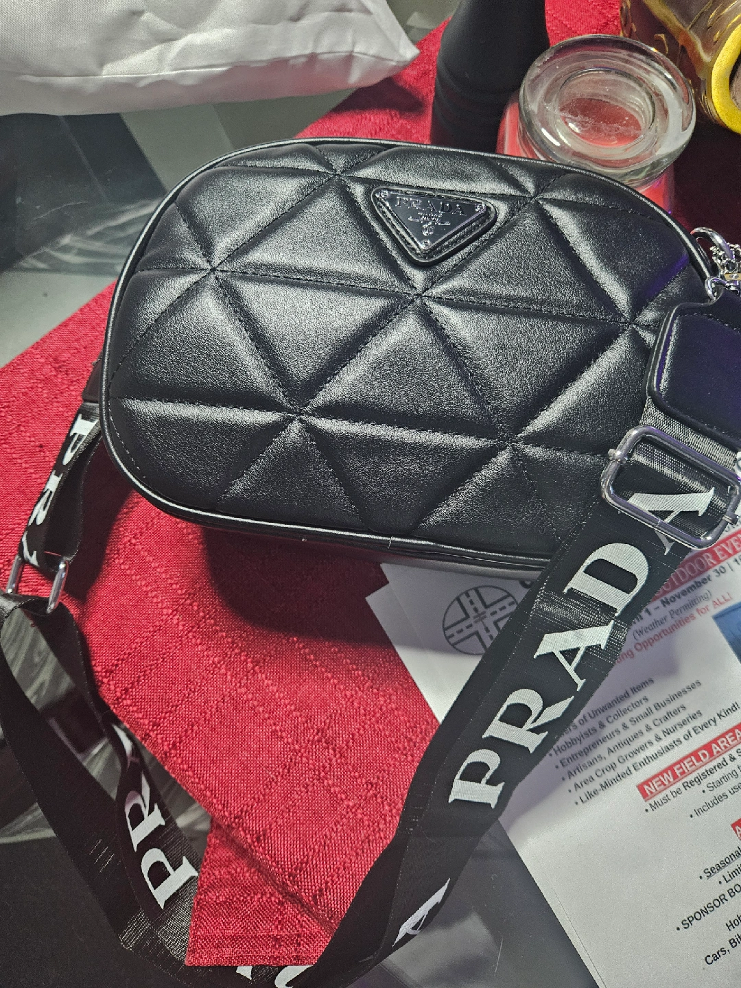 Selling a stylish black quilted crossbody bag from Prada! It's in great condition and features the iconic Prada logo on the front. The strap has the Prada name printed on it. Perfect for adding a touch of luxury to any outfit