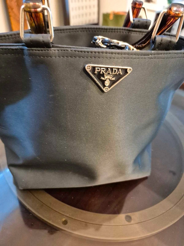 This is a pre-owned Prada handbag featuring durable black nylon material and stylish wooden handles, perfect for everyday use. Please note that this item is used and shows some signs of wear, which adds to its unique character. * Brand: Prada * Material: Nylon * Colour: Black * Handles: Wooden This bag has character! If you see this ad, the bag is still available!