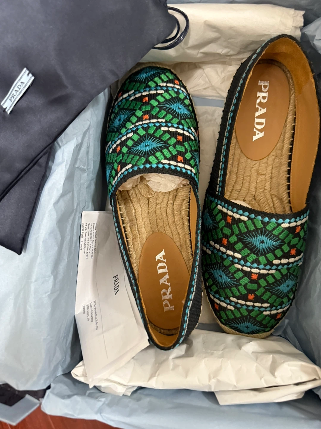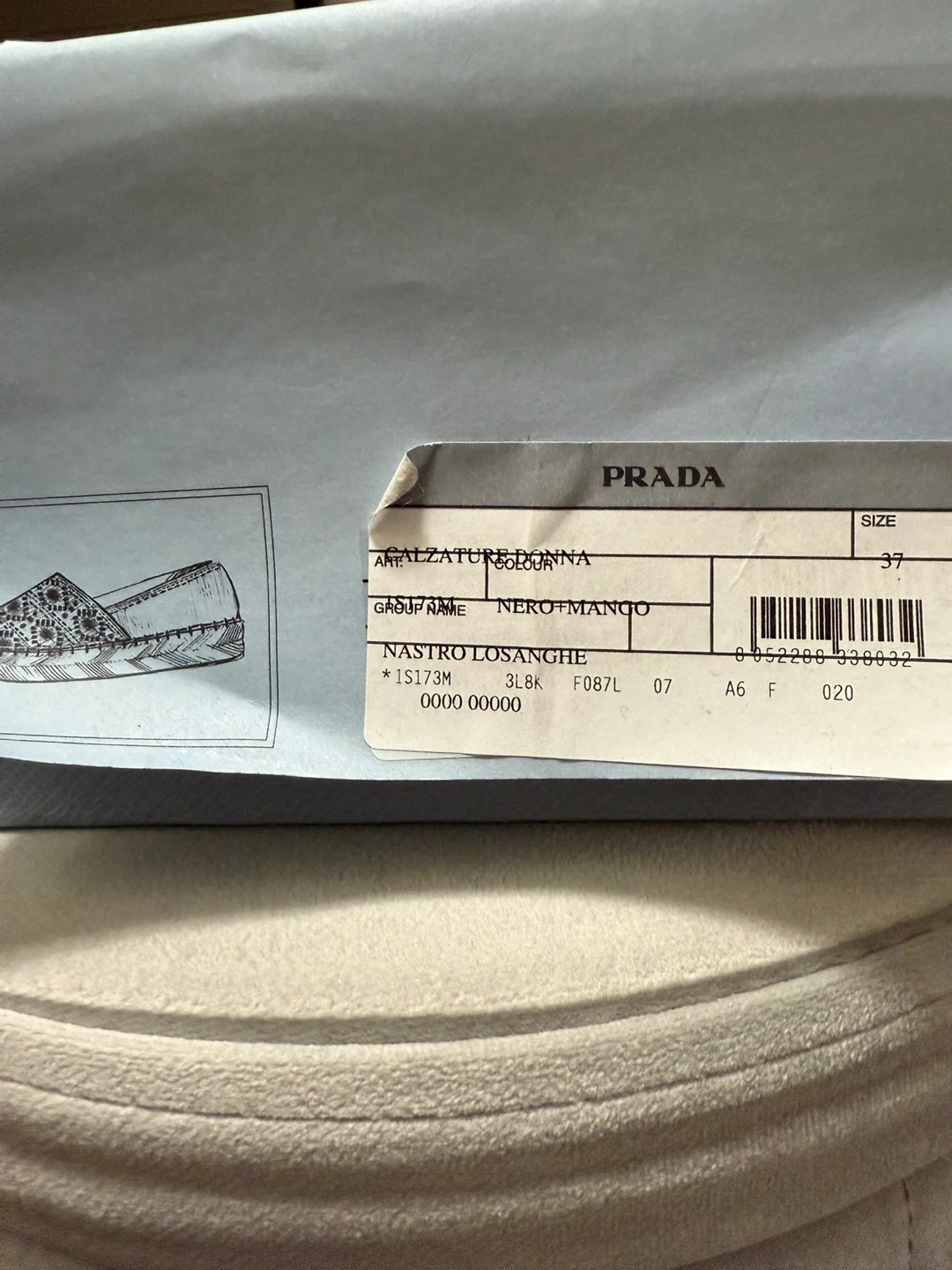 Selling a pair of Prada espadrilles in size 37. They feature a beautiful Nastro Losange design with a Nero+Mango colour scheme. Comes with the original box. Unworn. Price not negotiable.