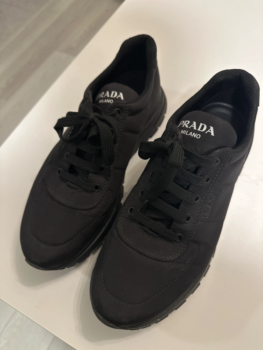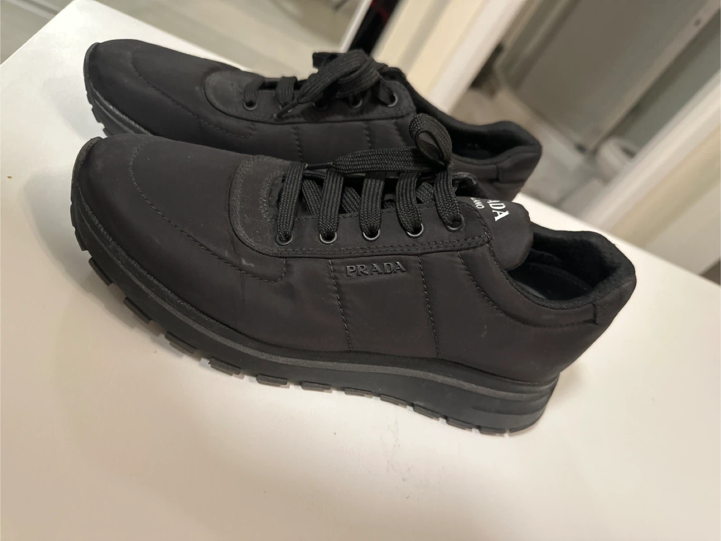 Selling a pair of Prada sneakers in black! They're in great shape and ready for a new home. Classic and stylish, perfect for everyday wear, only worn twice, size is men’s 8 but runs bigger, can fit 9-9.5