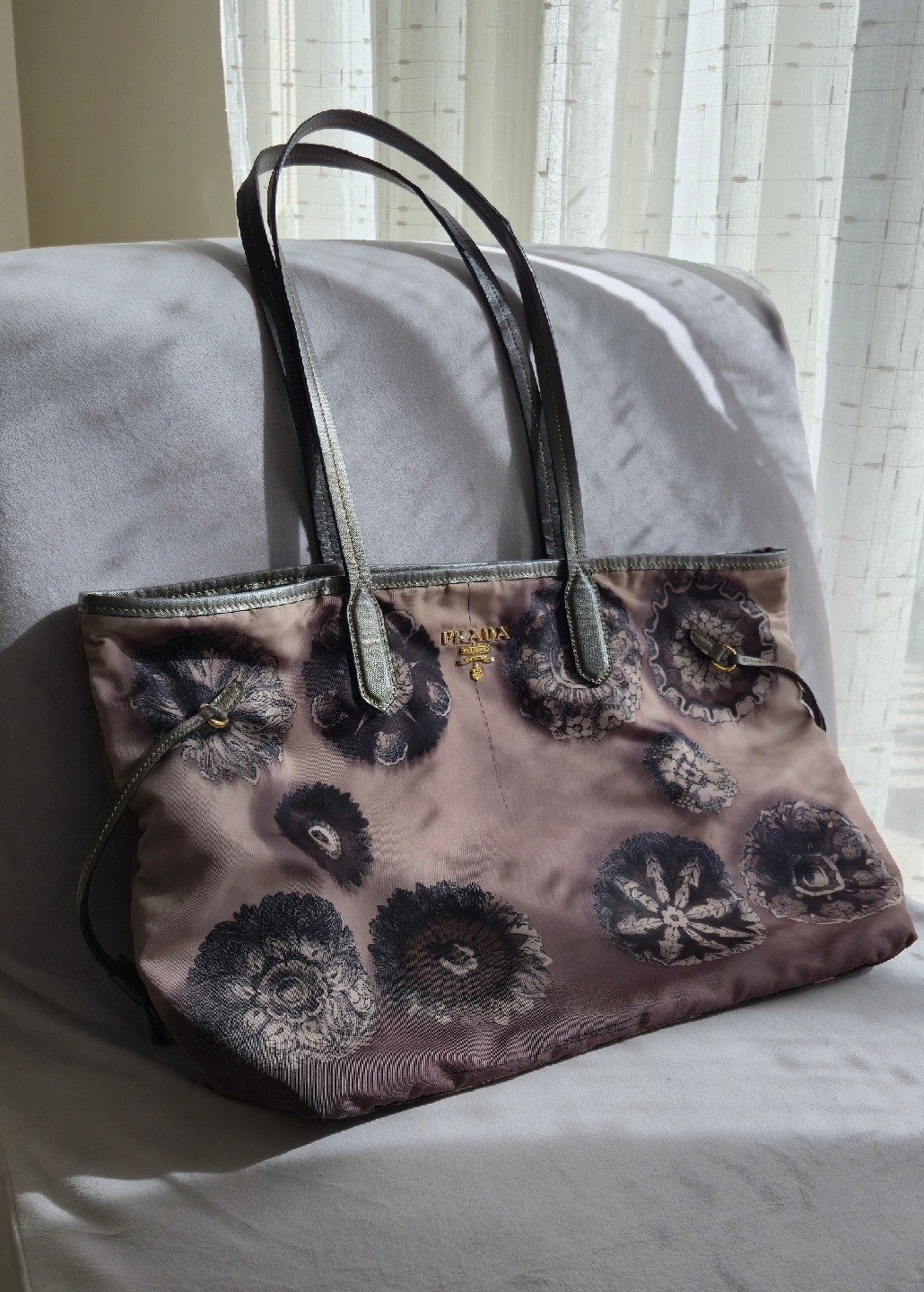 Prada tote bag with a unique floral pattern. The bag features a spacious interior with a zipper pocket. It's perfect for everyday use or as a stylish accessory for any outfit!
