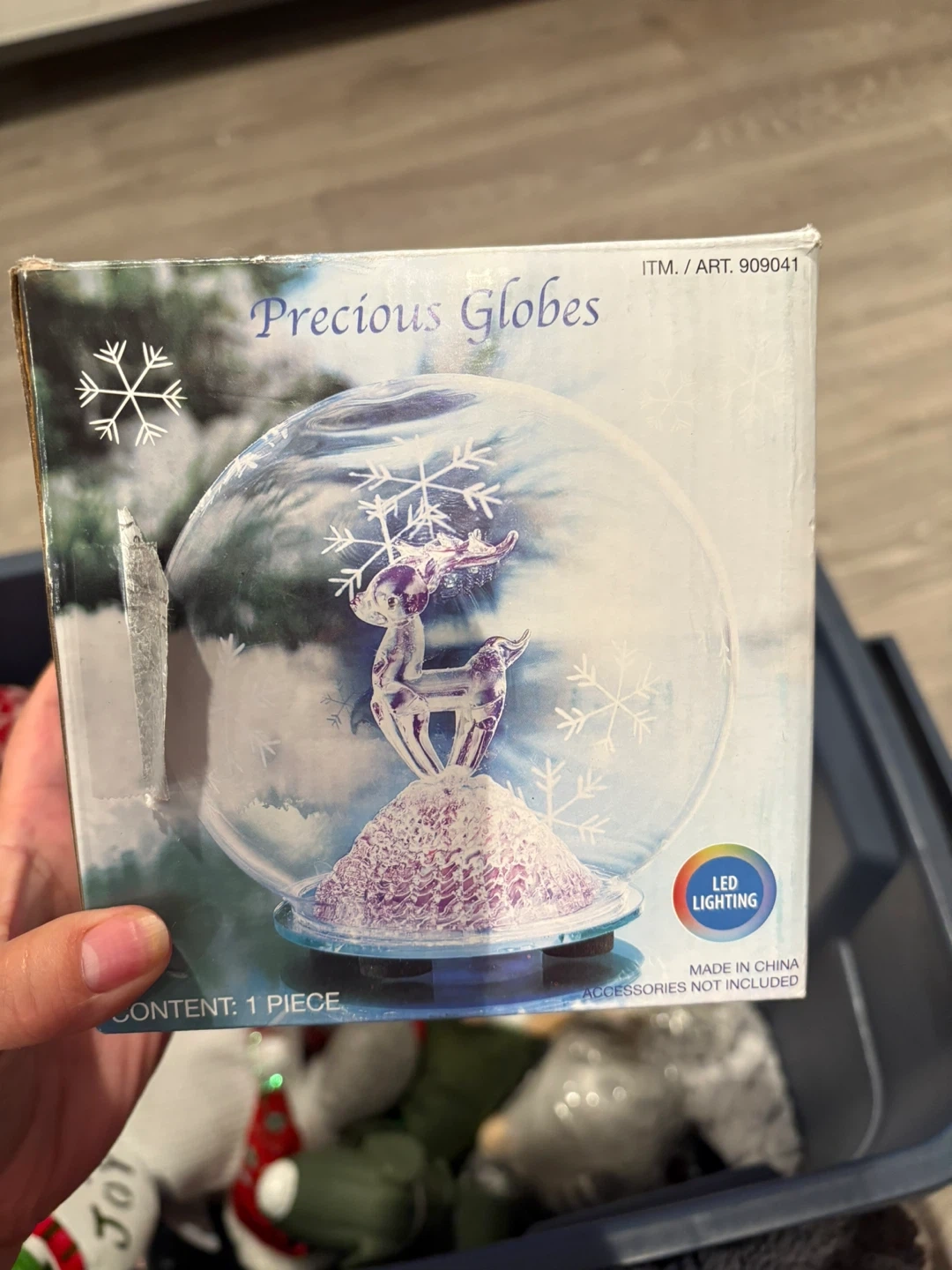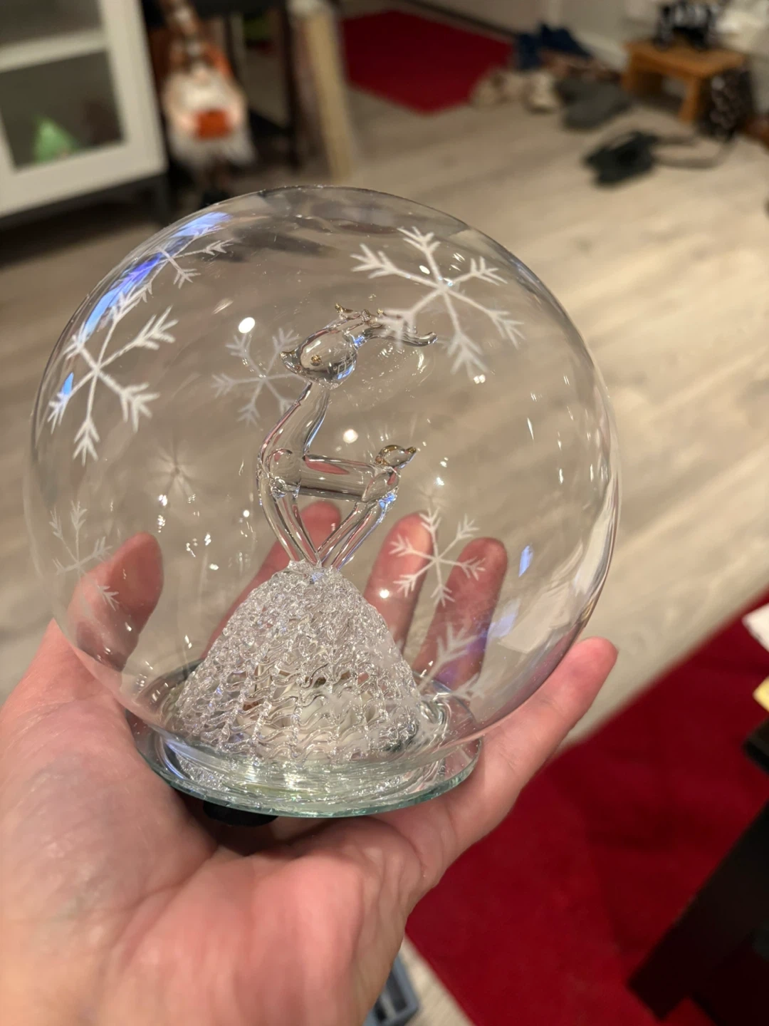 Selling a lovely snow globe from Precious Globes! It features a delicate reindeer figure inside a clear glass globe, adorned with snowflake patterns. The base has LED lighting, adding a warm glow. Comes in the original box. A beautiful decorative piece for the holidays!