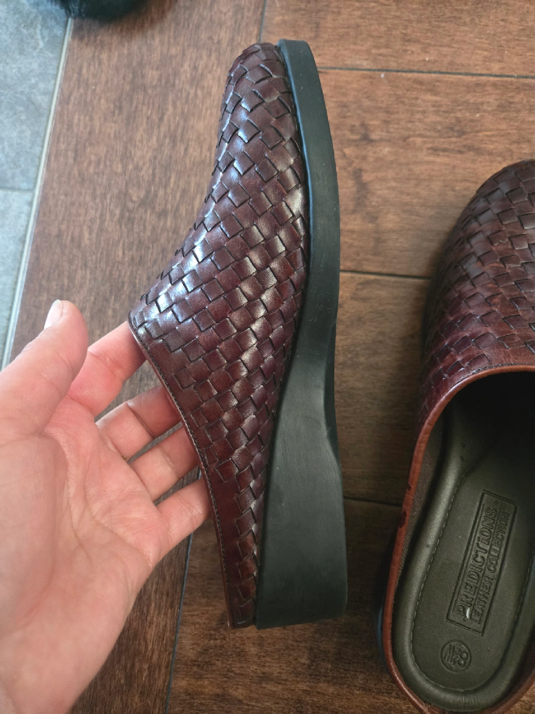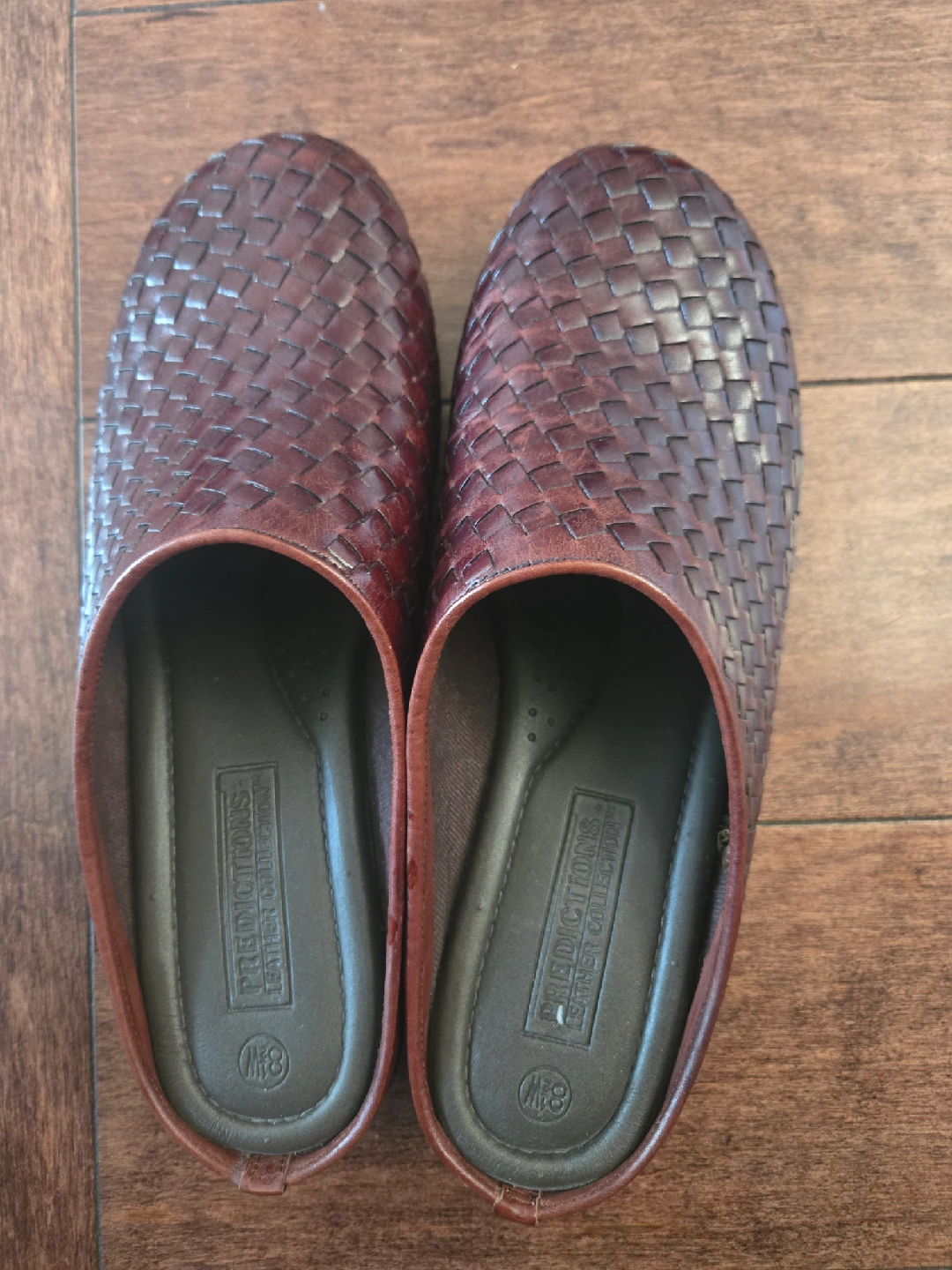 Selling a pair of Predictions Leather Collection mules in a size 8.5W. They have a lovely woven design and are in great condition. Perfect for slipping on and off!