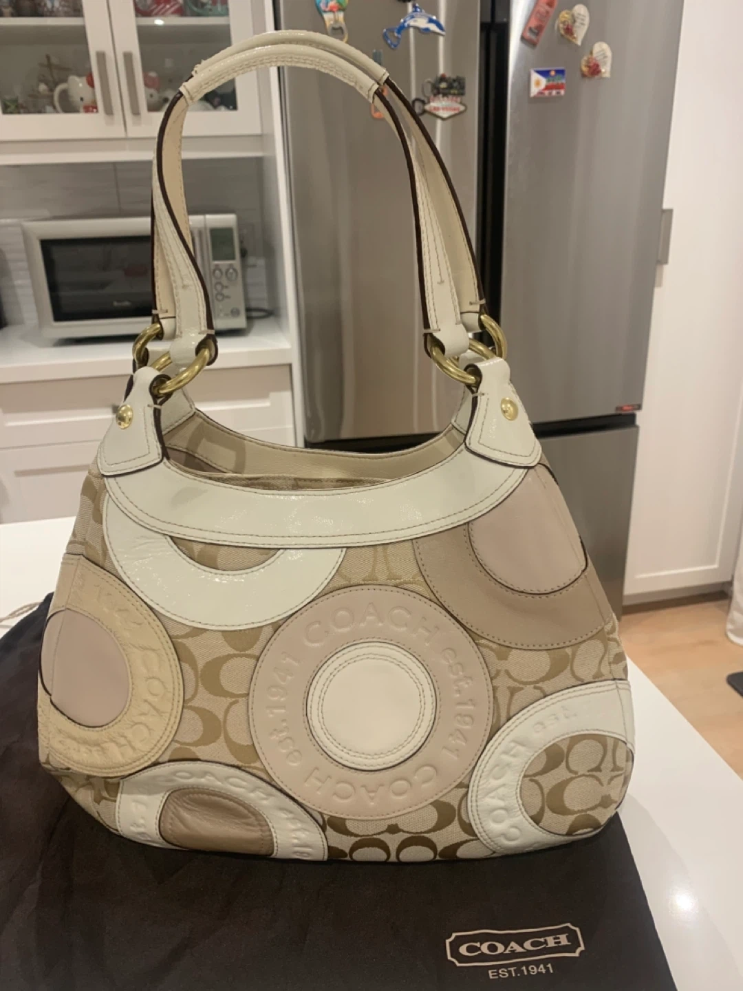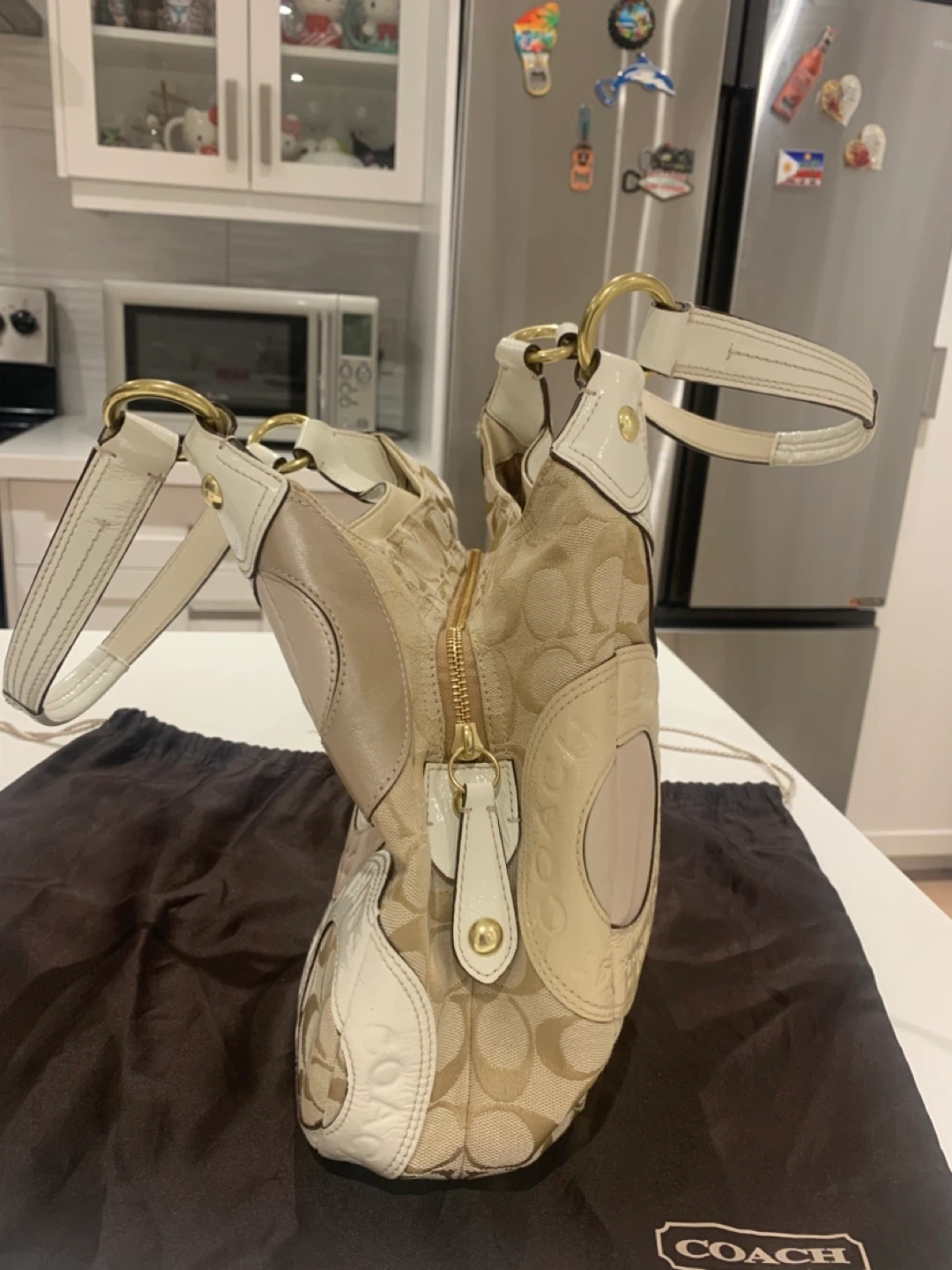 Selling a Coach hobo bag in a lovely beige and white colour scheme. The model number is L1193-F18824. It's in good condition and ready for a new home! Perfect for everyday use or a stylish night out