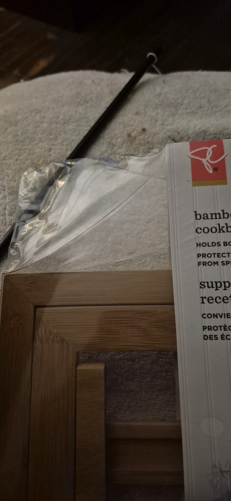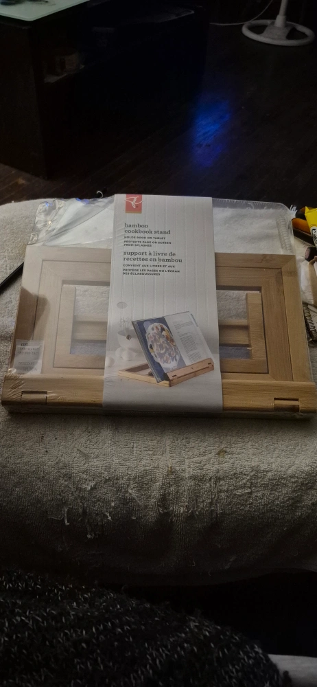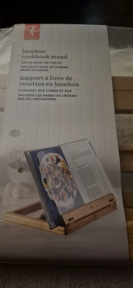 Selling a brand new President's Choice bamboo cookbook stand, still sealed in its original packaging! It's designed to hold both books and tablets while you're cooking, protecting them from splashes. Made of bamboo and polystyrene. ( top corner of polystyrene is broken due to dropping accidentally )