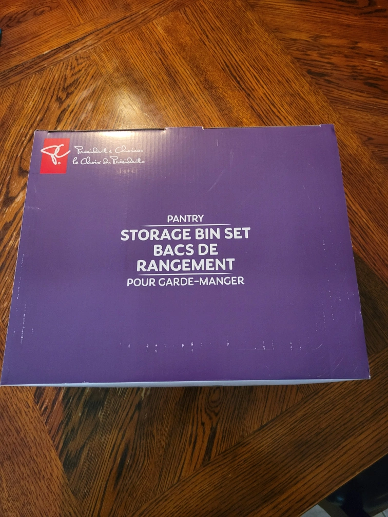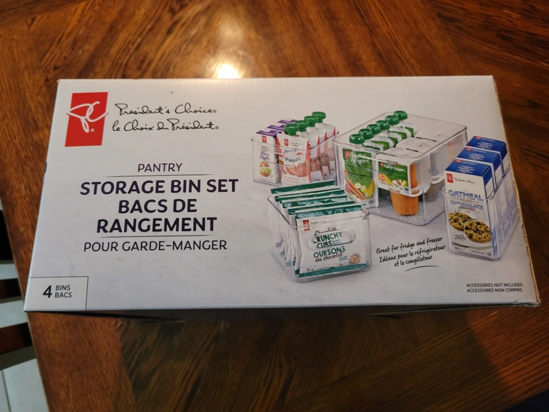 NEW in box Keep your pantry organized with this President's Choice storage bin set! Includes 4 bins to help declutter your kitchen, fridge, or freezer. The set includes: - 1 large bin: 20 cm x 25.5 cm x 15.3 cm - 1 narrow bin: 10.5 cm x 25.5 cm x 12.5 cm - 2 square bins: 15 cm x 15 cm x 10.7 cm Maximum weight capacity: - Large bin: 9 kg - Narrow bin: 4 kg - Square bin: 4 kg