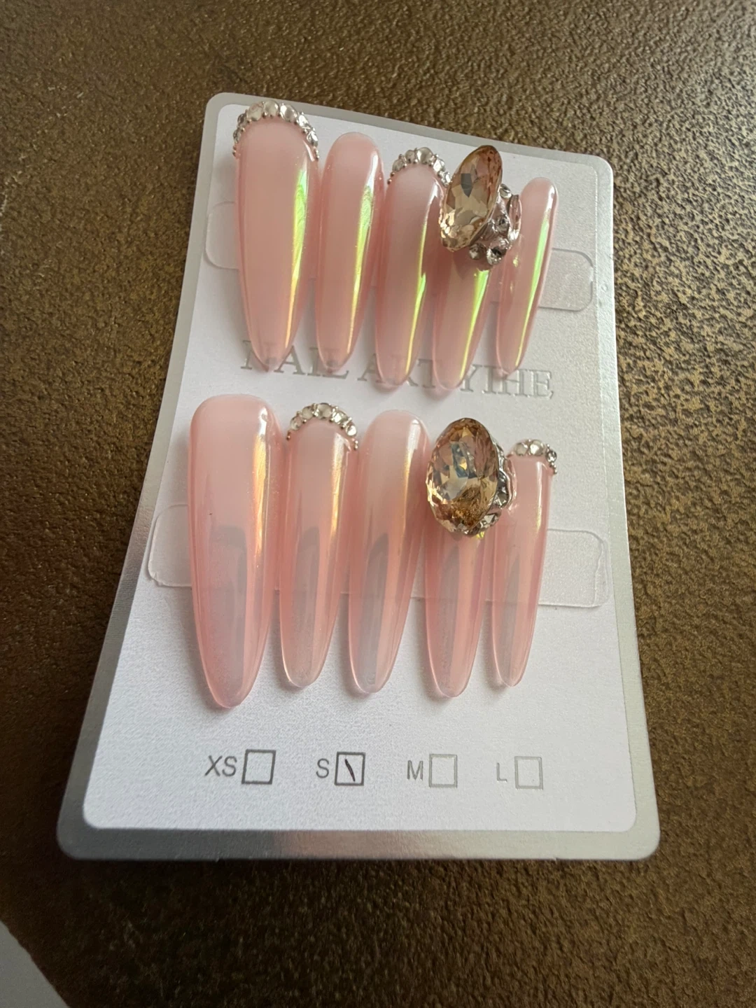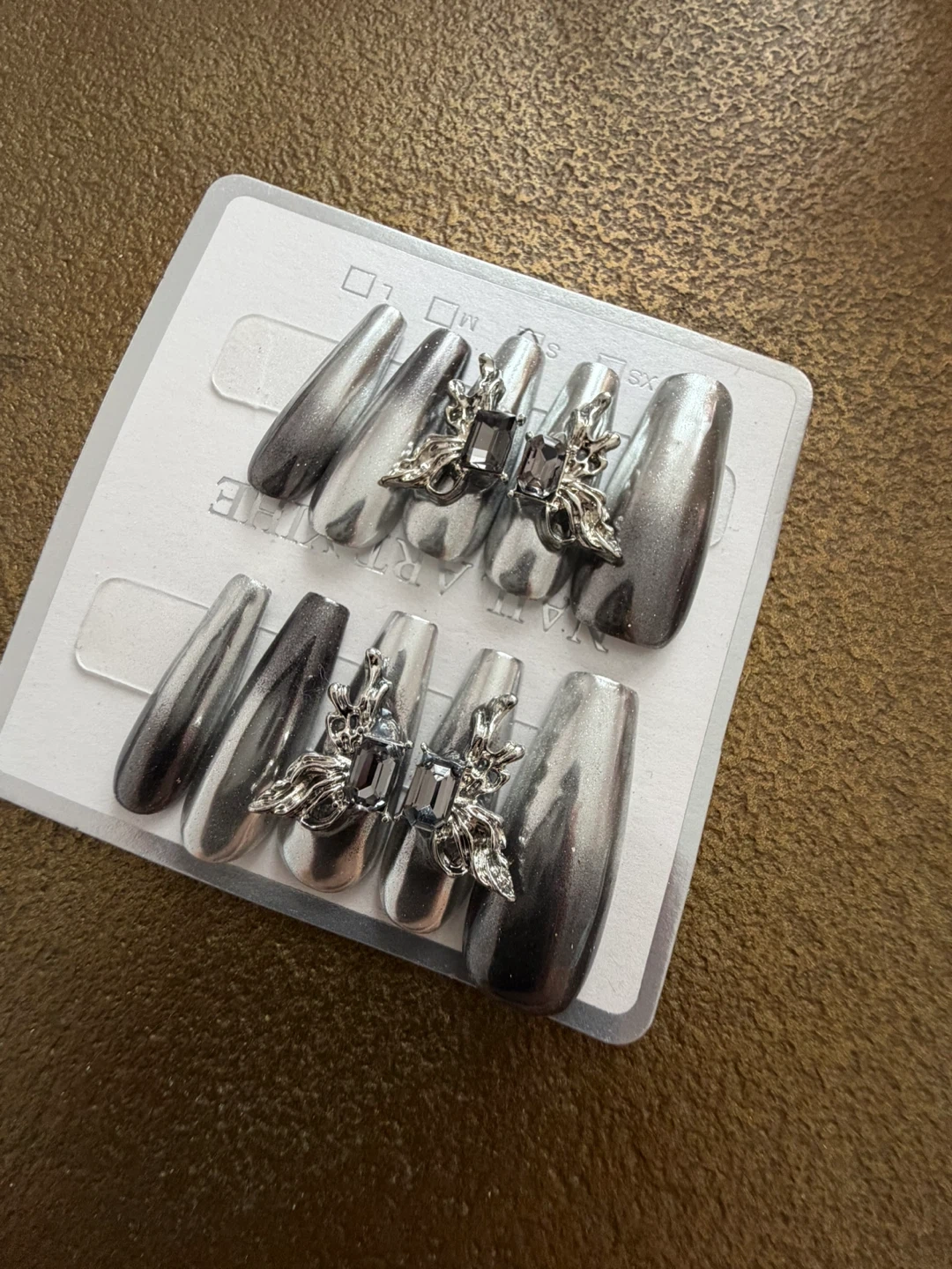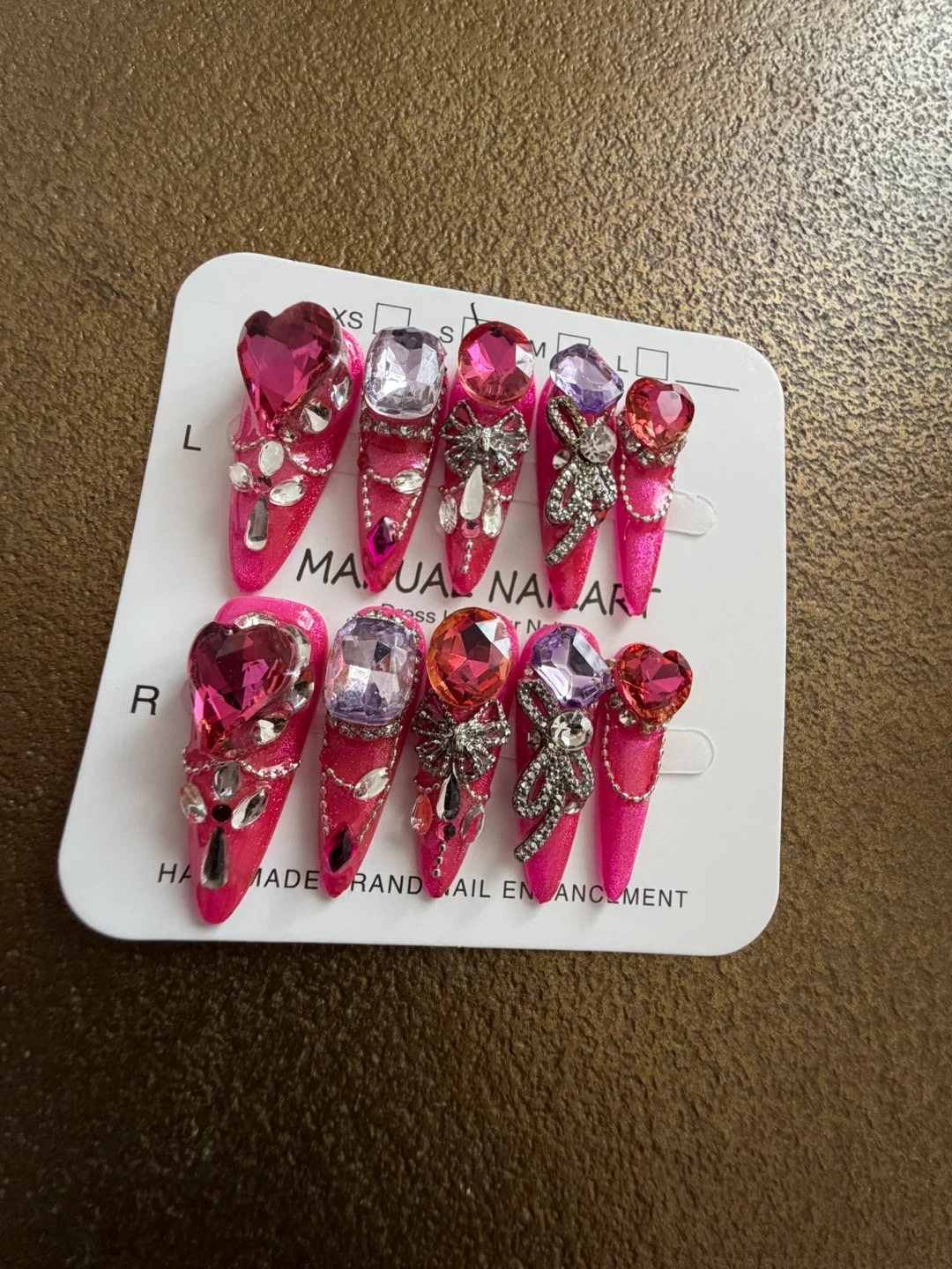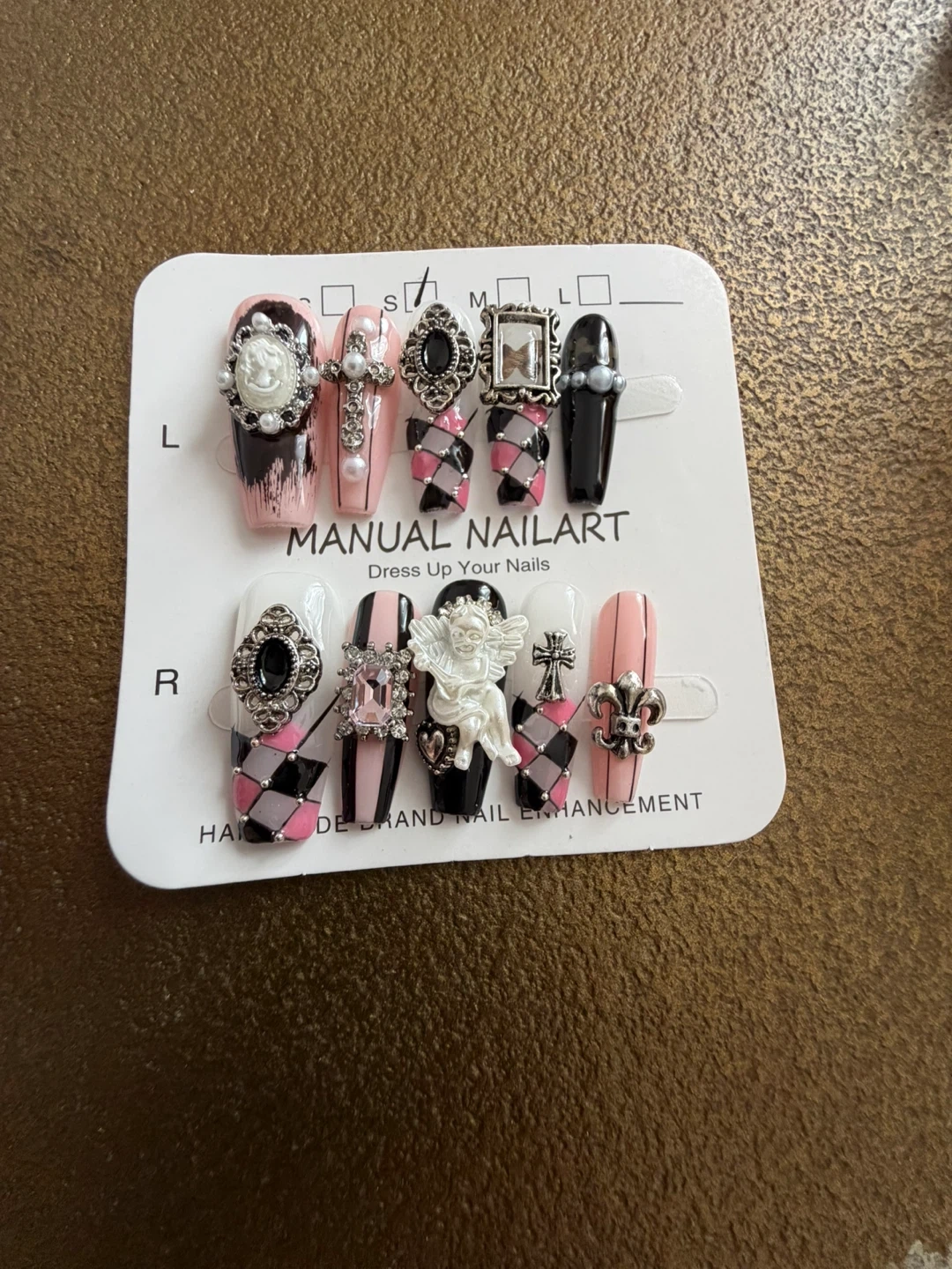Selling a set of press on nails. Various colours and sizes available, including pink, red, black and silver. Each set has unique designs and embellishments. Perfect for a quick and easy manicure!