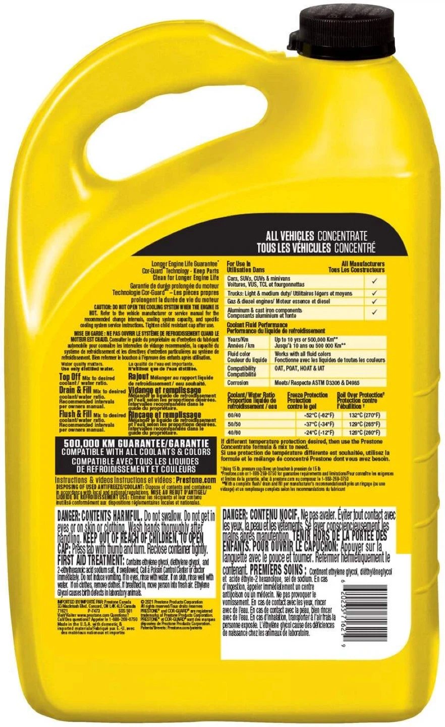 I'm selling a fresh, unopened jug of Prestone All Vehicles Antifreeze + Coolant. It's pre-diluted 50/50 and works with all makes, models, and years of vehicles. It also provides 10 year/500,000 km longer engine life guarantee against rust and corrosion