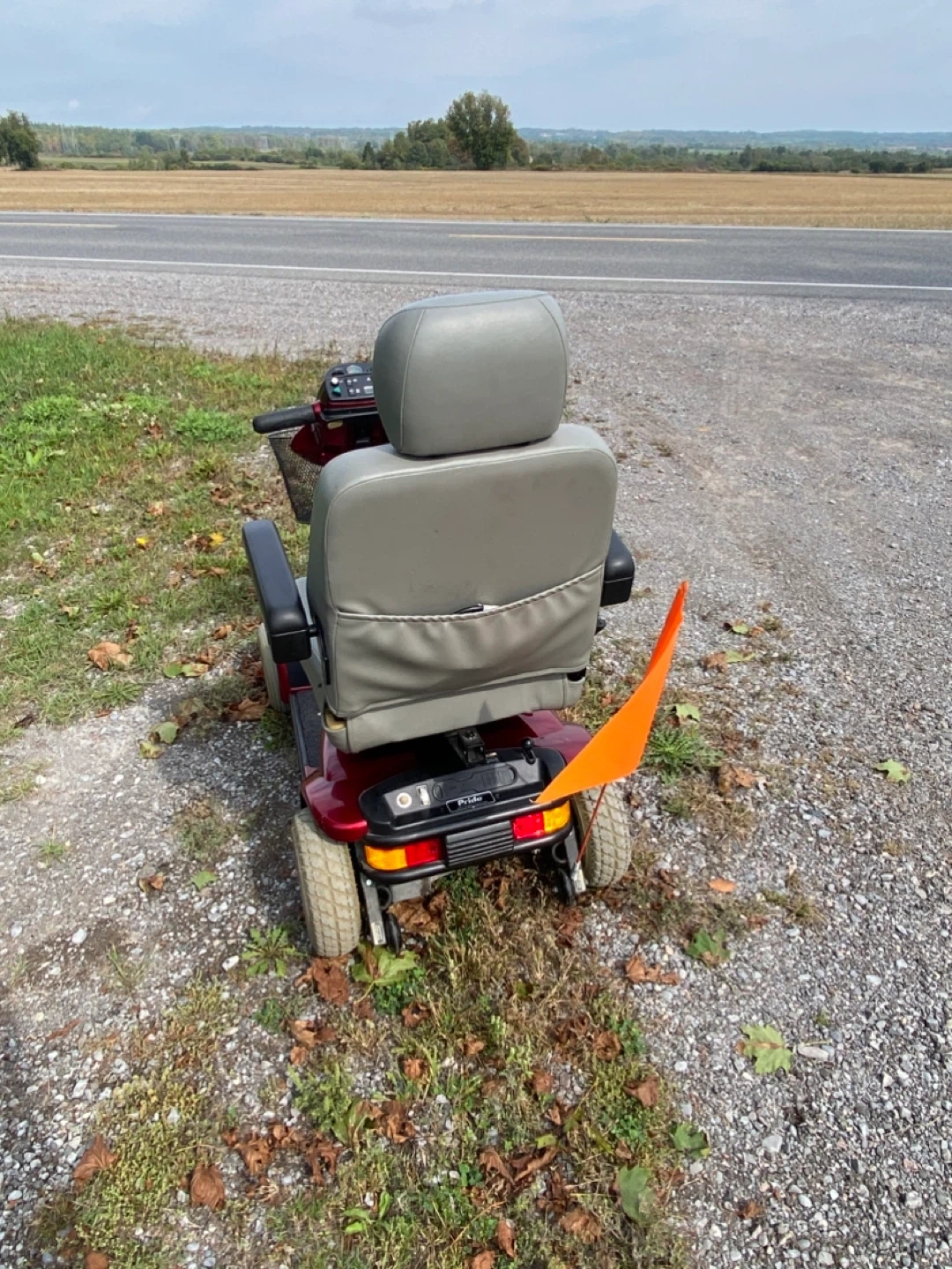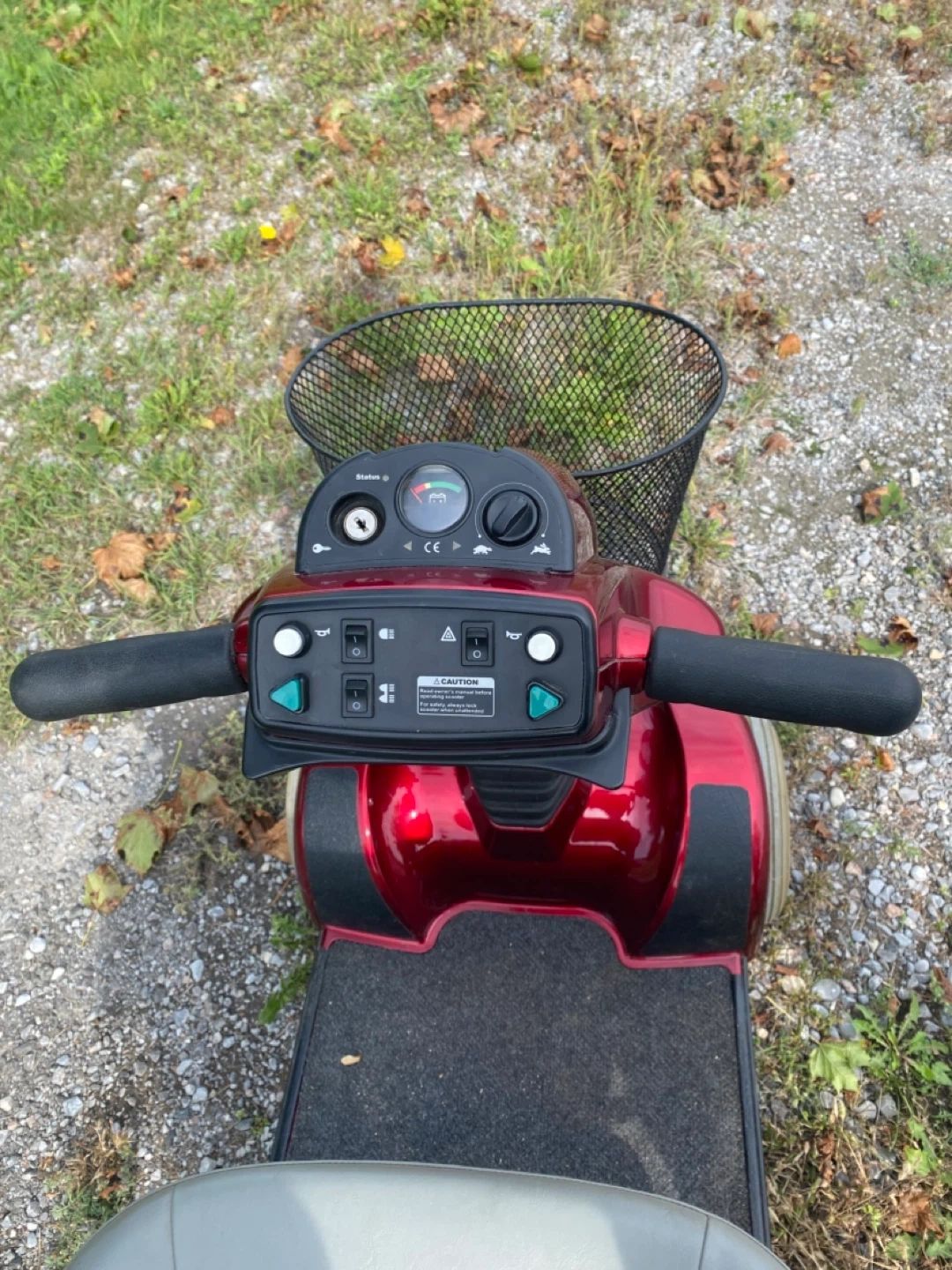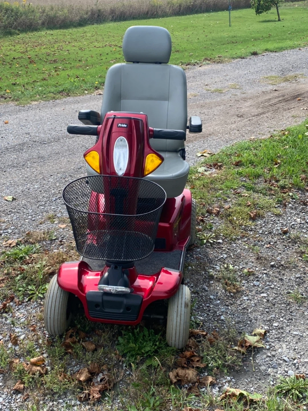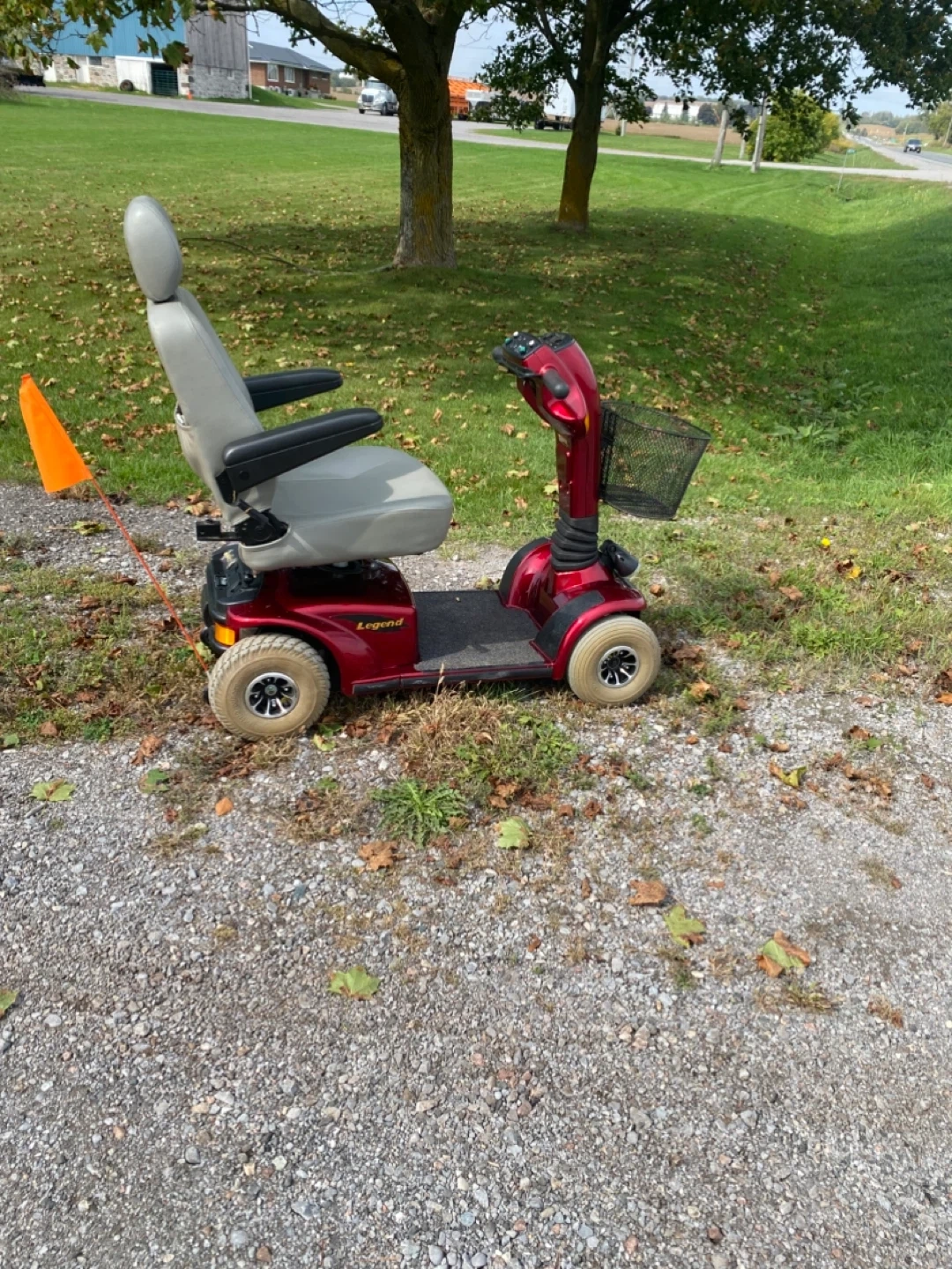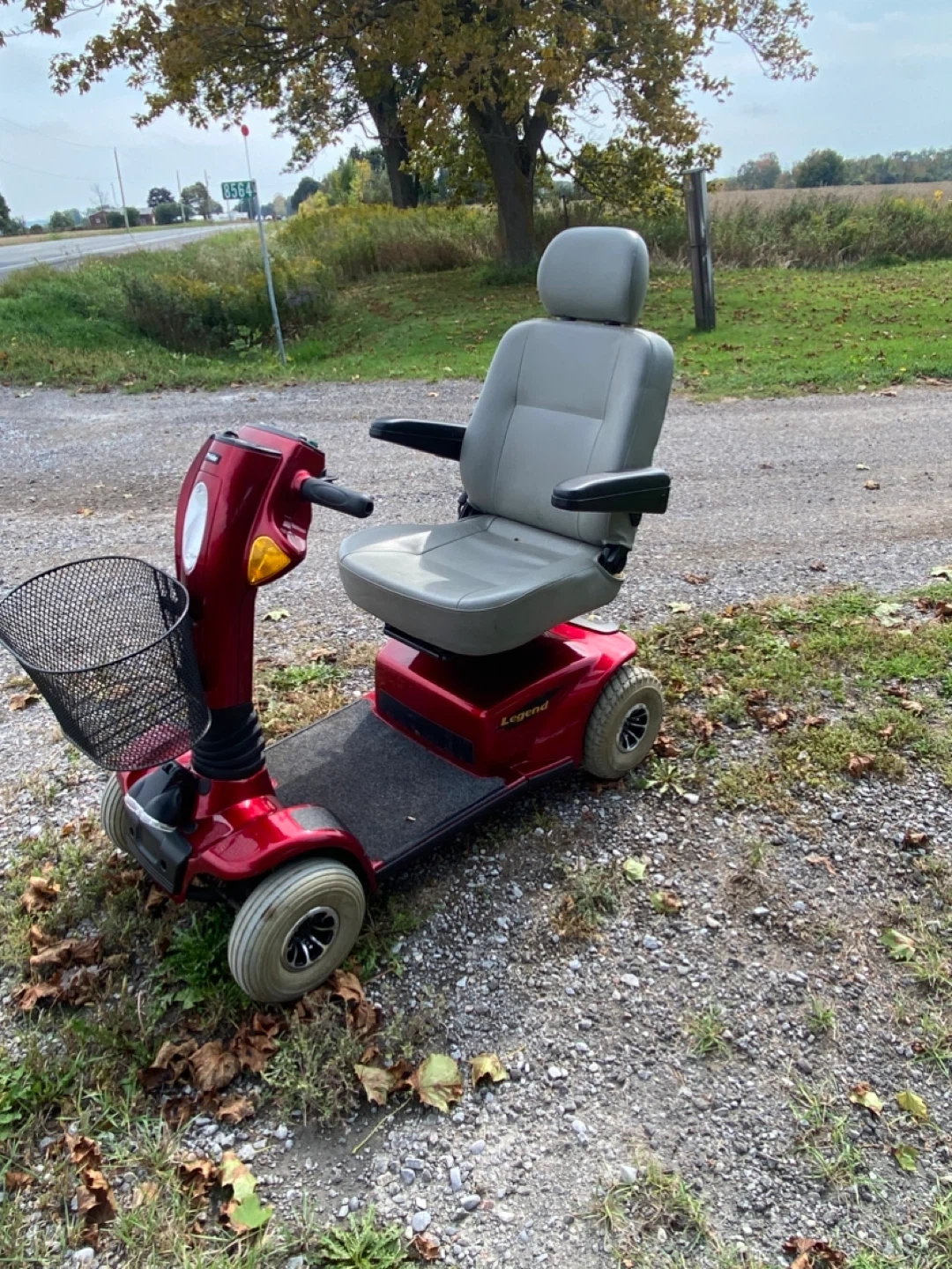 Selling a Pride Legend mobility scooter. It's in good condition and ready to go! It features a comfortable seat and a basket for carrying items. Perfect for getting around town or enjoying the outdoors