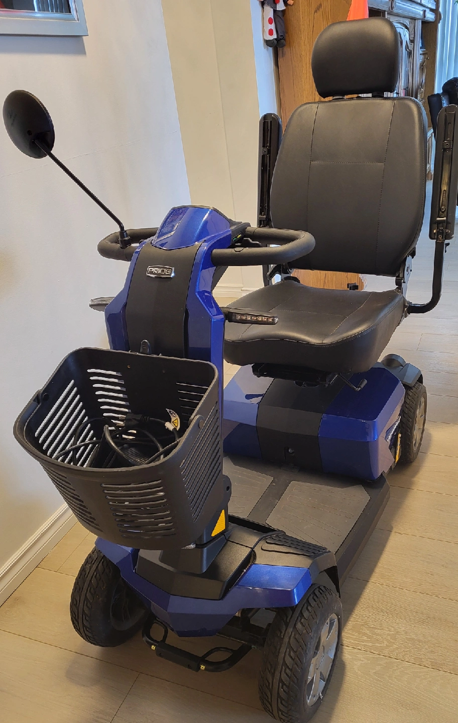 Selling a Pride mobility scooter in blue. It features a comfortable seat, a front basket for storage, and a mirror for added safety. Great for getting around!
