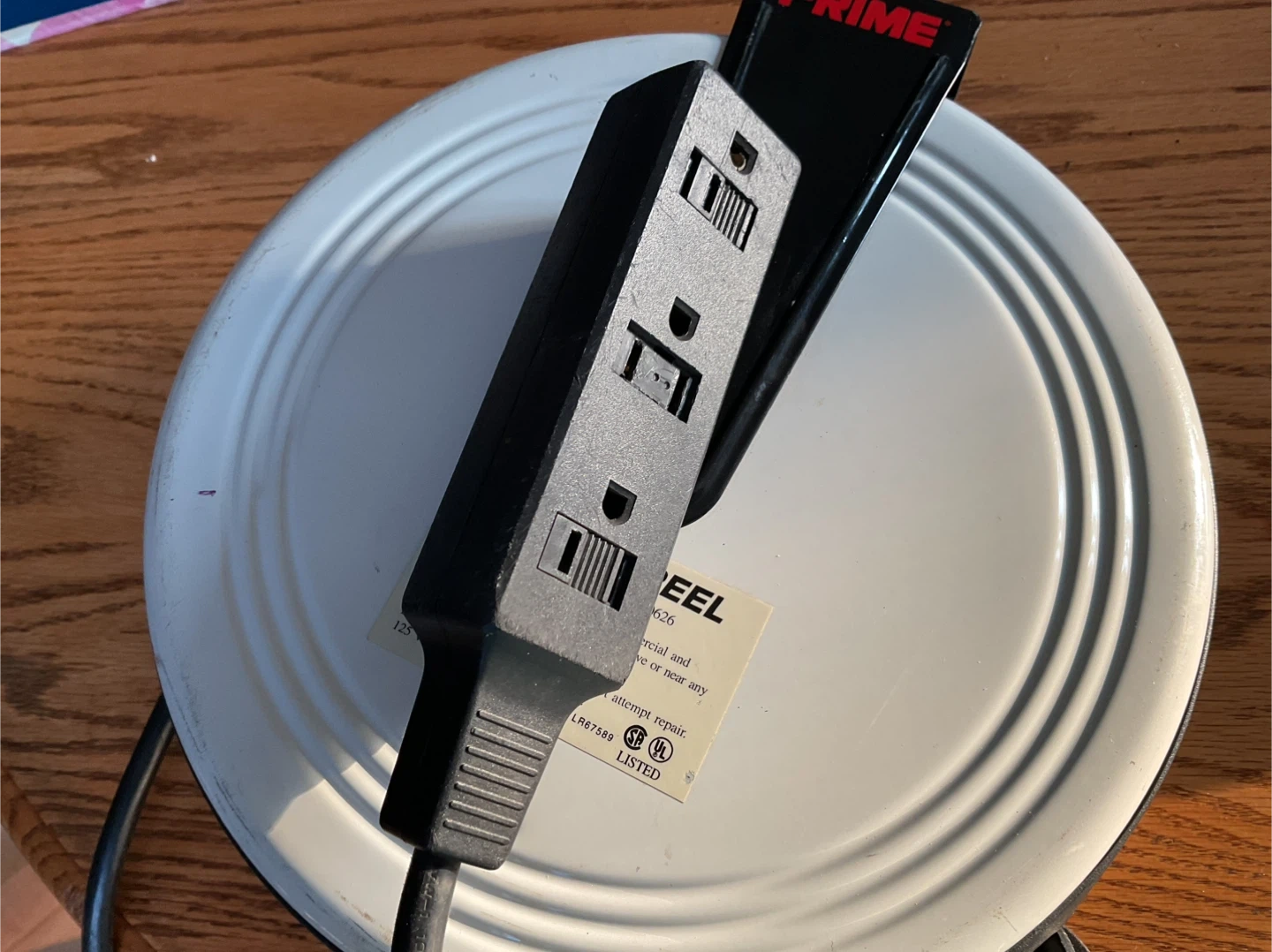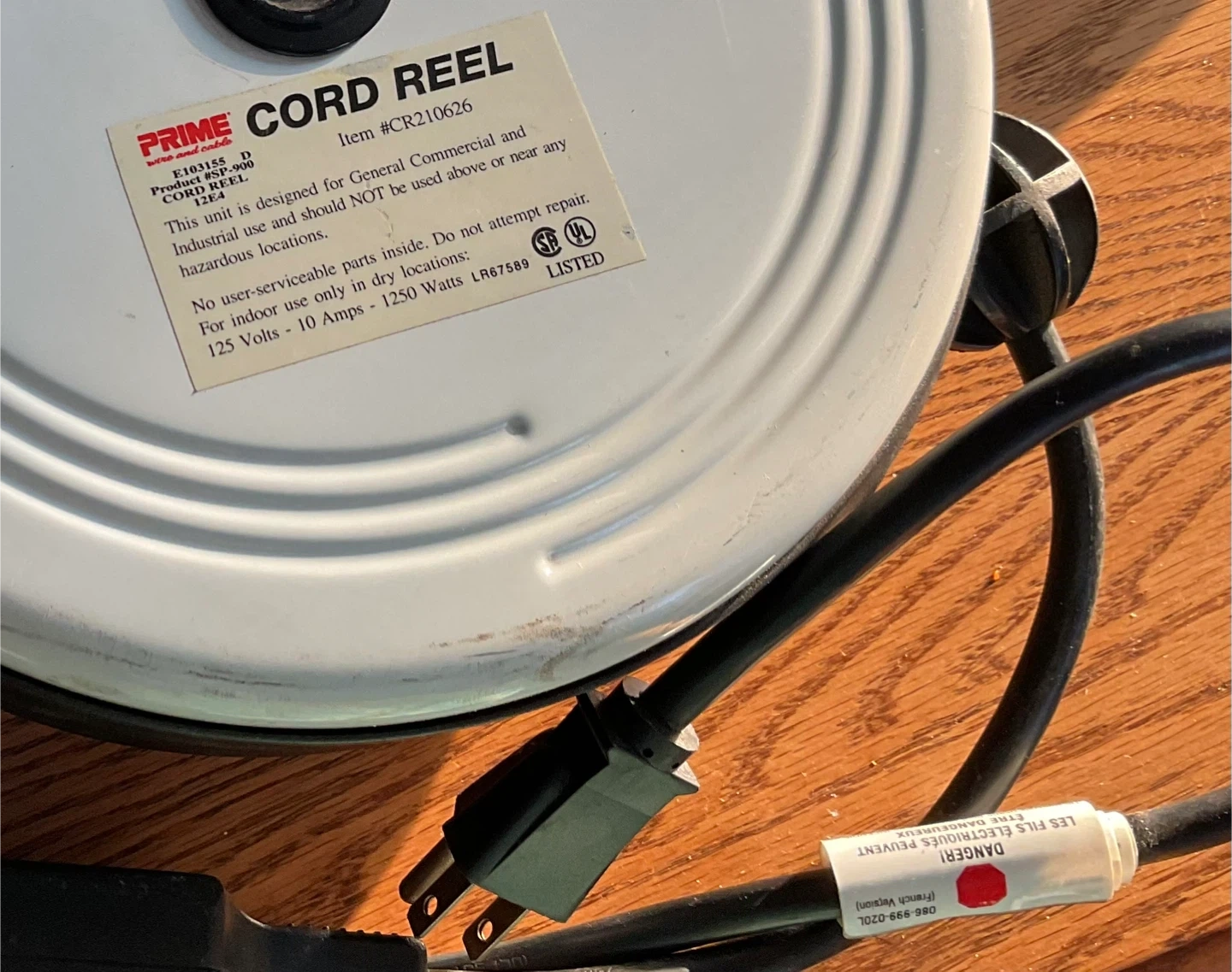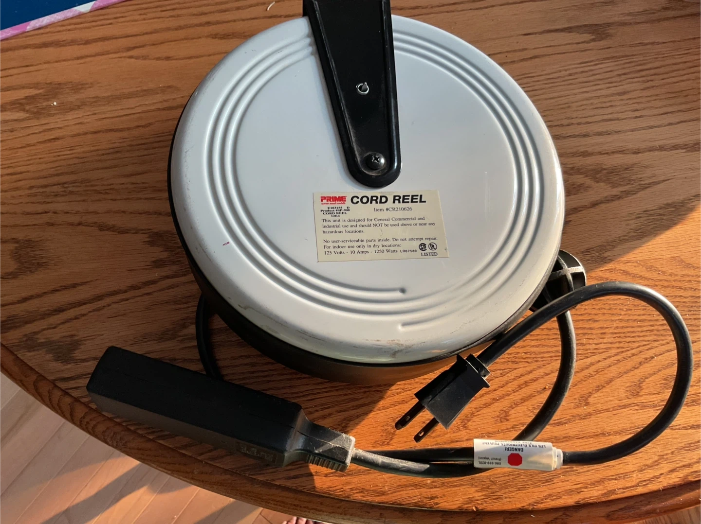 Selling a PRIME cord reel, item #CR210626. This unit is designed for general commercial and industrial use and should NOT be used above or near any hazardous locations. For indoor use only in dry locations. It operates at 125 Volts - 10 Amps - 1250 Watts