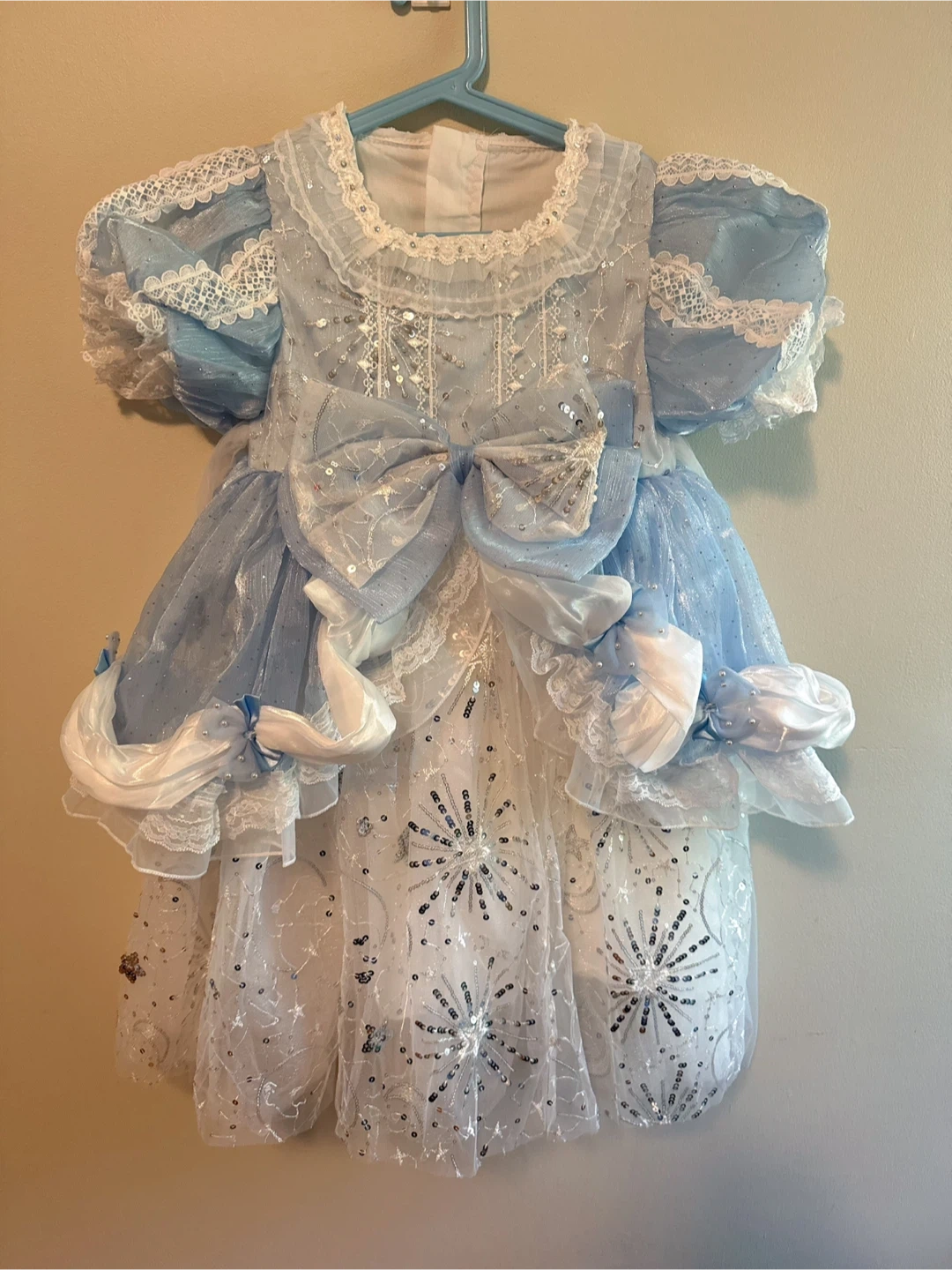 A beautiful blue and white Elsa princess dress, perfect for dress-up for Halloween season! The dress features delicate lace detailing and shimmering accents. It's in great condition and ready for a new home