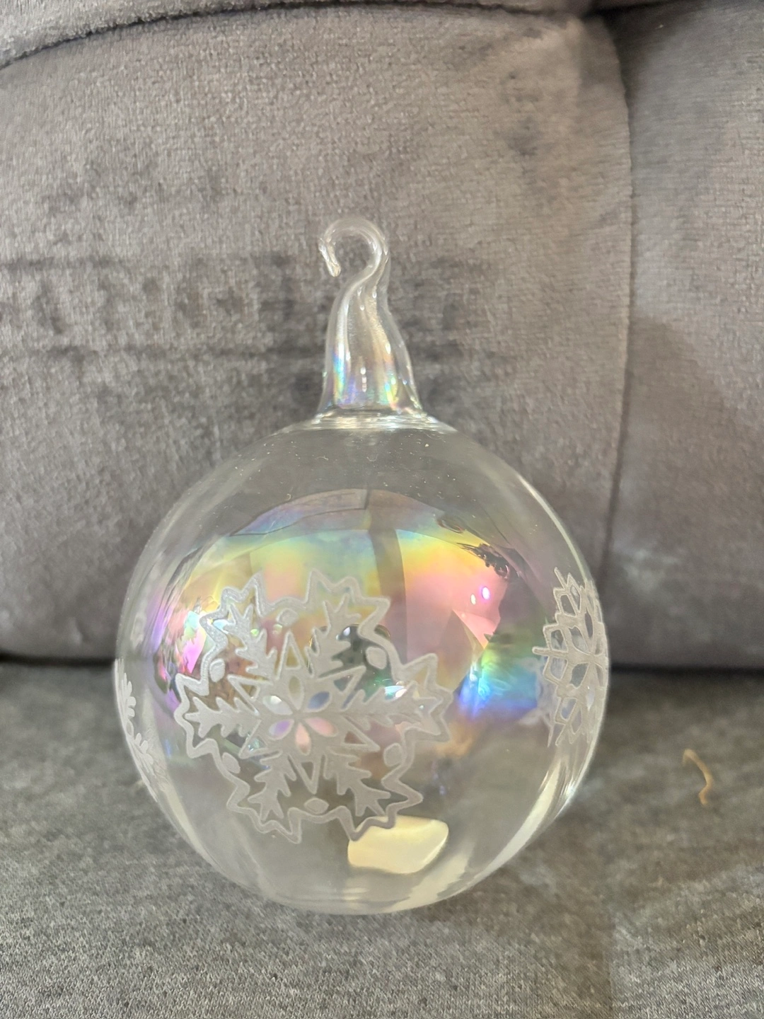 Beautiful glass Christmas ornament. Features etched snowflakes. Iridescent finish. Made in the U.S.A.