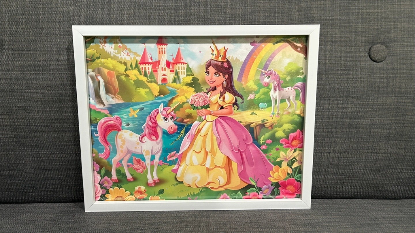A cute framed canvas art featuring a princess and unicorn scene!. Perfect for a kid's room or play area