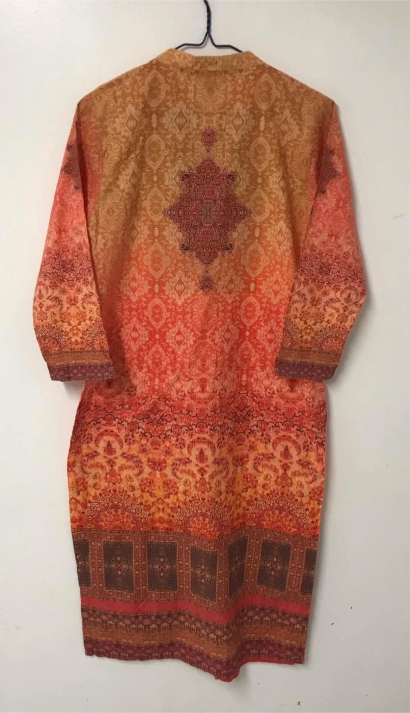 A dress with floral print. Features a mandarin collar with buttons down the front. Three-quarter sleeves. A perfect choice for a relaxed day. Brand new