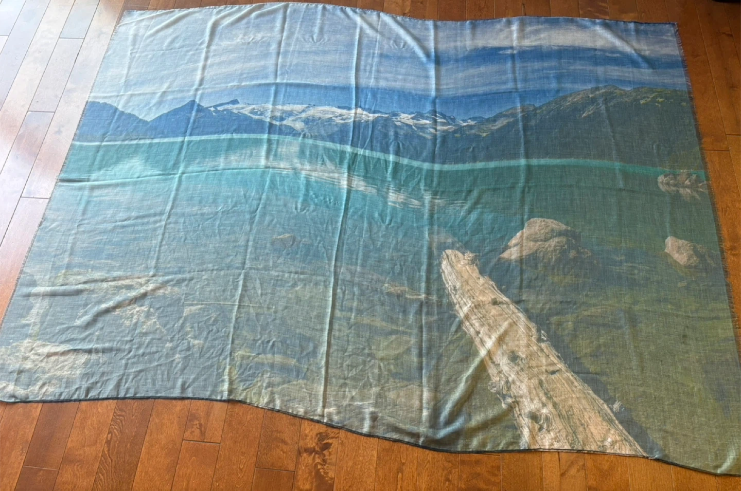 This is a beautiful scarf with a serene lake and mountain scene printed on it. It's lightweight and would be great as a decorative piece or to keep you warm on a cool day. Made in Canada