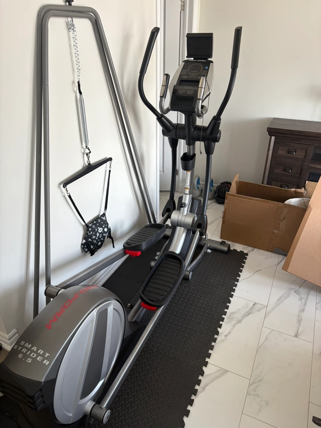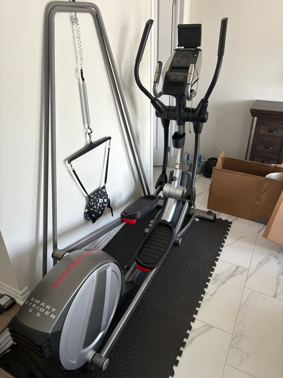 Selling my ProForm Smart Strider 6.5 elliptical — lightly used and in great working condition. Smooth, quiet, and perfect for home workouts! Features: • SpaceSaver® Design (folds for easy storage) • Built-in workout programs and resistance settings • Large LCD display to track time, distance, and calories • Comfortable oversized pedals and soft-grip handlebars • Solid, sturdy build — great for full-body cardio • Power cord included Condition: • Excellent, fully functional • Stored indoors in a clean, smoke-free home Extras: • Compact and easy to move with built-in wheels 💰 Asking Price: $300 📍 Location: Brampton - Mayfield & McLaughlin 🚗 Pickup only